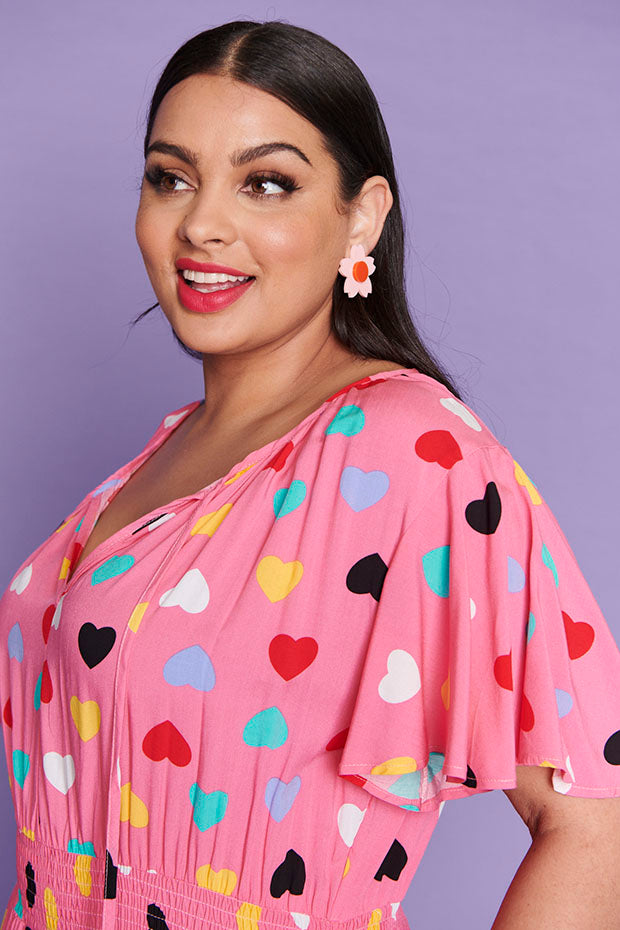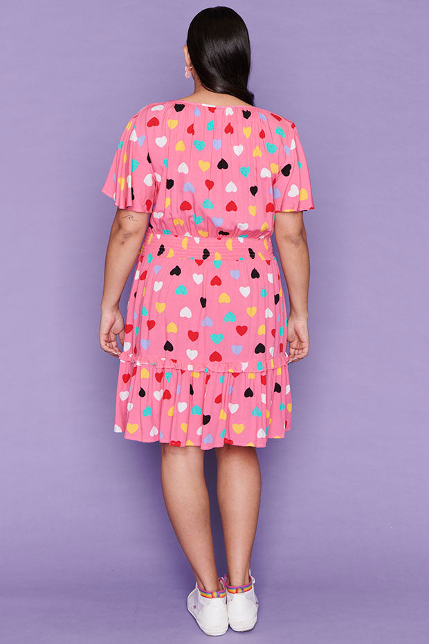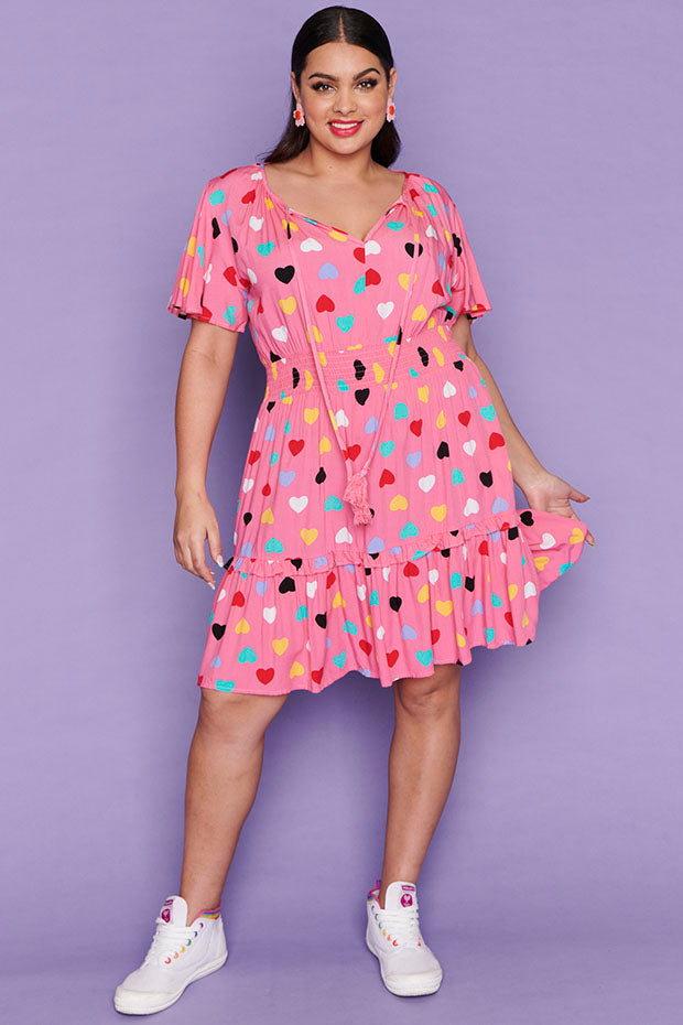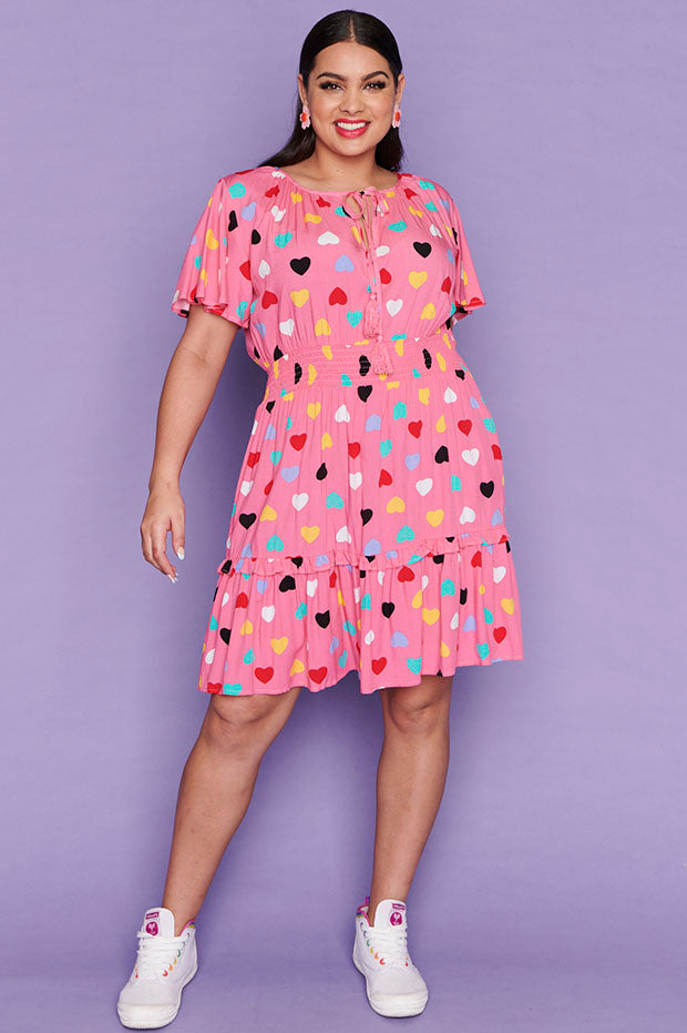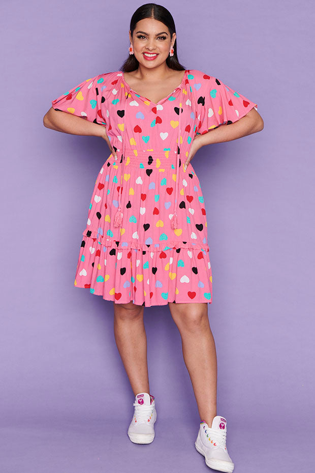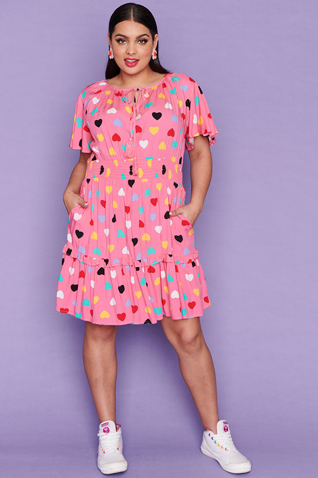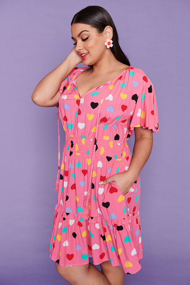 Designed with a tie-up tassled V neckline that you can leave open, or tie closed. The whole dress is a loose fit with short wide-fit sleeves, featuring an elastic shirred waist AND hidden side pockets!