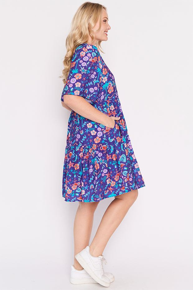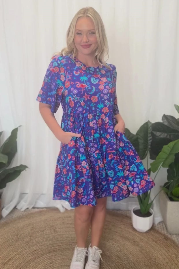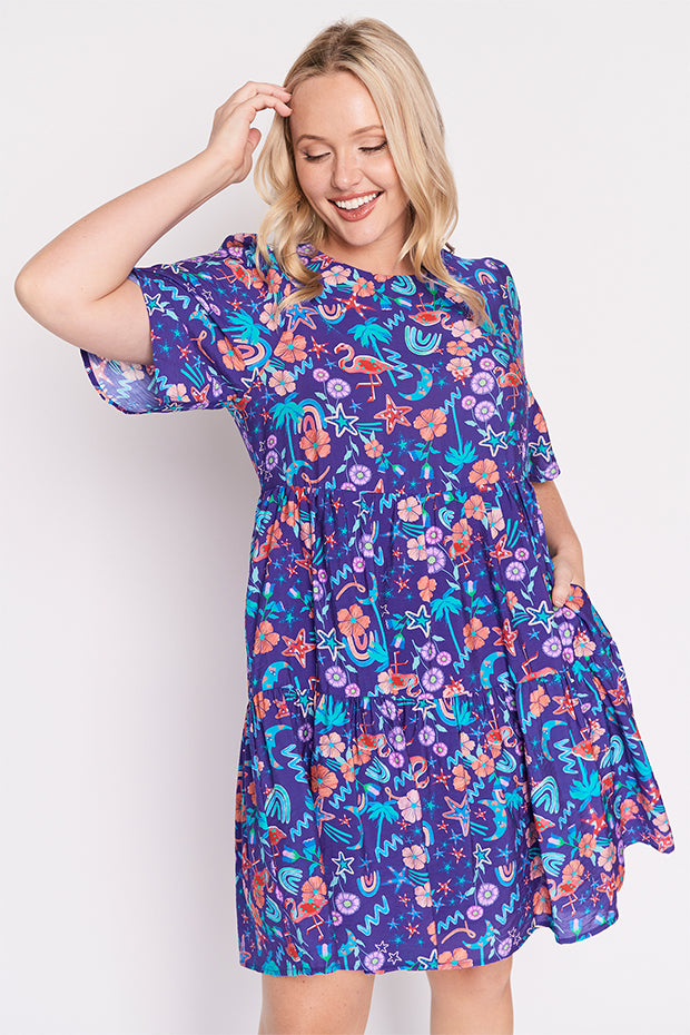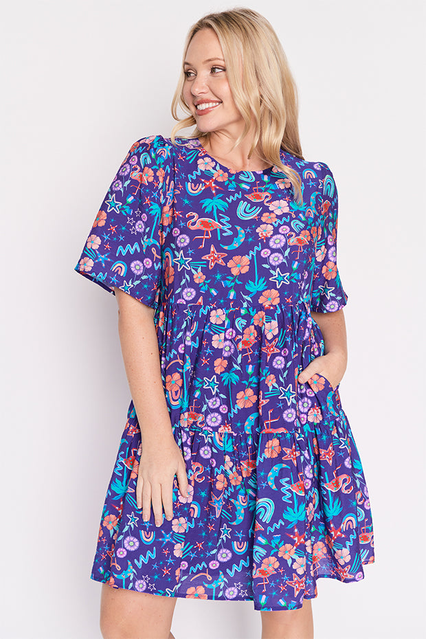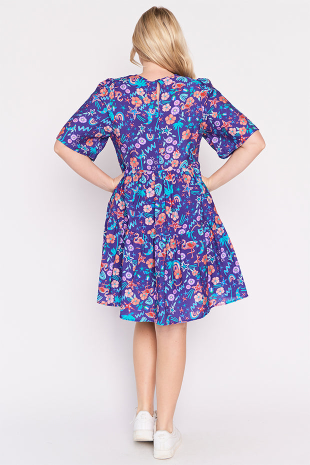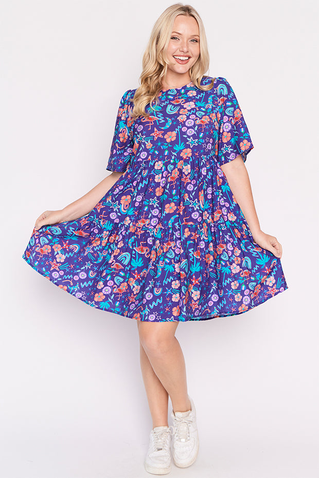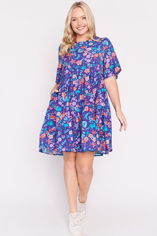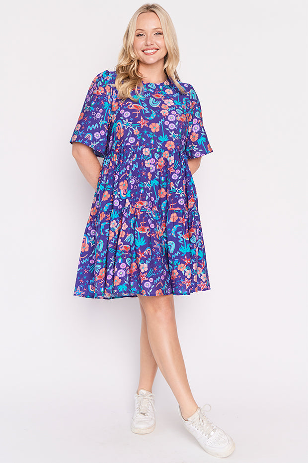 This light weight viscose blend dress features a high neckline with short puff statement sleeves to add some edge to this timeless piece! Featuring a lined skirt, babydoll tiered style silhouette with a generous loose body & hidden pockets on the sides.