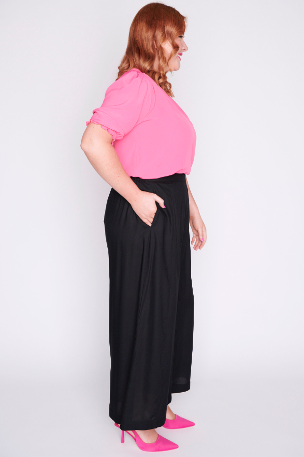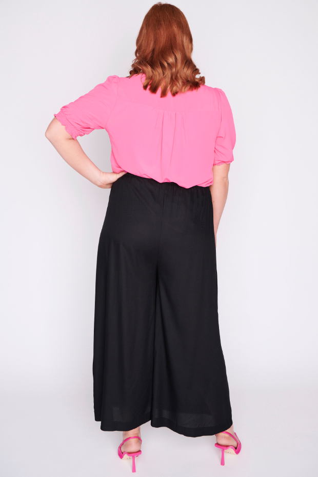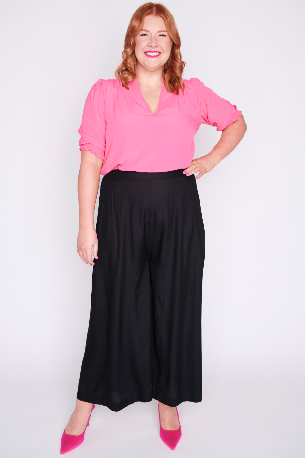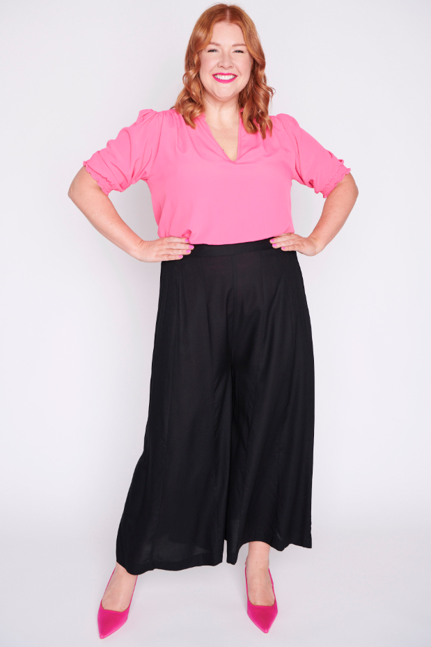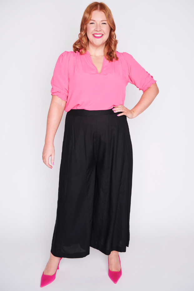 They feature a high-waistband, with an elastic back (yay comfort!) with hidden POCKETS on the sides! They fall very loosely down your lower half, cascading into an oversized wide-leg flare, they could be mistaken for a skirt!