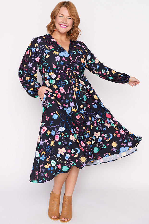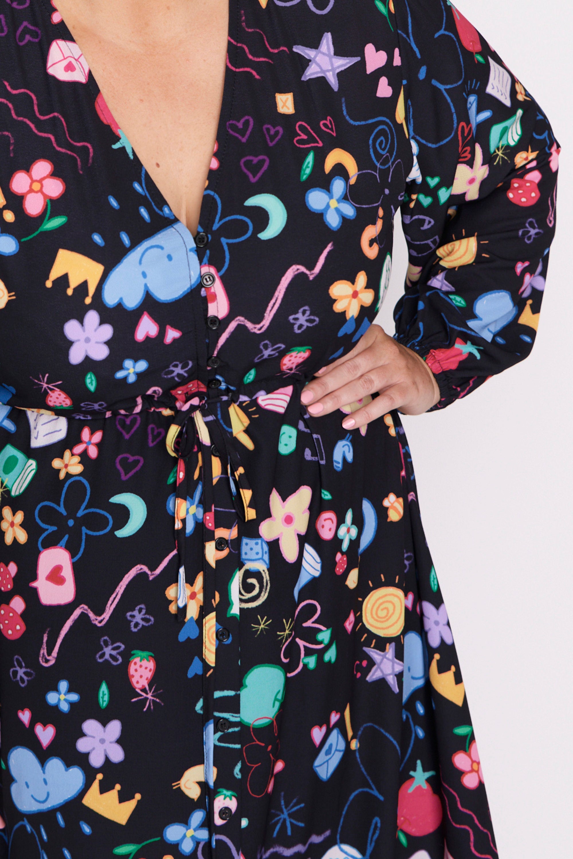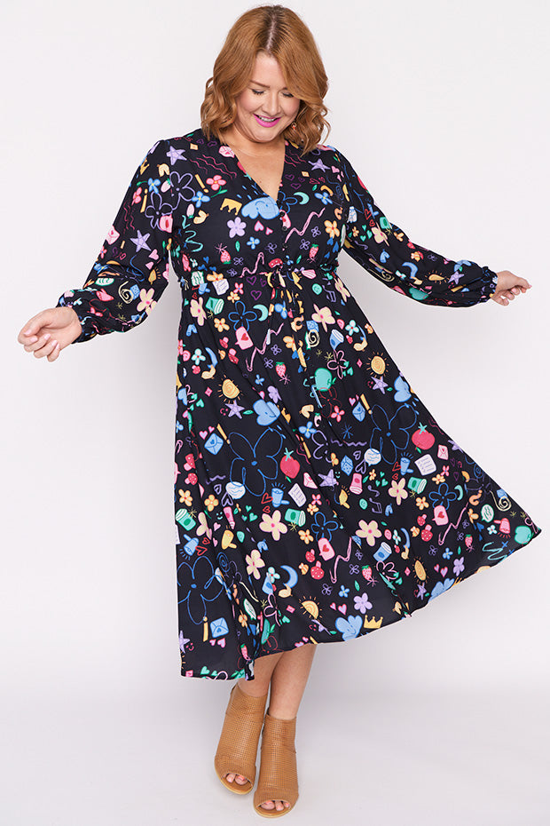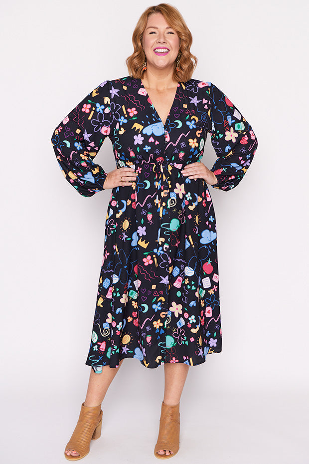 It features a looseĀ bodice withĀ long wide sleeves with a cuff &Ā a button up raised V-neckline.Ā We love theĀ comfy drawstringĀ waistĀ with a linedĀ full skirt, mid-calf length with side pockets creating a feminine vintageĀ silhouette and that perfect twirly skirt!