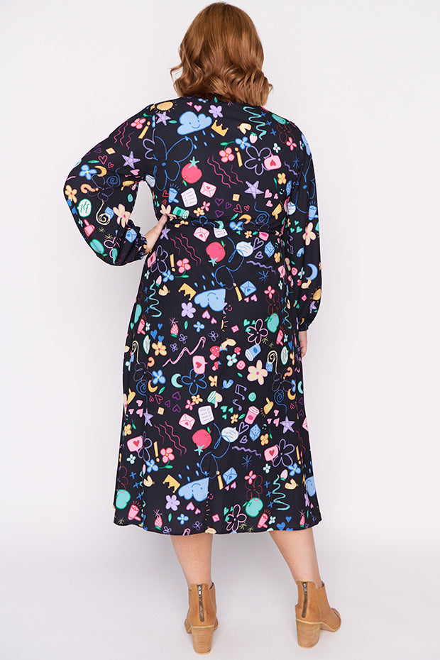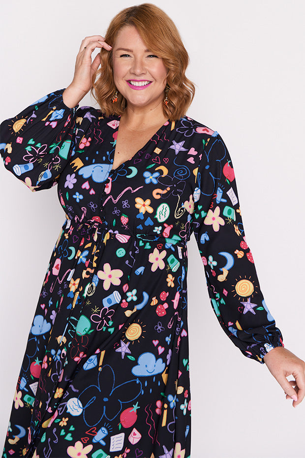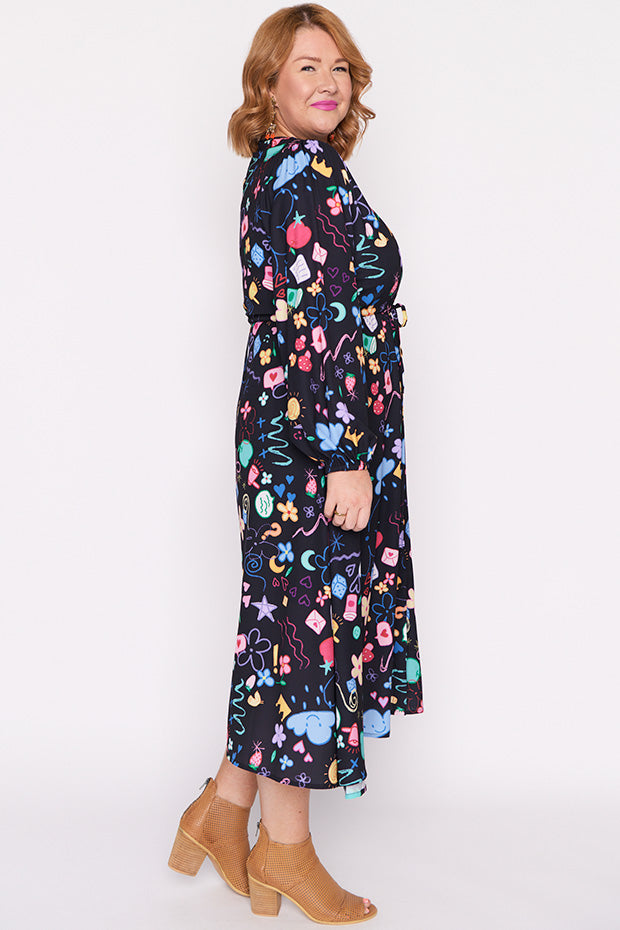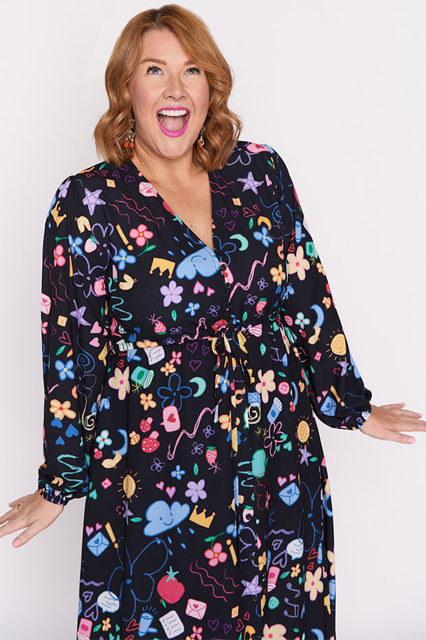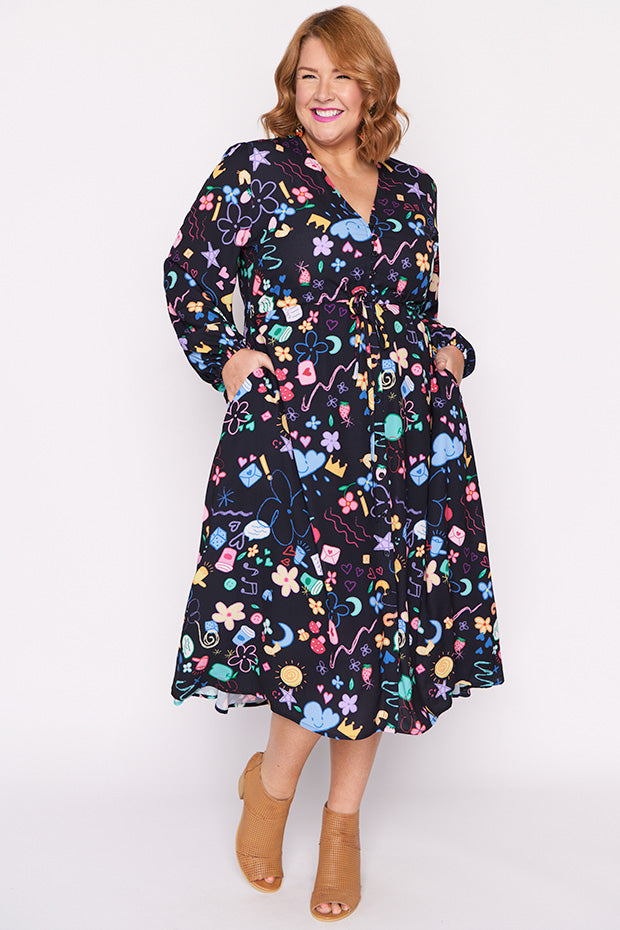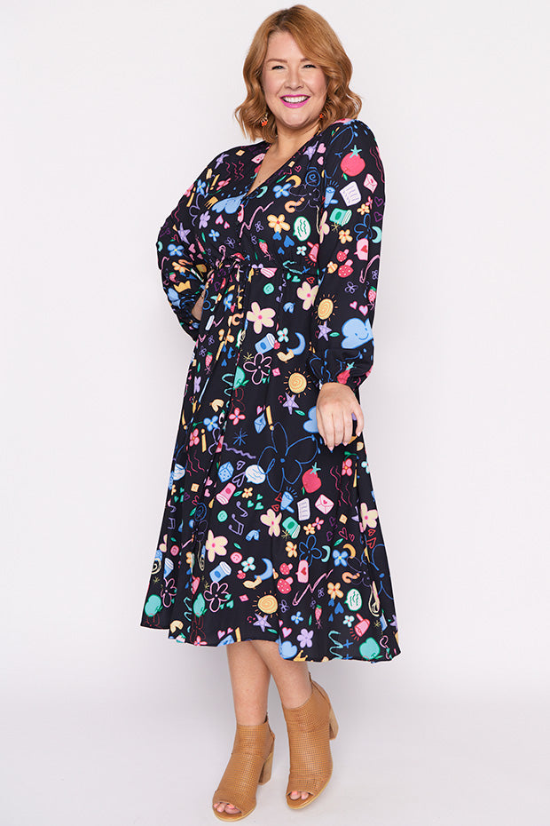 It features a looseĀ bodice withĀ long wide sleeves with a cuff &Ā a button up raised V-neckline.Ā We love theĀ comfy drawstringĀ waistĀ with a linedĀ full skirt, mid-calf length with side pockets creating a feminine vintageĀ silhouette and that perfect twirly skirt!