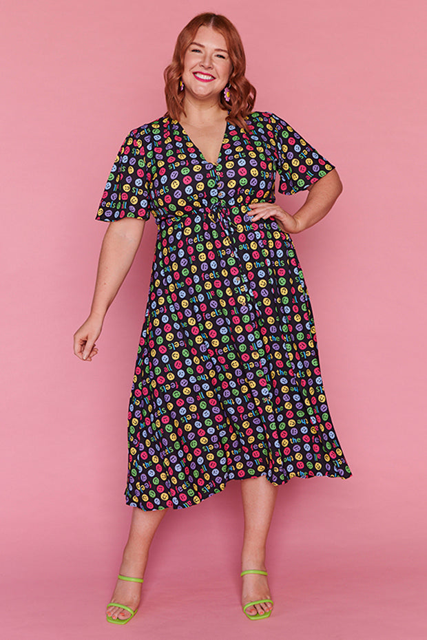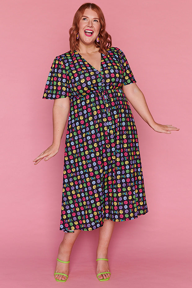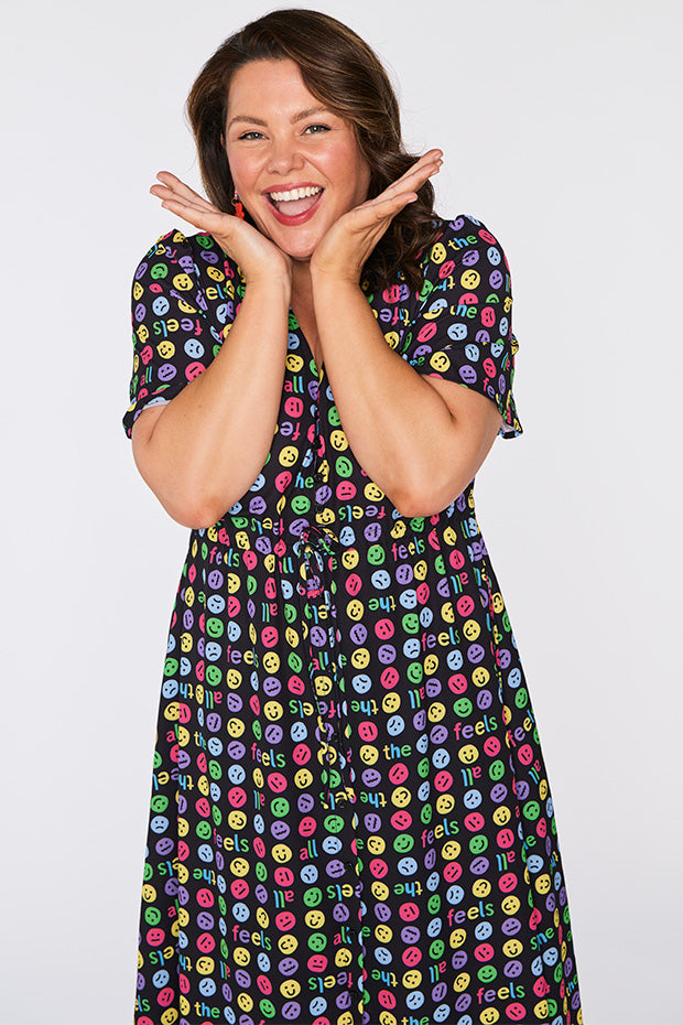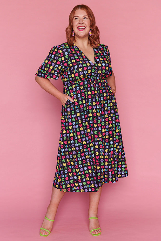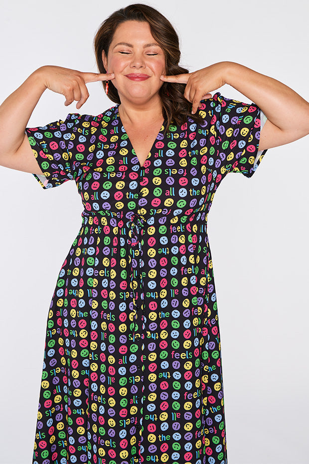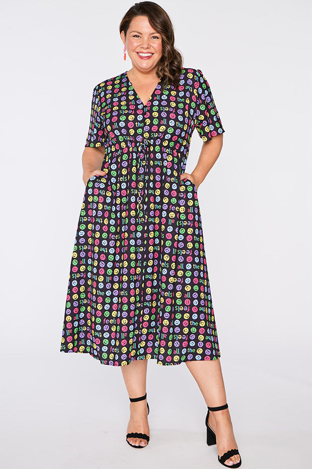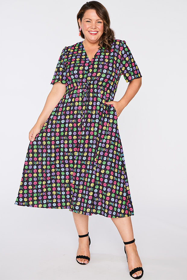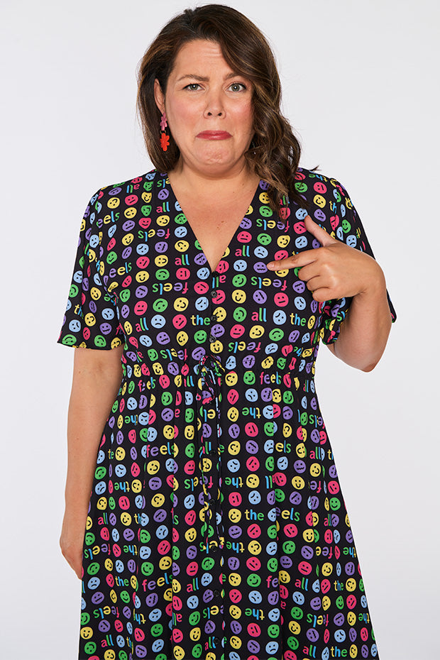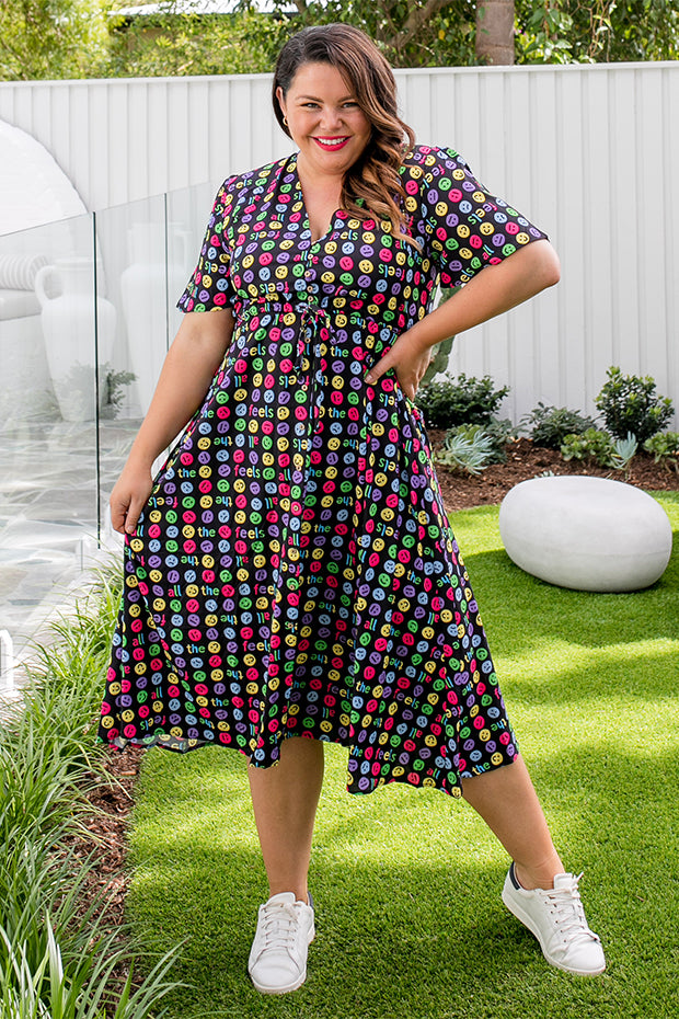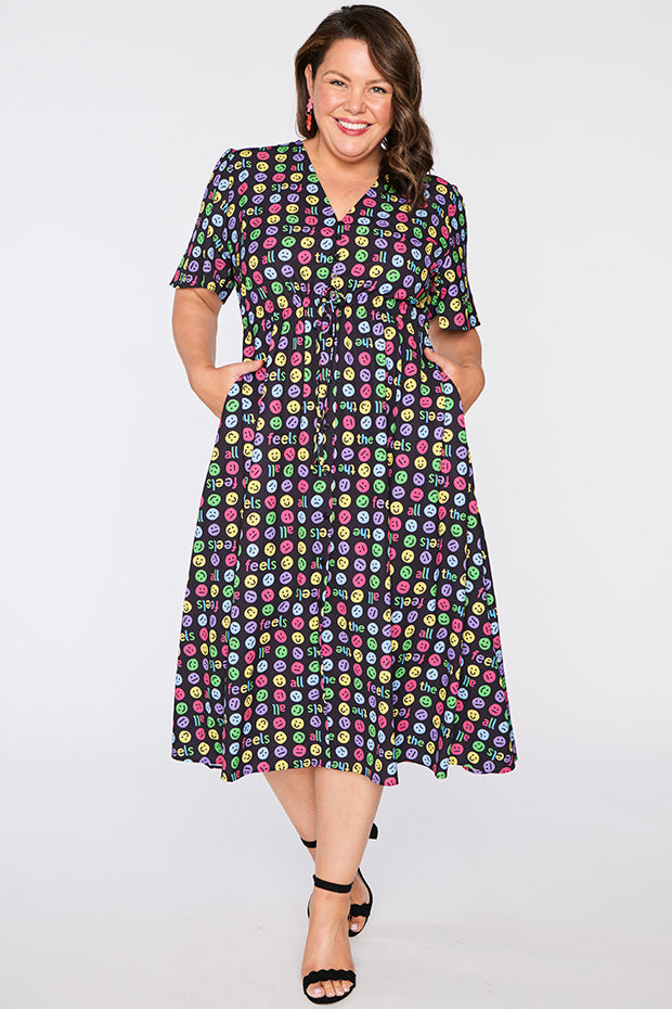 I love the emojis on this dress. It was a conversation starter and I received many comments when wearing it. Nice bright and lightweight style. The only downside is that itās polyester which makes me hot and sweaty in hot weather.