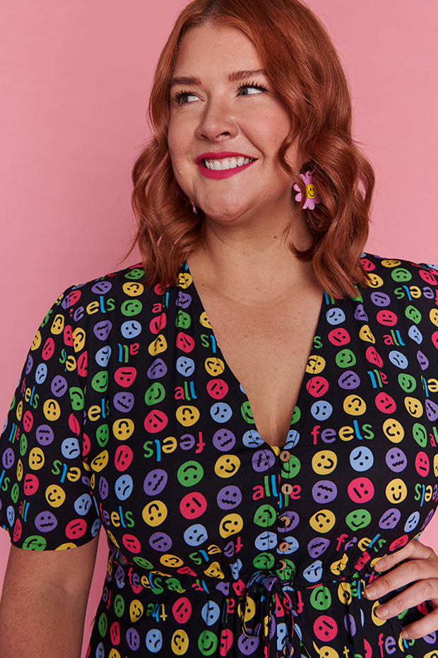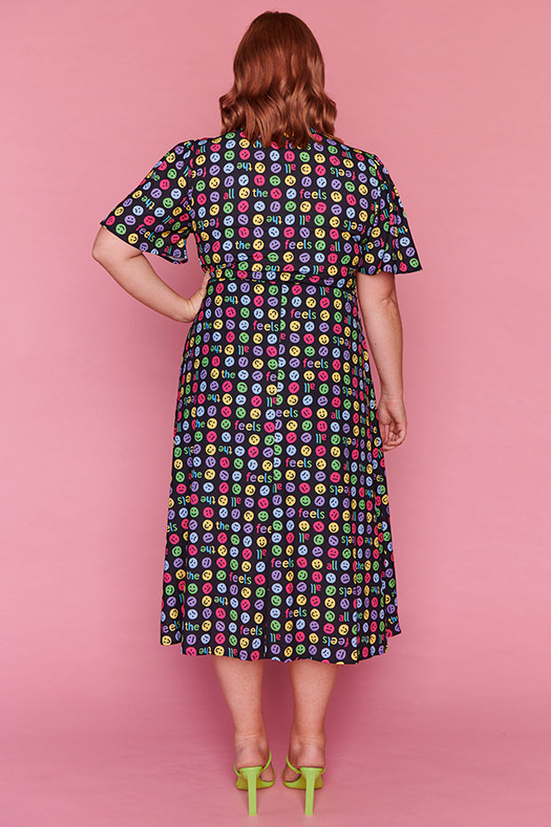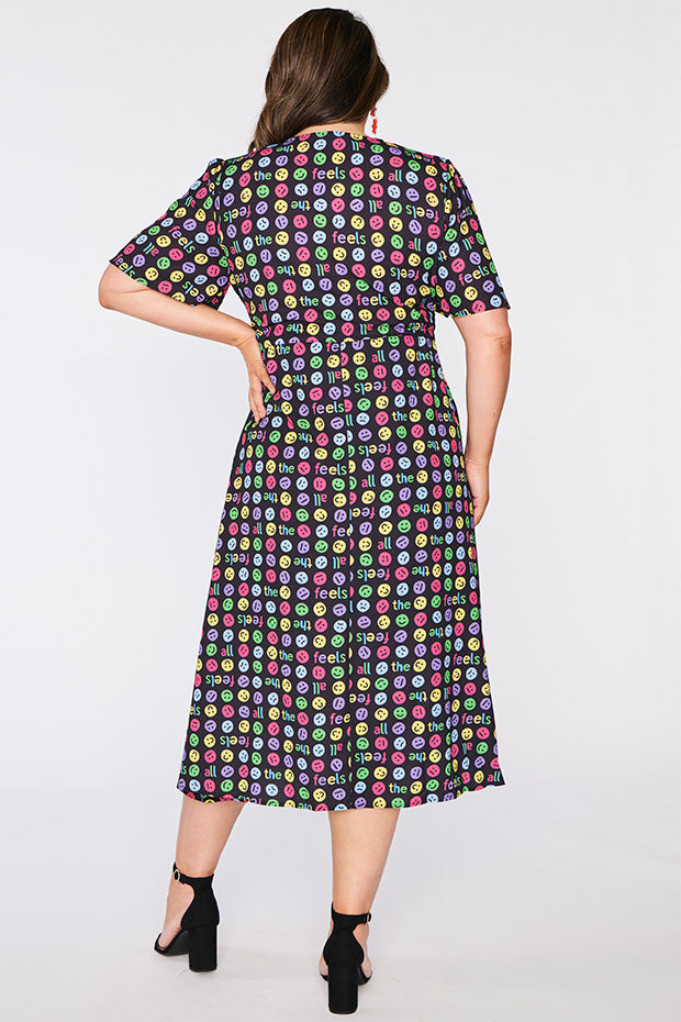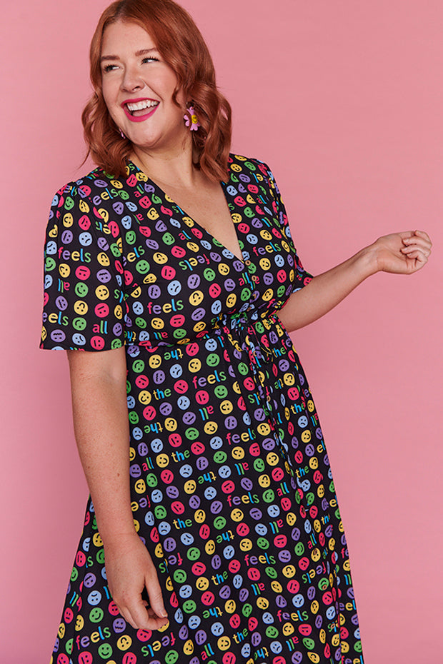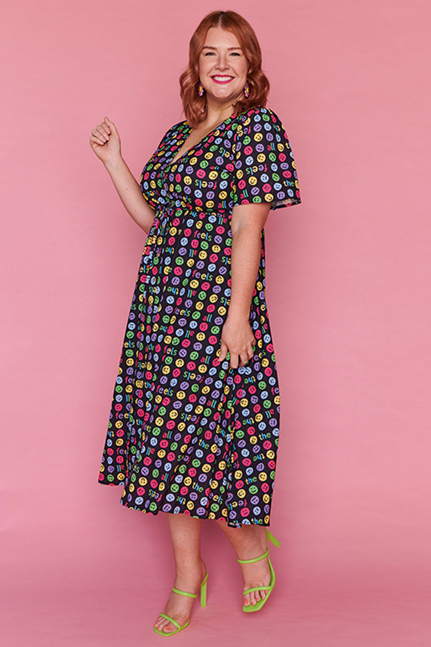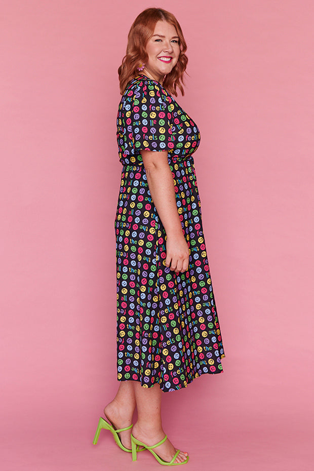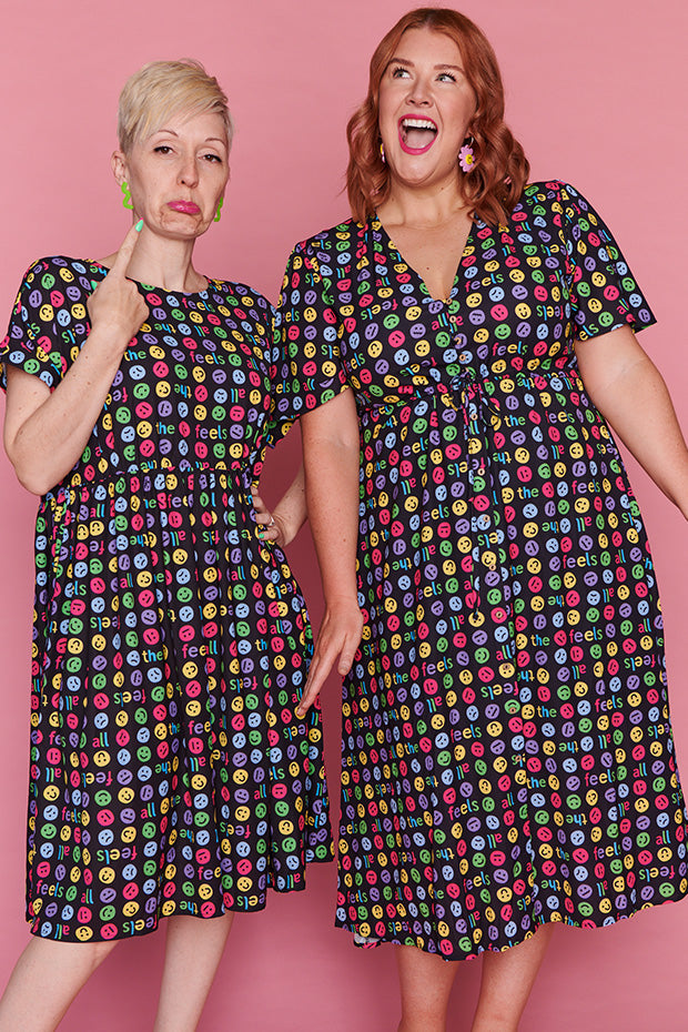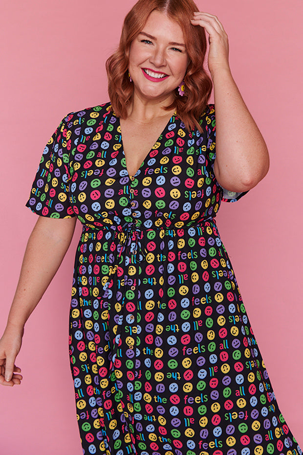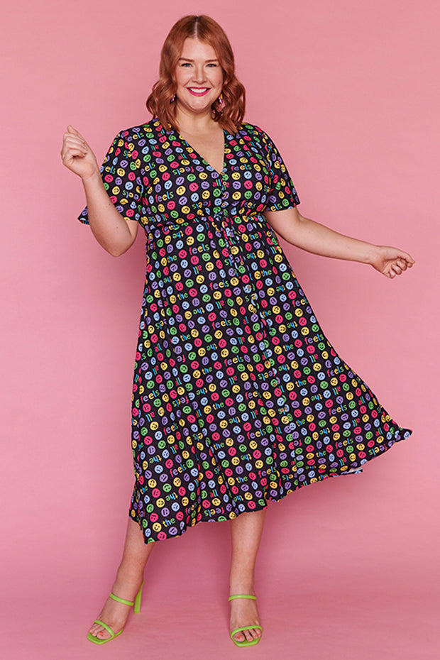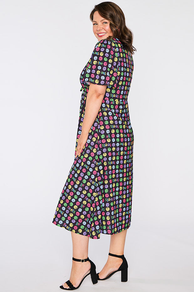 I love the emojis on this dress. It was a conversation starter and I received many comments when wearing it. Nice bright and lightweight style. The only downside is that itās polyester which makes me hot and sweaty in hot weather.