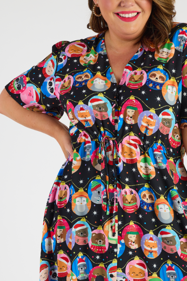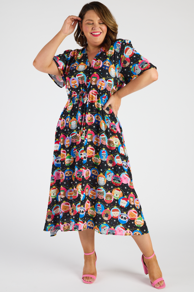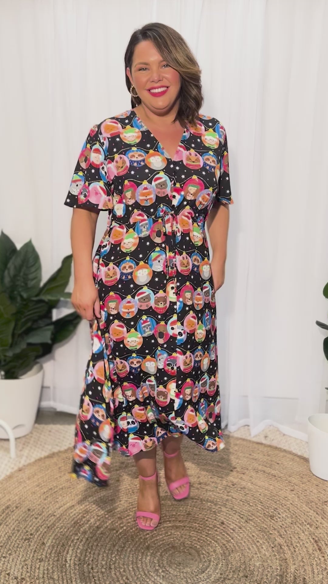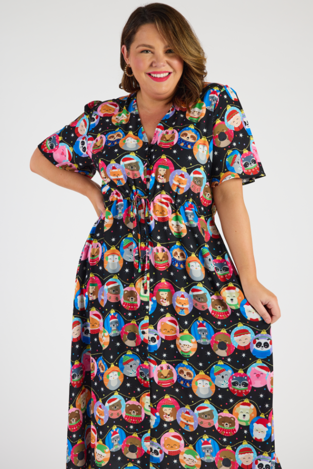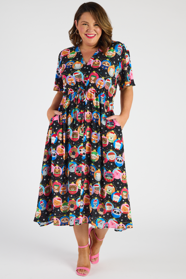 Gorgeous colourful and fun Christmas dress. Marley style is comfortable and the under bust drawstring is great for making the dress more loose or form fitting.