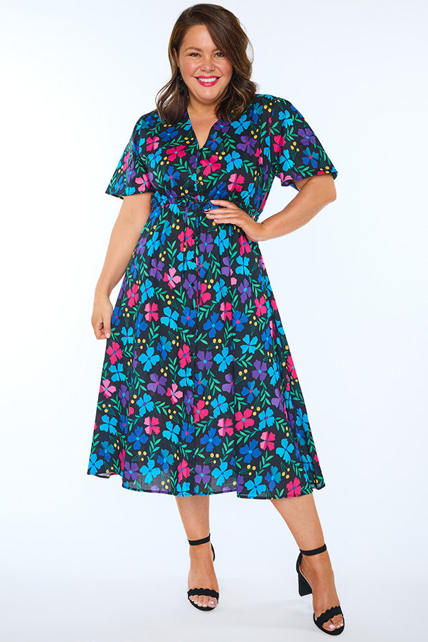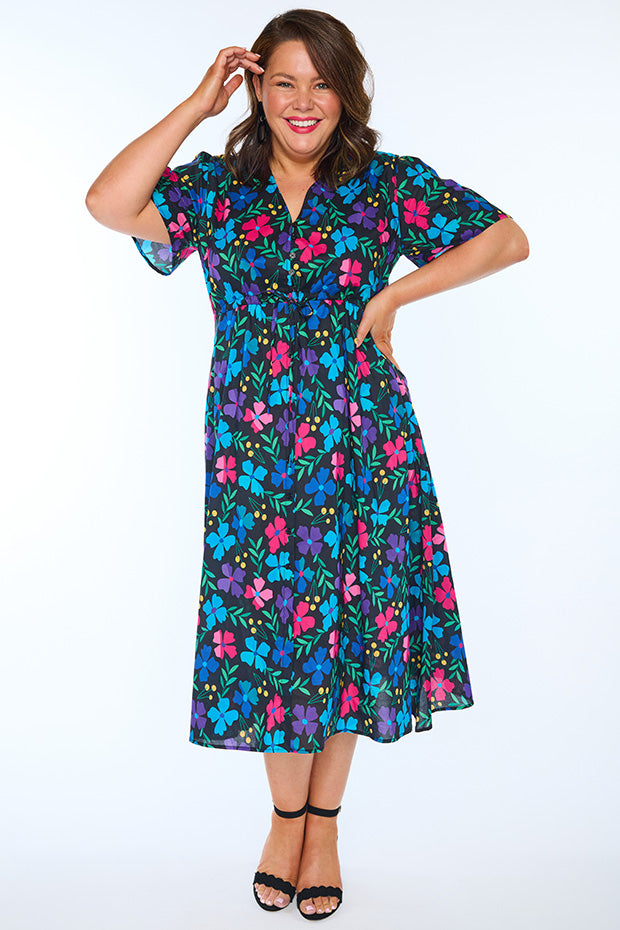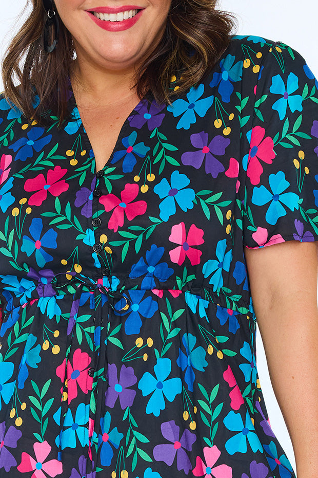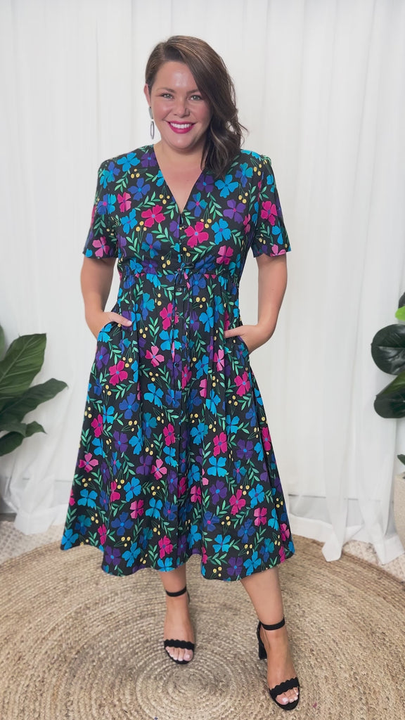 Constructed with a lightweight 100% cotton fabrication, she features a loose bodice, with short wide sleeves & a button up V-neckline. We love the comfy drawstring waist, with a full skirt, mid-calf length with side pockets creating a feminine vintage silhouette and that perfect twirly skirt!