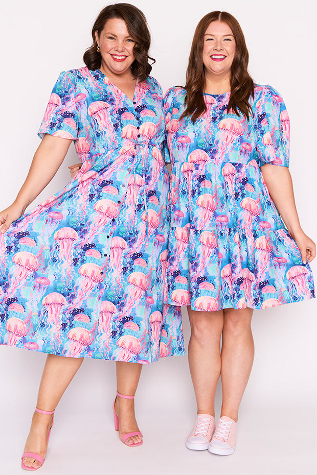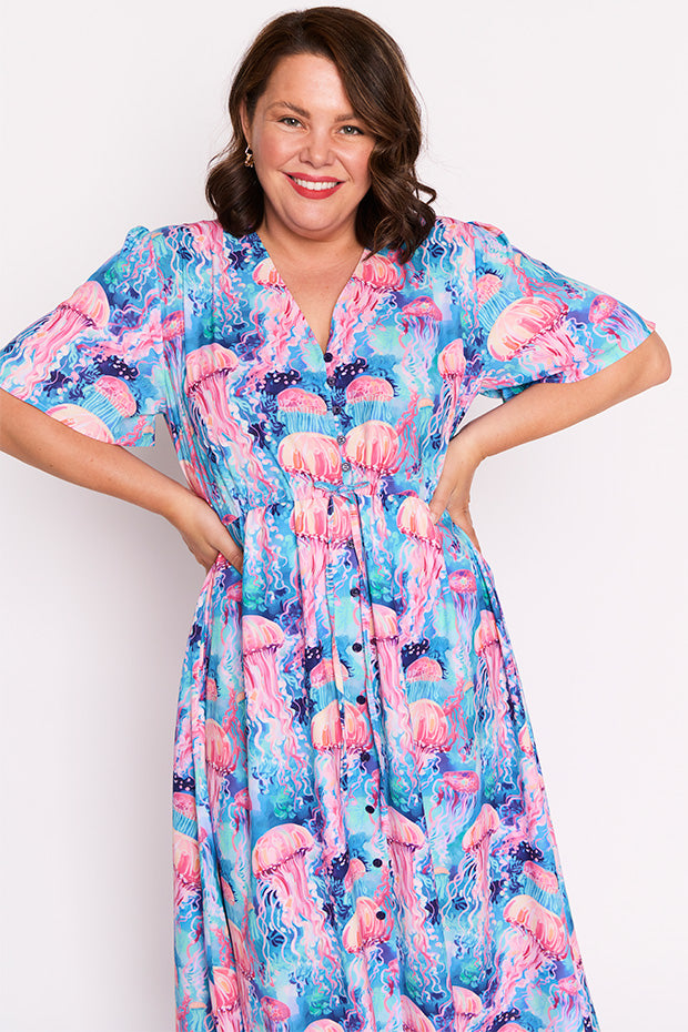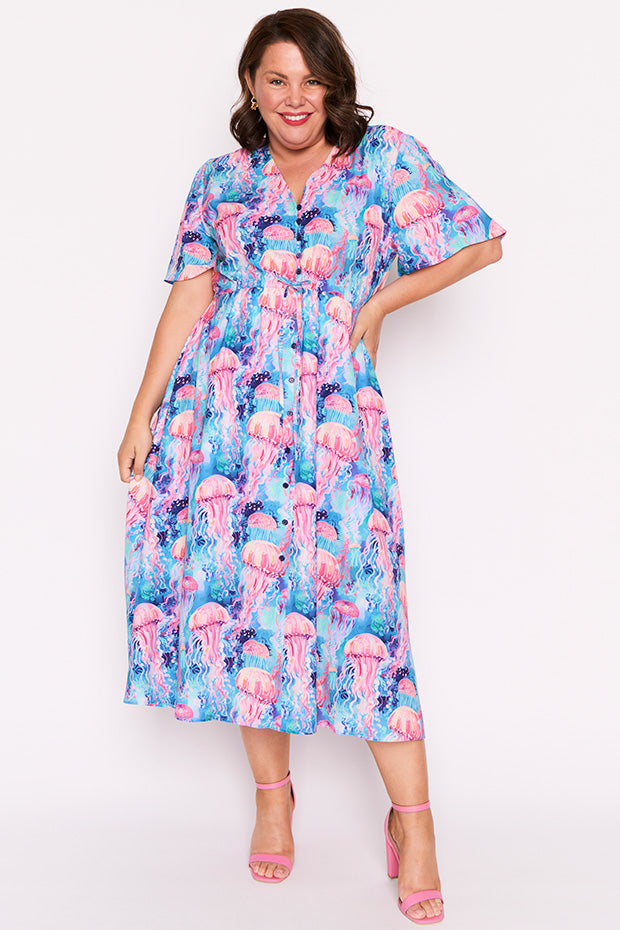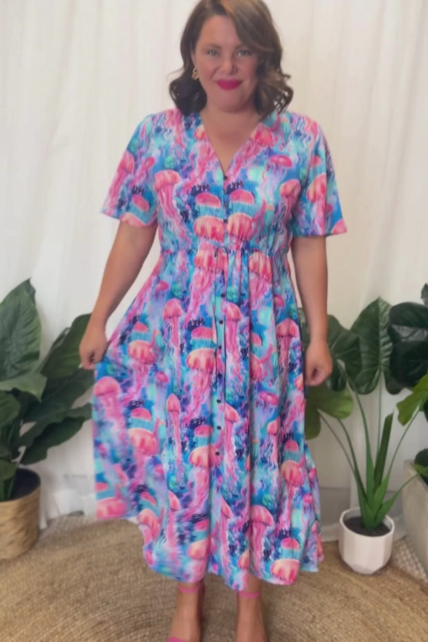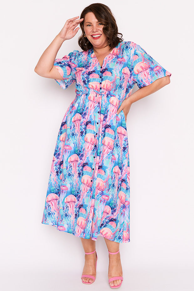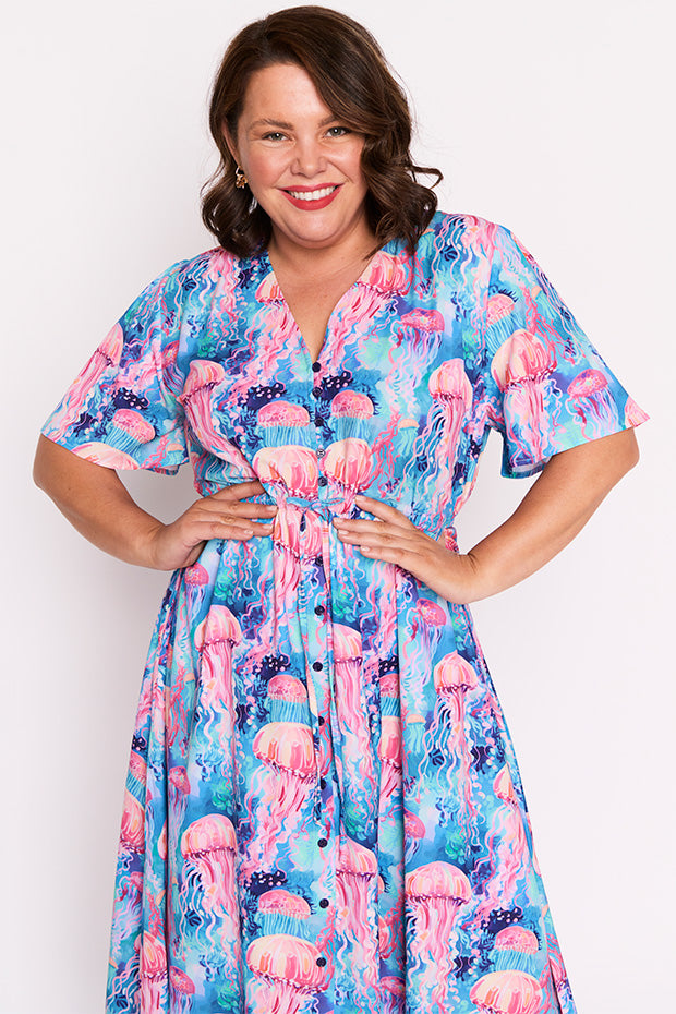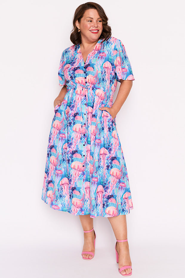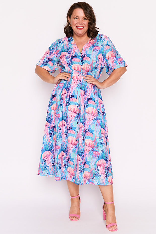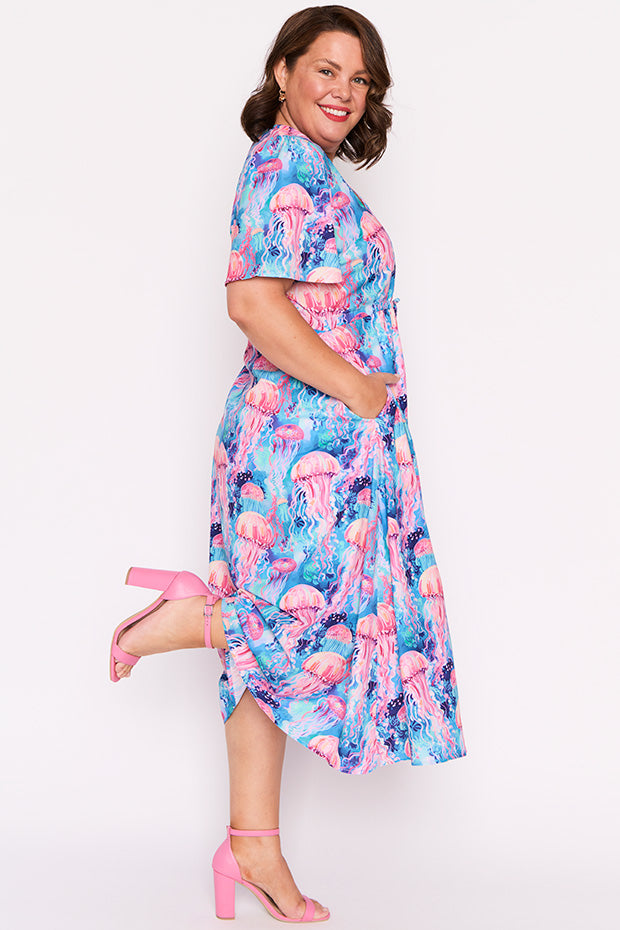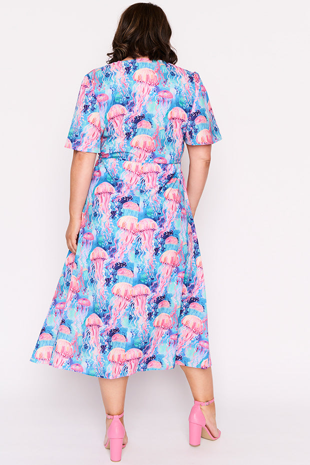 A great dress with wonderful colours. Polyester makes me feel a bit hot so this will be perfect on cooler days. Nice to wear. Neckline is excellent with a modest plunge which makes it perfect for work.