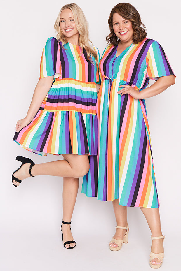 Bold and full of vintage flair, this Marley Dress features our retro Kelly Stripe print that brings instant joy and color to your look, exclusively designed by our very own Kim from Zonkt®. Perfect for festivals, weekend adventures, or anytime you want to channel nostalgic, feel-good vibes.