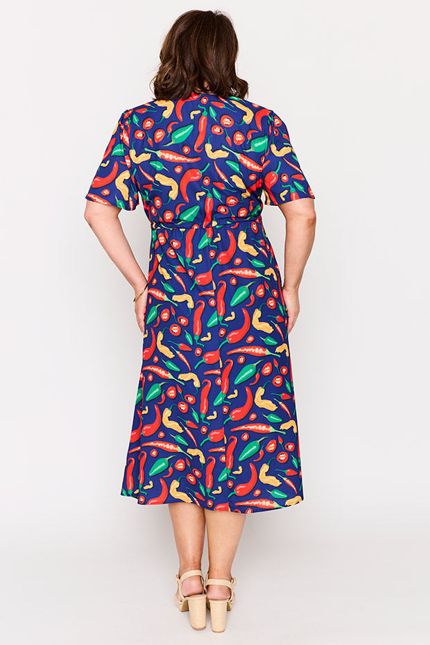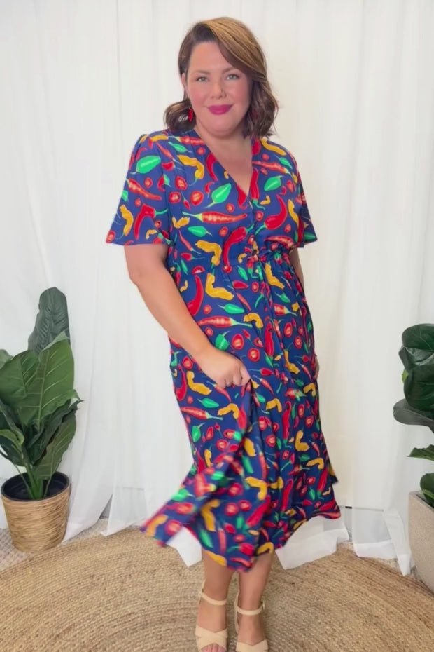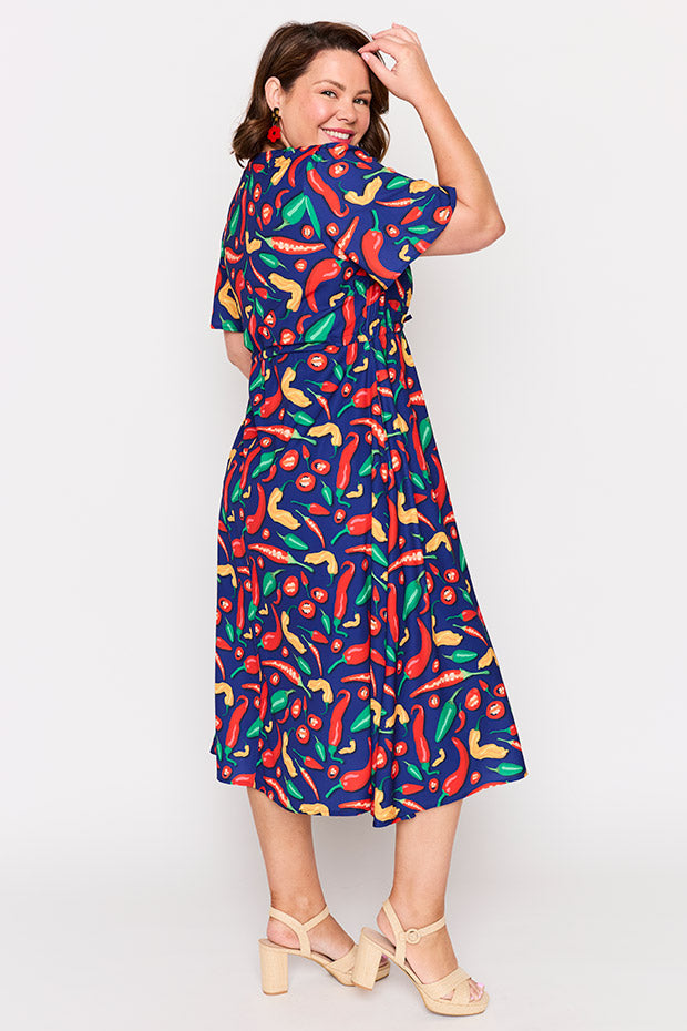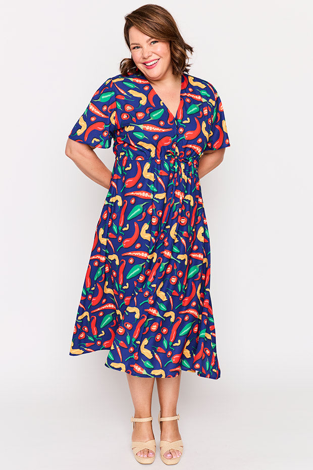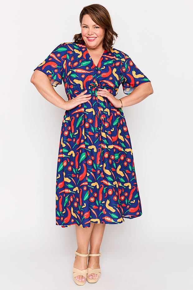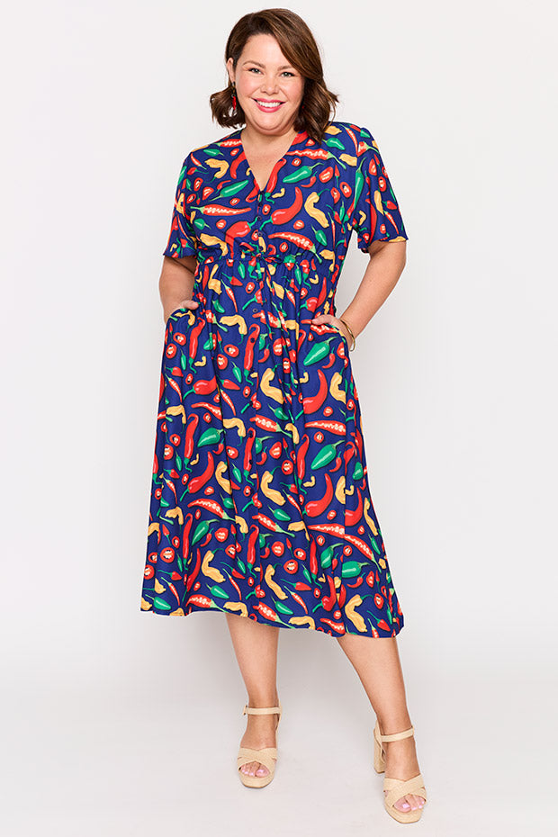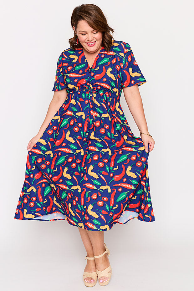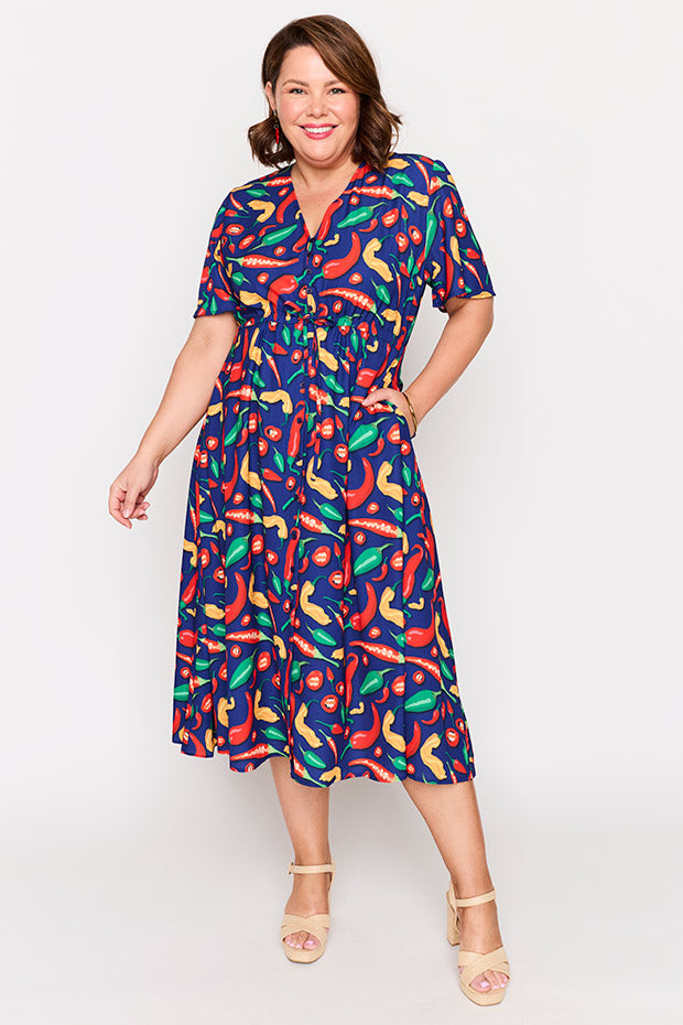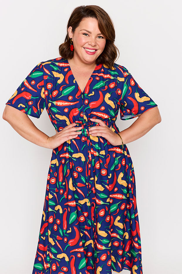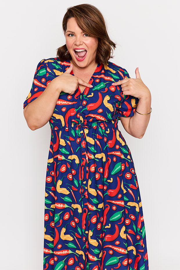 Turn up the heat in our Marley Dress featuring our sizzling Navy Hot Chilli print, exclusively designed by the ever talented Bec Woodland Artist. This fiery frock brings a bold pop of spice and fun prints to your wardrobe. Get ready to ignite your summer dress style and spice up your day with this eye-catching statement piece!