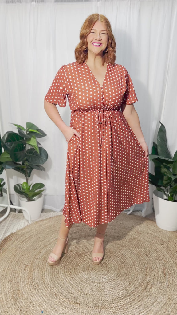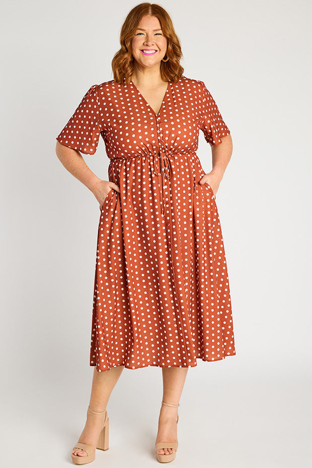 It features a loose bodice, with short wide sleeves & a button up V-neckline. We love the comfy drawstring waist, with a full lined skirt, mid-calf length with side pockets creating a feminine vintage silhouette and that perfect twirly skirt!