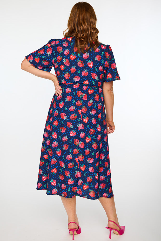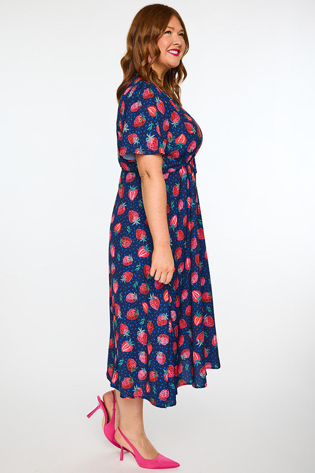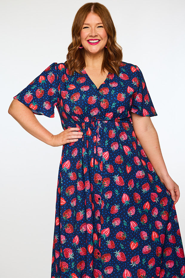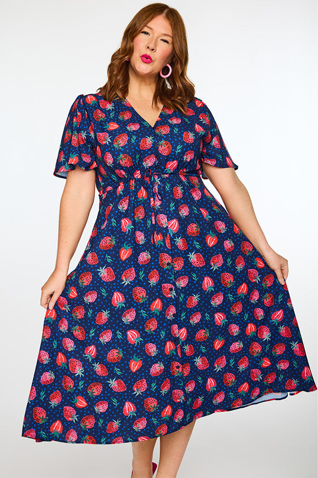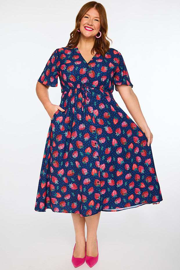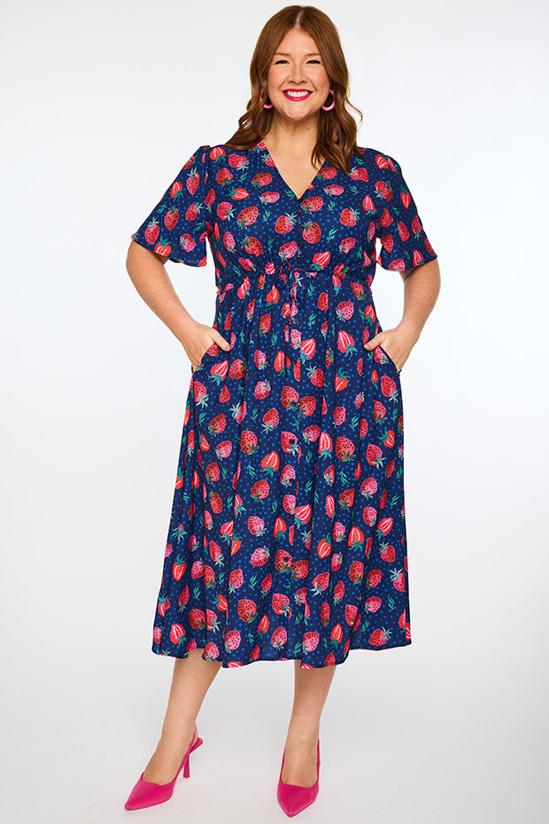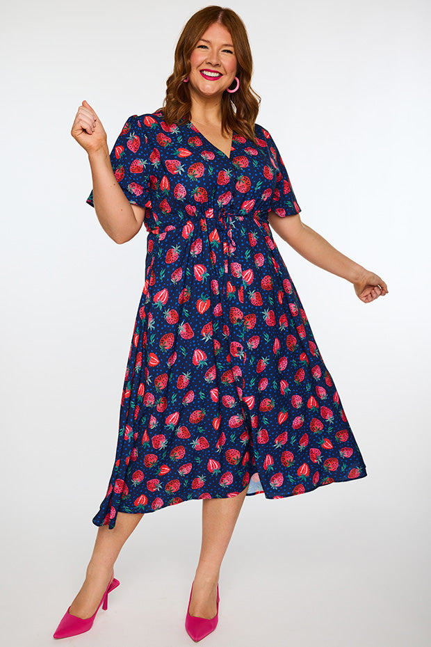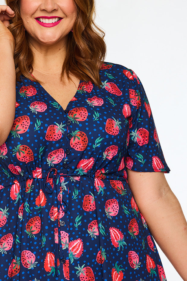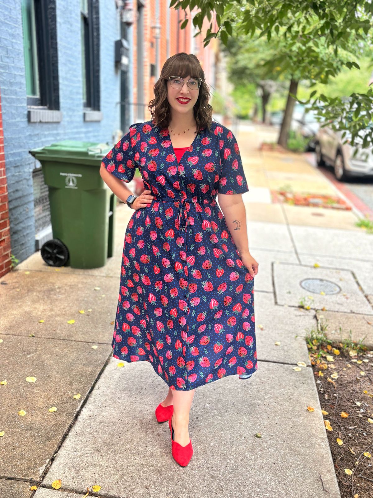 The colours in this dress are great. Red with navy. Makes you feel happy.