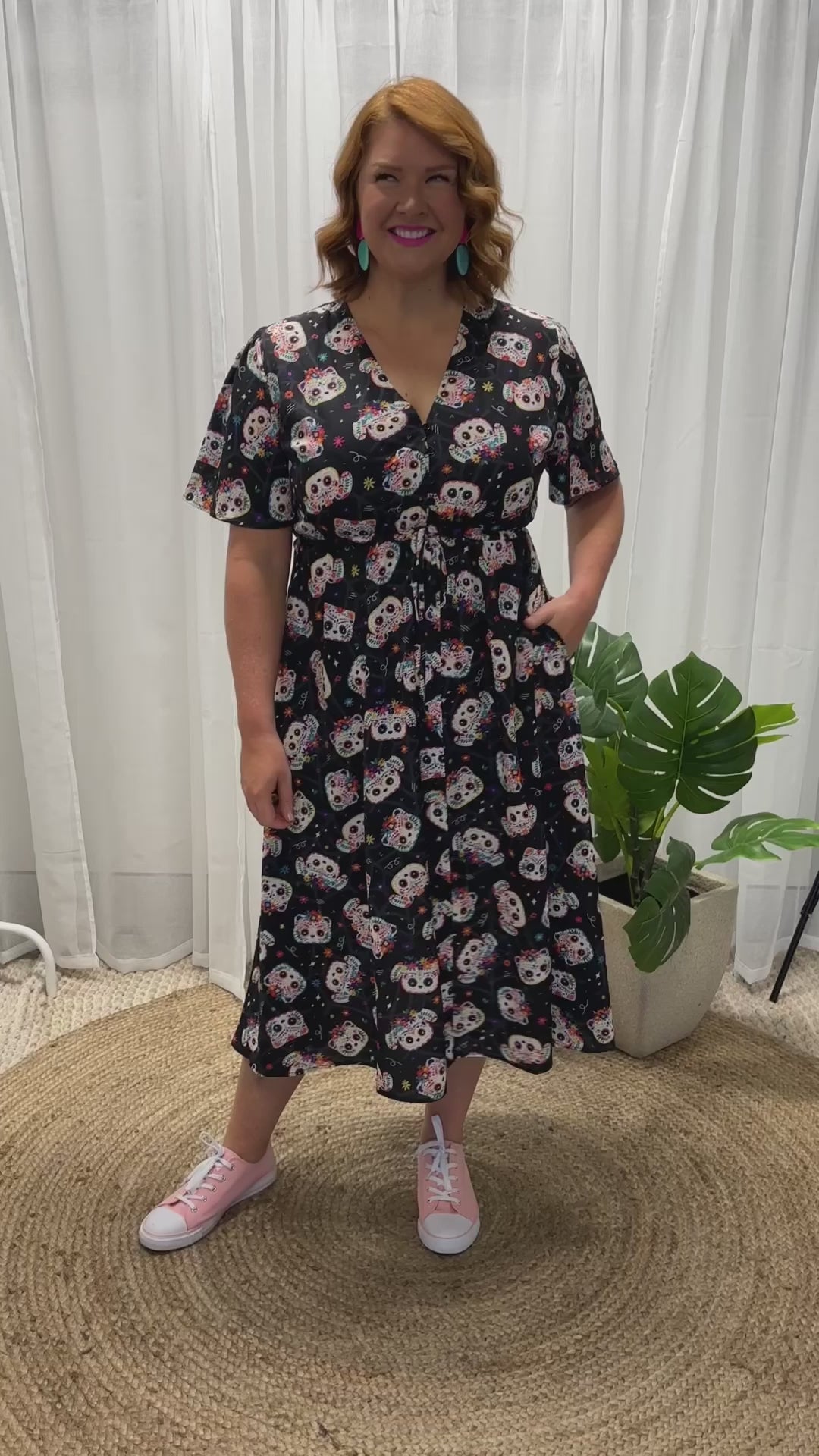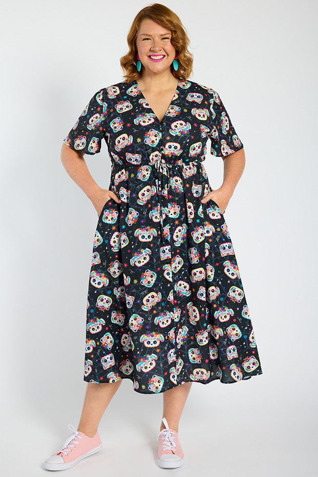 It features a loose bodice, with short wide sleeves & a button up V-neckline. We love the comfy drawstring waist, with a full lined skirt, mid-calf length with side pockets creating a feminine vintage silhouette and that perfect twirly skirt!