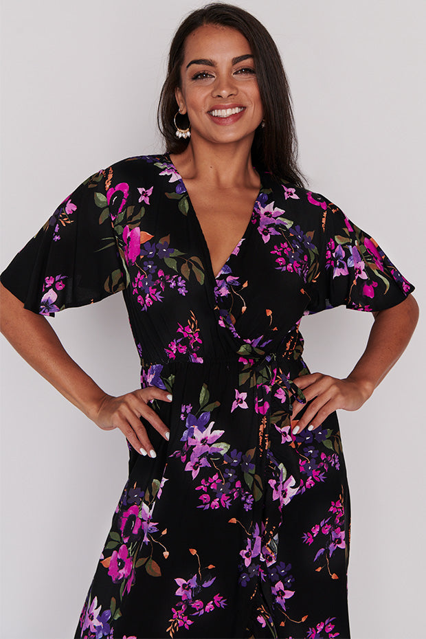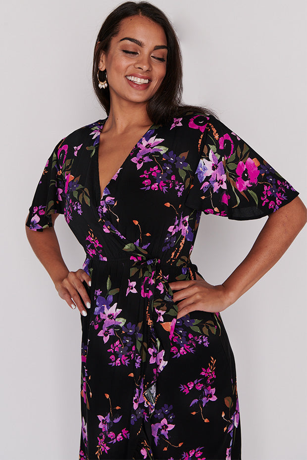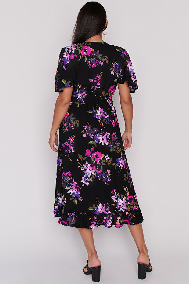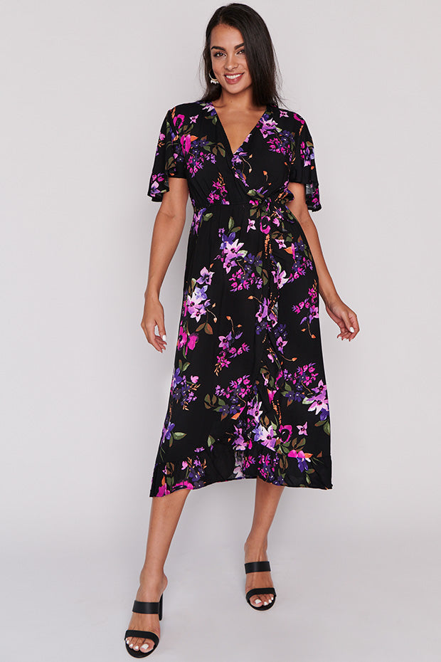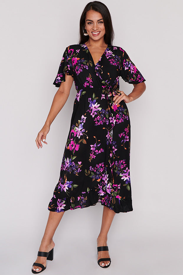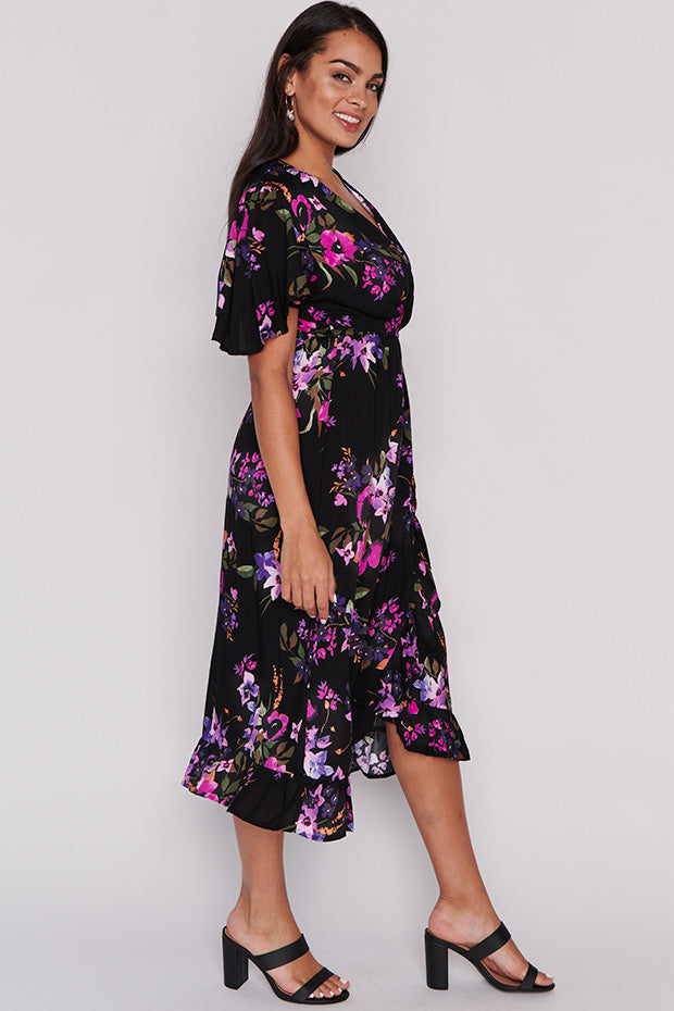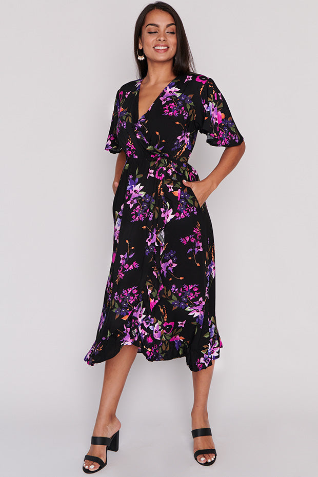 This beautifully soft rayon dress has a generous fit down your whole body, featuring a cross over neckline with a faux wrap style & short loose sleeves. It has an elastic waist for a super comfy fit which cascades down to a frilled front skirt and frilly hemline that curves to meet at the front for that extra little touch, PLUS pockets 🙌