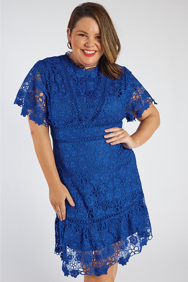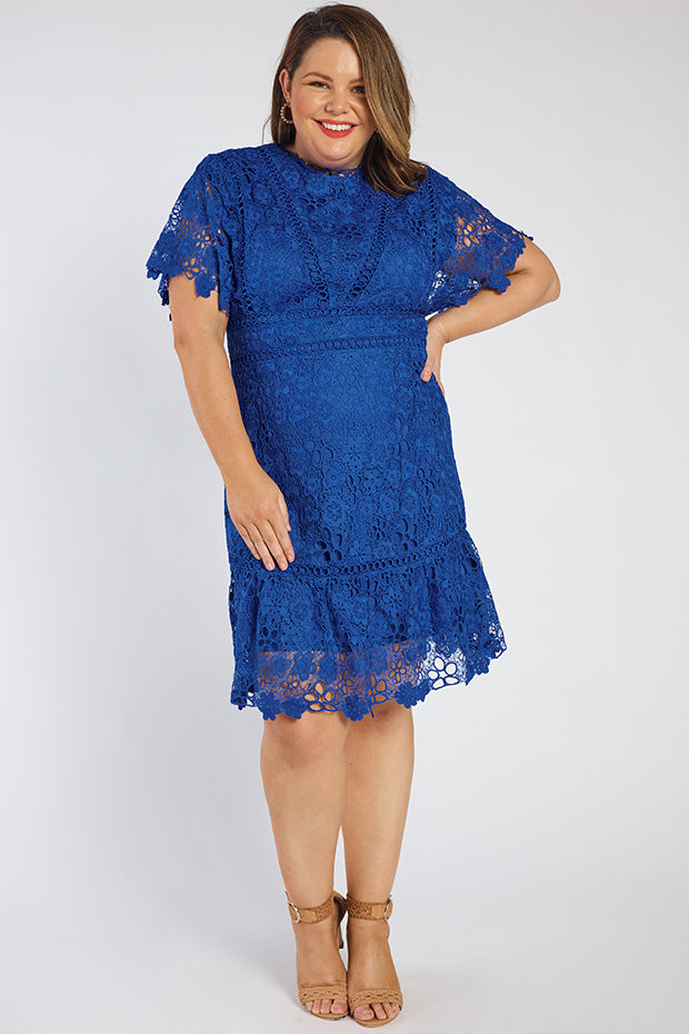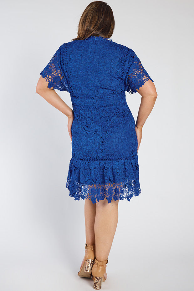This fully lined, delicate lace detailed dress, features a high neck line with zip up back. The short flare-like sleeves and 2-tier skirt create the ultimate silhouette, whilst the fitted waist cinches in perfectly.