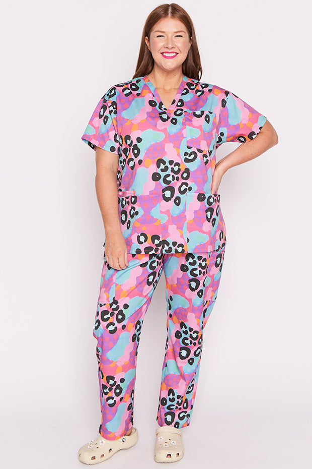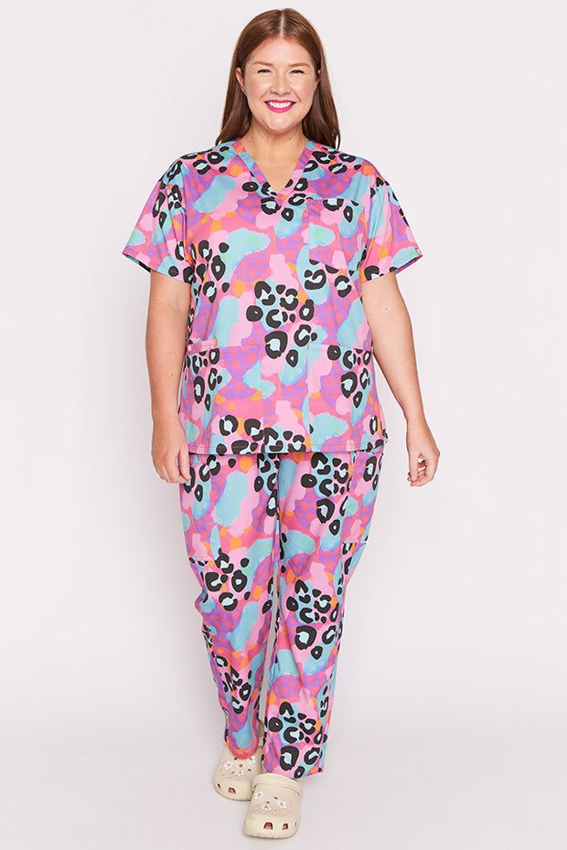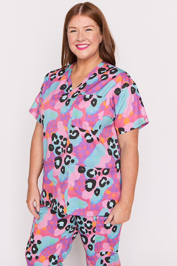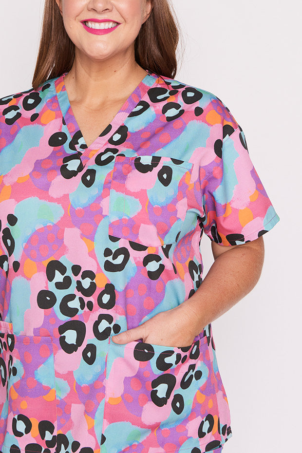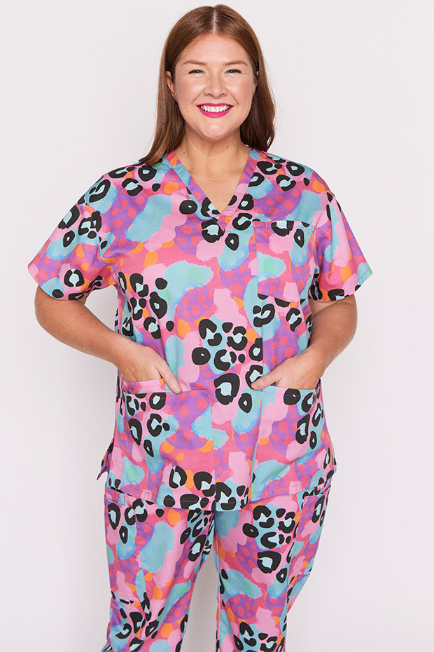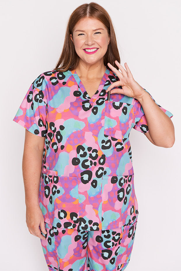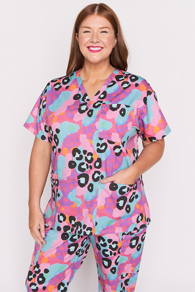 The Meredith Inky Leopard Scrub Top is made with a super comfy polyester, rayon and elastane blend that moves with you! Featuring a v-neckline,