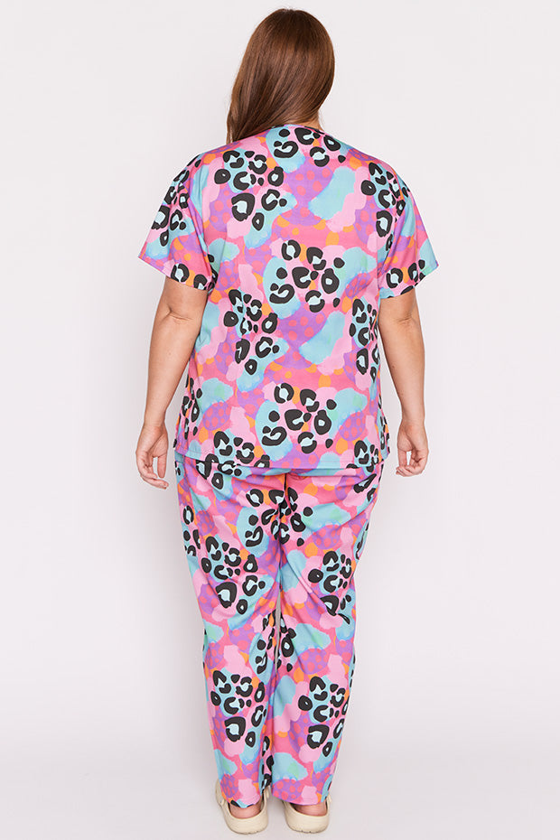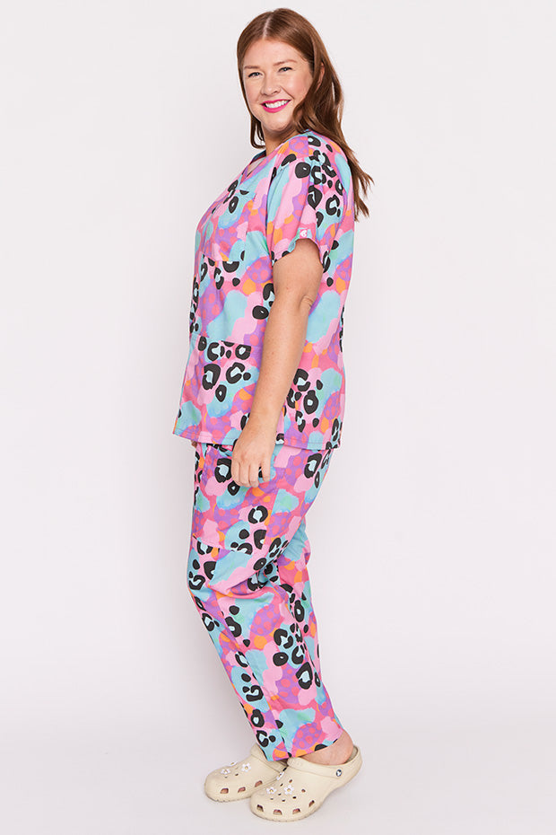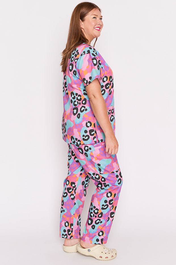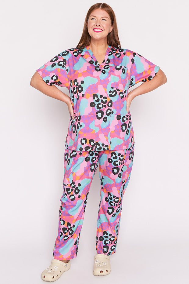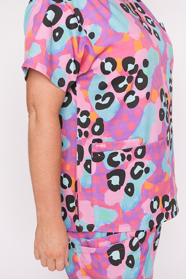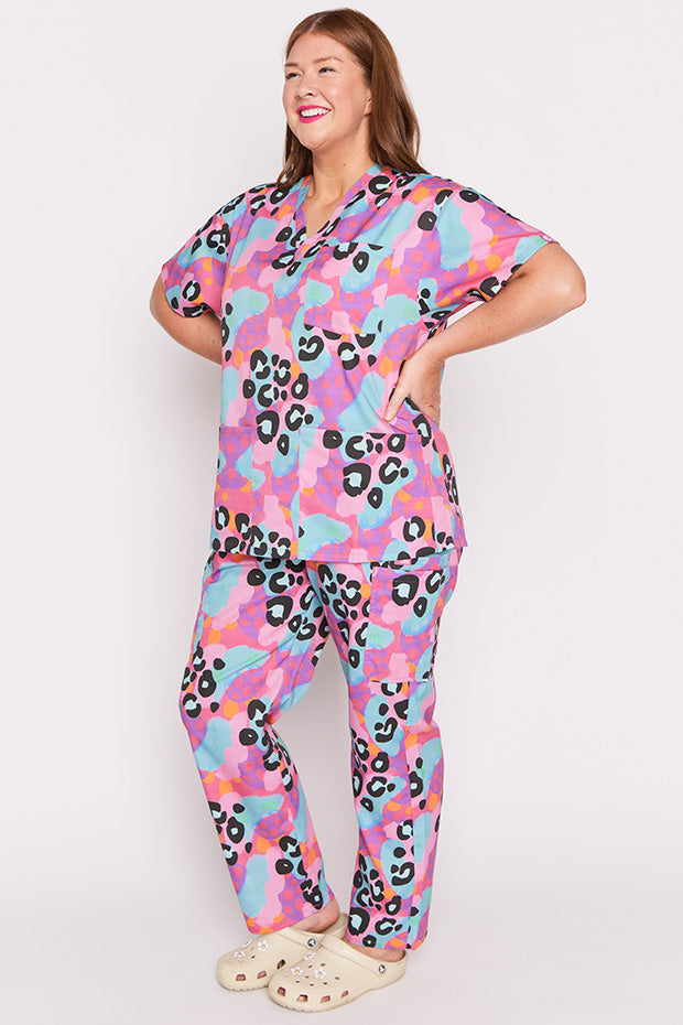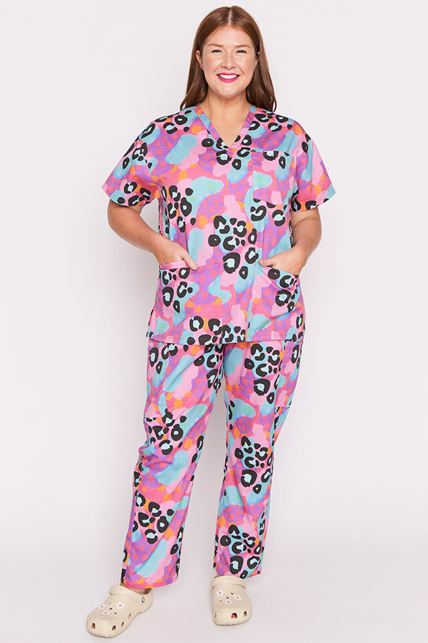 The Meredith Inky Leopard Scrub Top is made with a super comfy polyester, rayon and elastane blend that moves with you! Featuring a v-neckline,