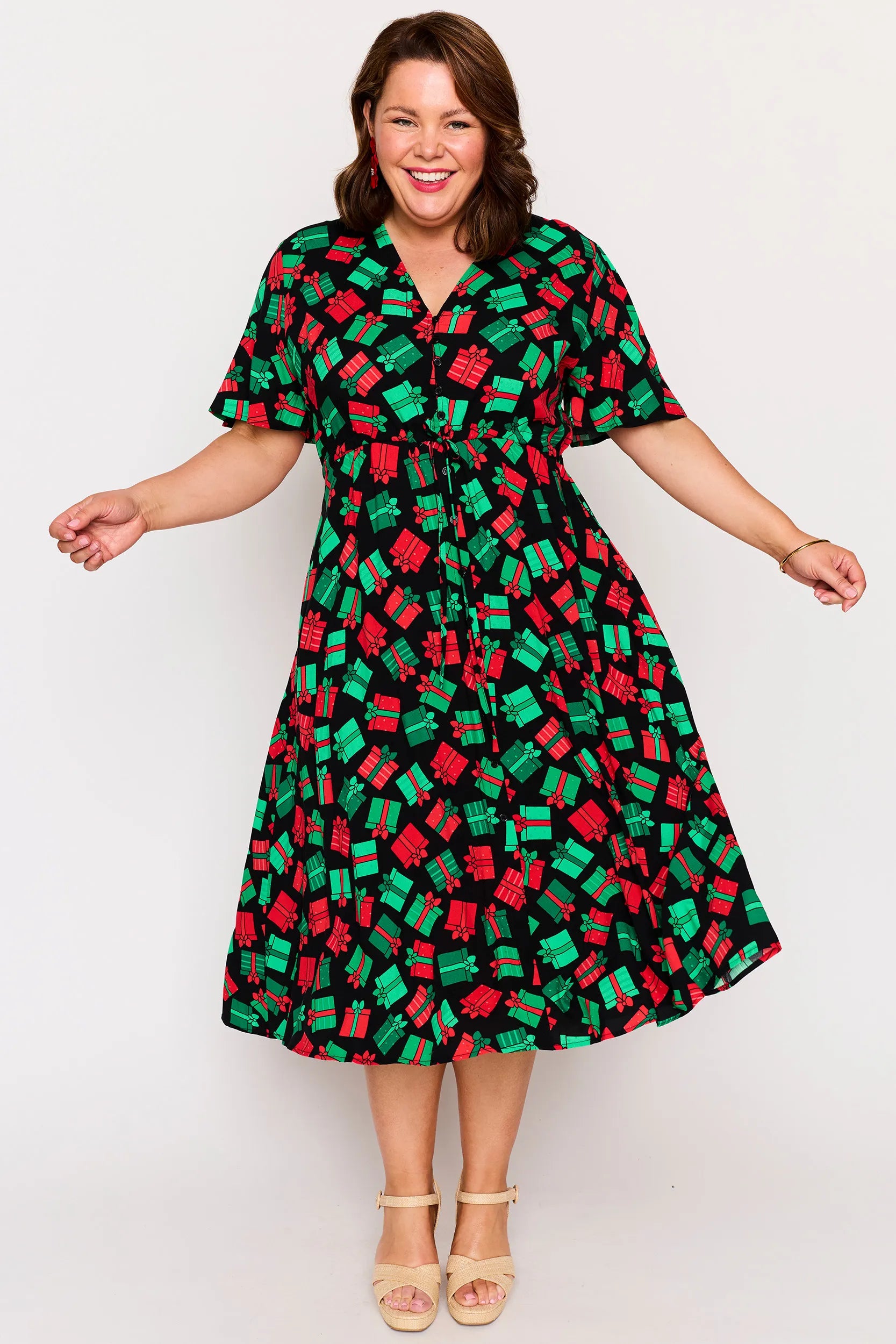 This is a 100% rayon dress which is festive, comfortable, cool and a great fit! So good I bought a 2nd dress in the same style, but a different print. It was a xmas pre-order stock sale, and I was very happy with the service.