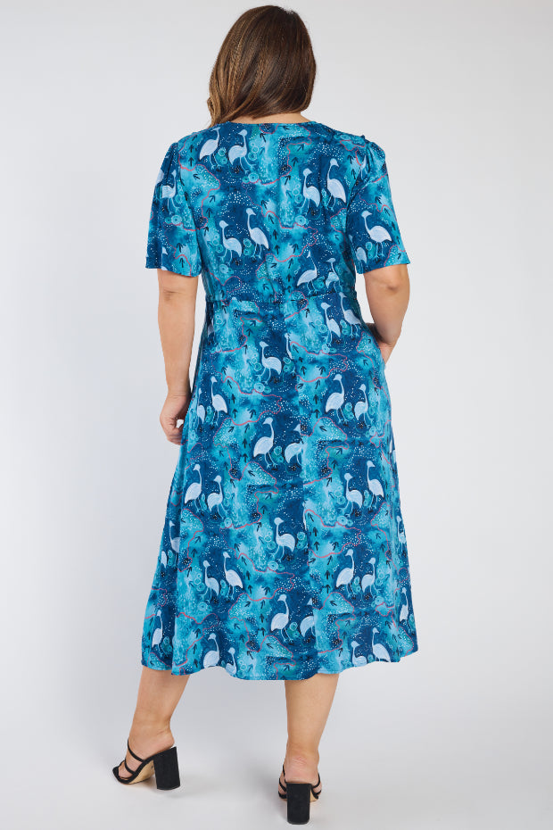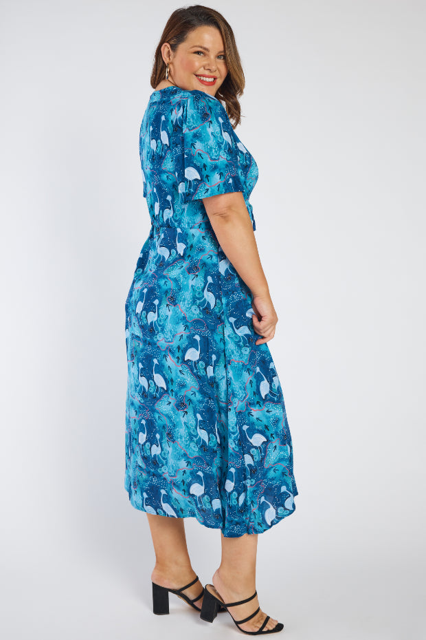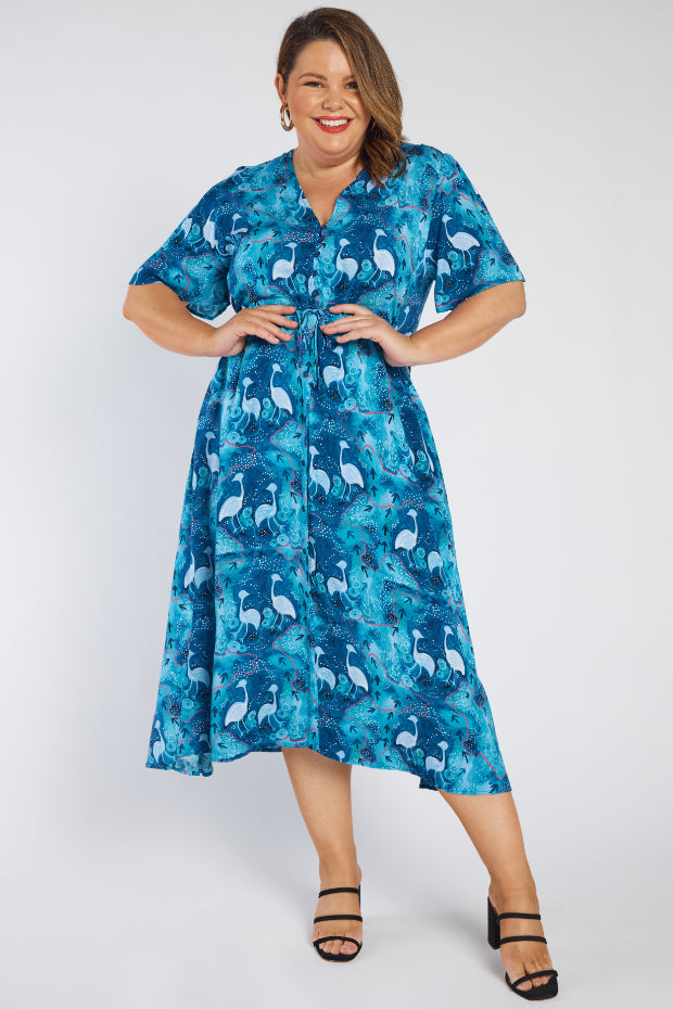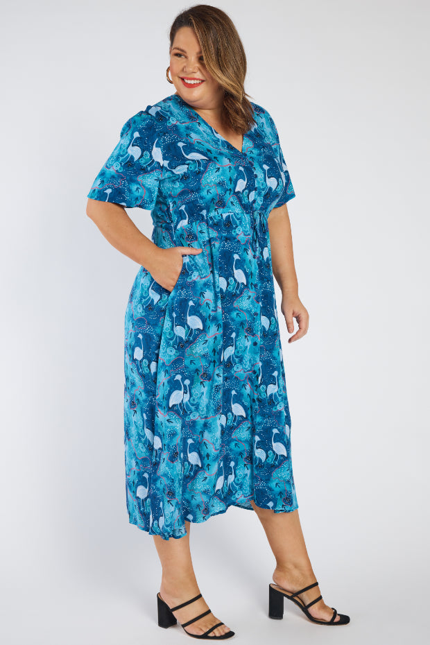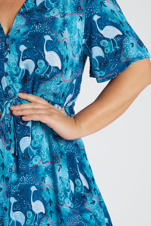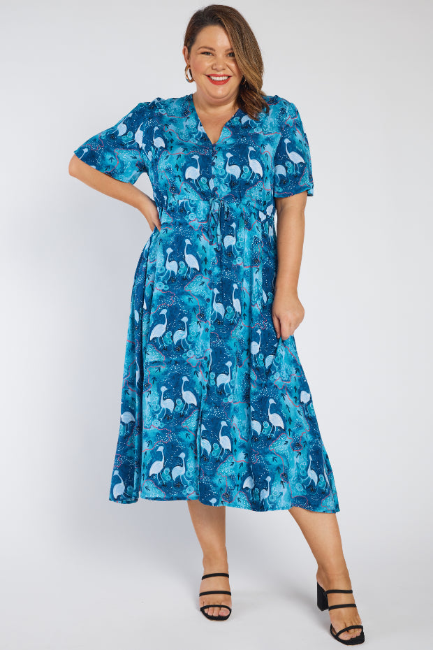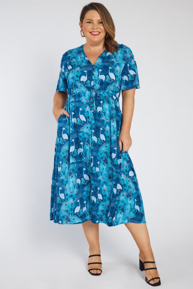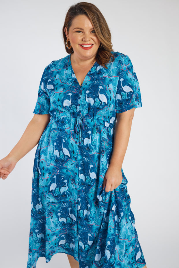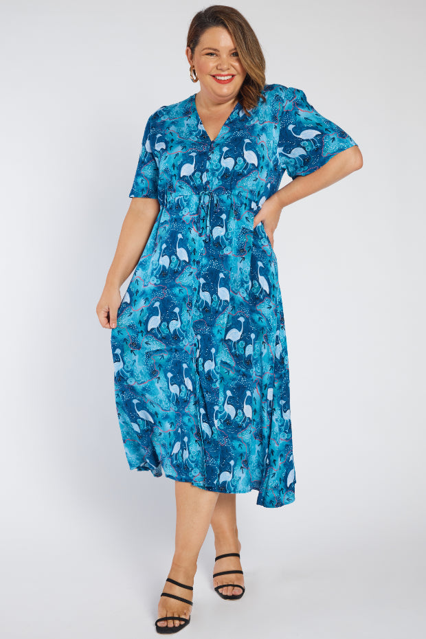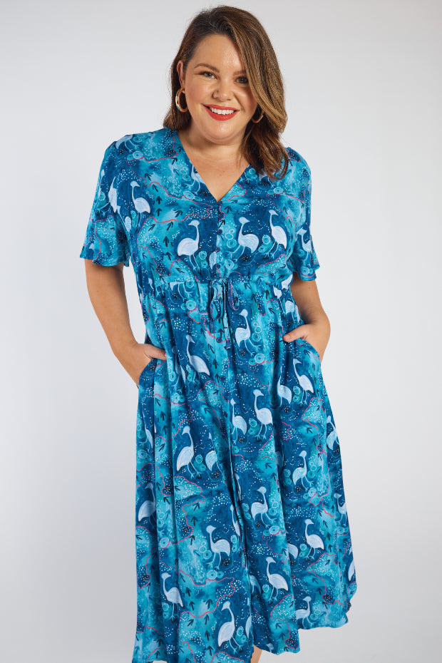 The Michelle Night Sky Dress features a loose bodice, with short wide sleeves & a button up V-neckline. We love the comfy drawstring waist, with a loose lined flared skirt (with pockets!) creating a feminine vintage silhouette and that perfect twirl moment!