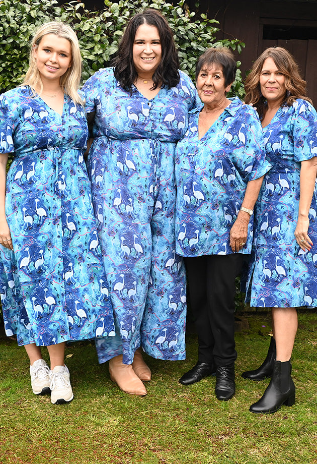 Immerse yourself in the enchantment of this artwork, which pays homage to the Emus (known as Bigarrumdja in Yorta Yorta language), one of Maddy's family totems. Totems hold deep cultural significance for First Nations people, representing ancestral connections and spiritual ties to specific animals or natural elements. In this case, the Emus symbolises an important spiritual entity. The arrow symbols within the print depict emu footprints, further emphasizing their presence.