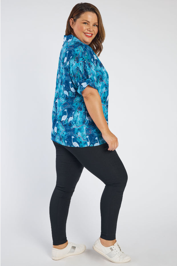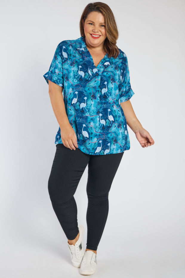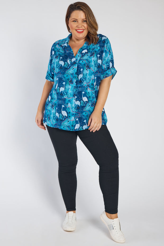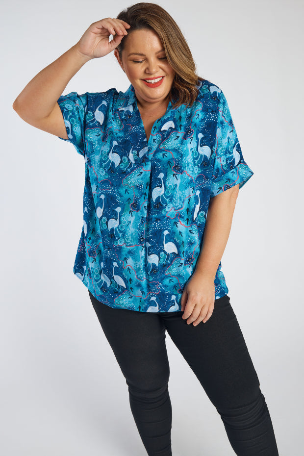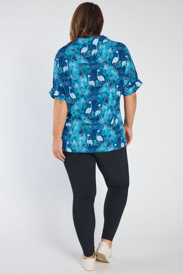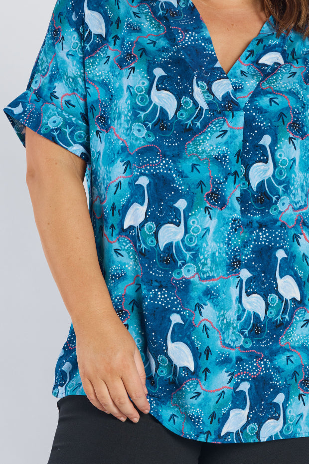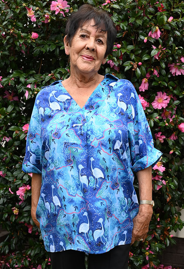 Immerse yourself in the enchantment of this artwork, which pays homage to the Emus (known as Bigarrumdja in Yorta Yorta language), one of Maddy's family totems. Totems hold deep cultural significance for First Nations people, representing ancestral connections and spiritual ties to specific animals or natural elements. In this case, the Emus symbolises an important spiritual entity. The arrow symbols within the print depict emu footprints, further emphasizing their presence.