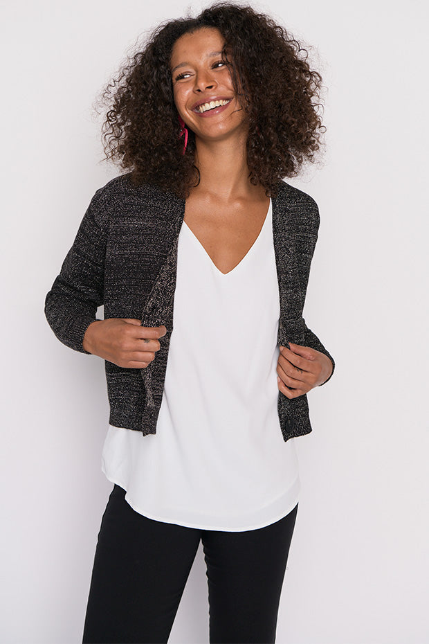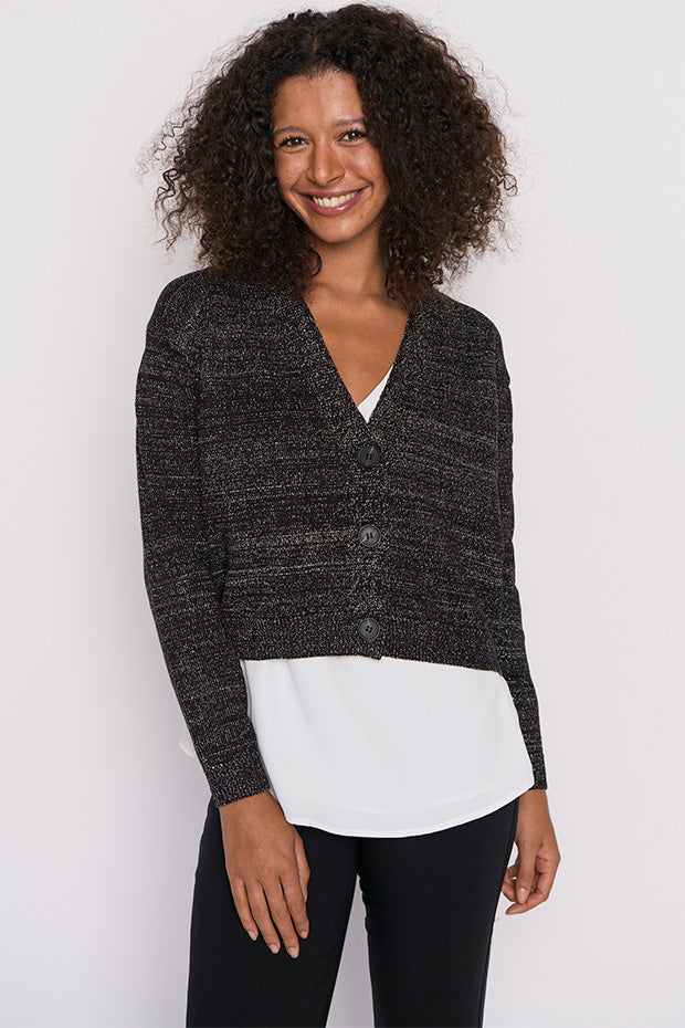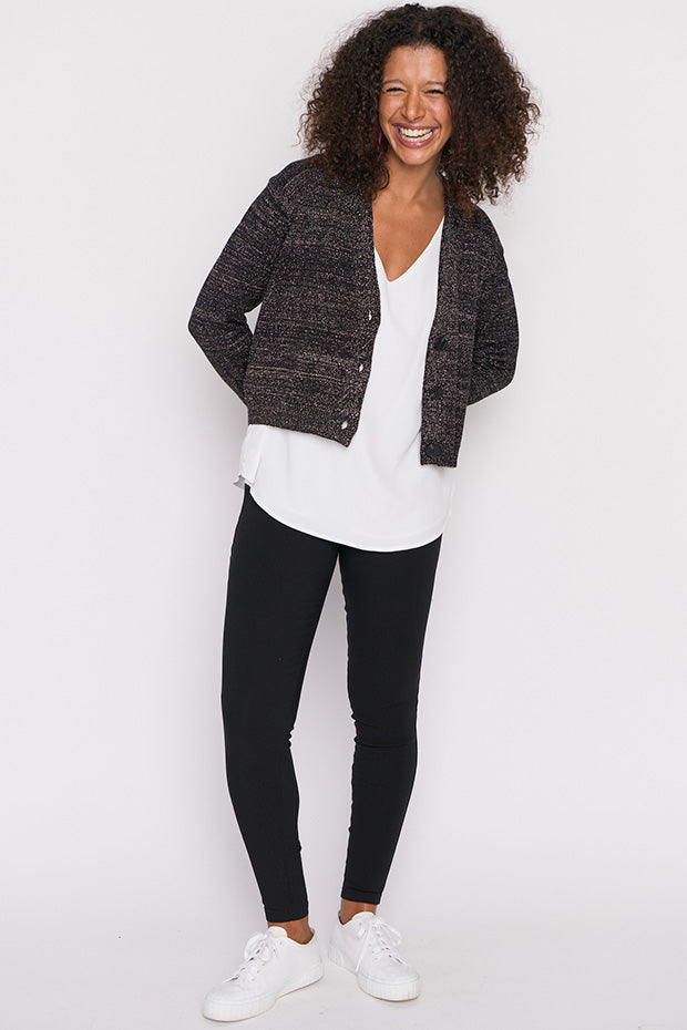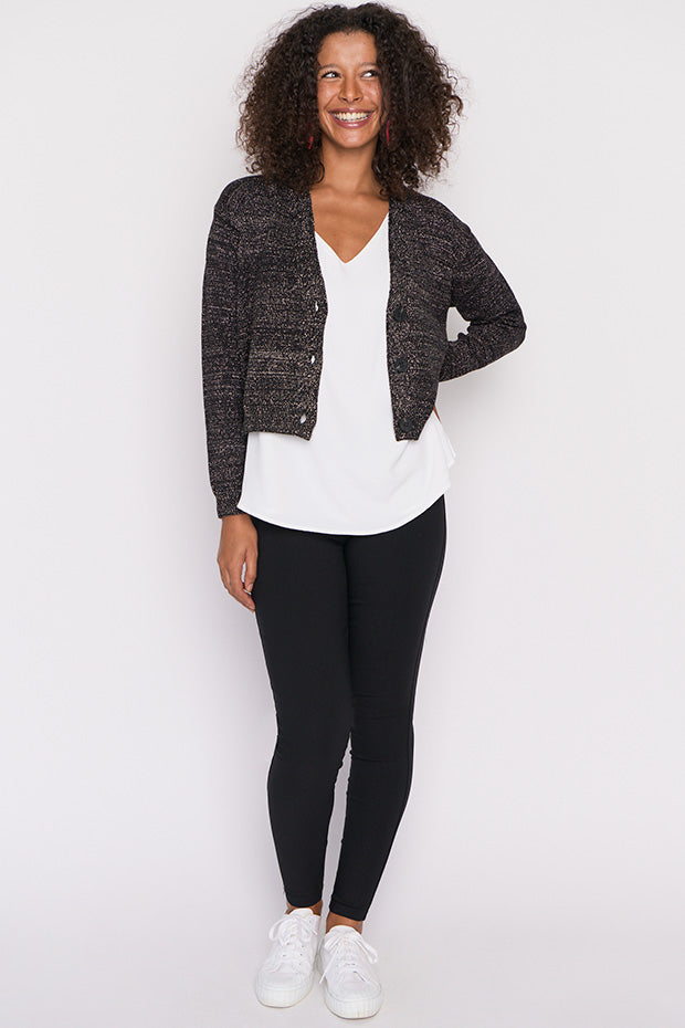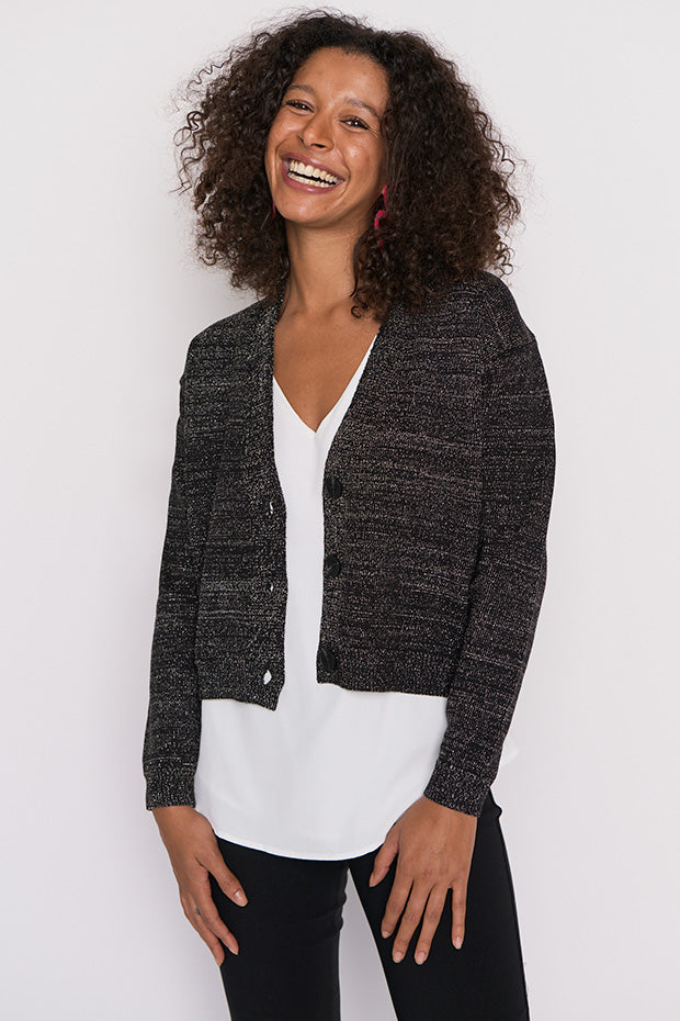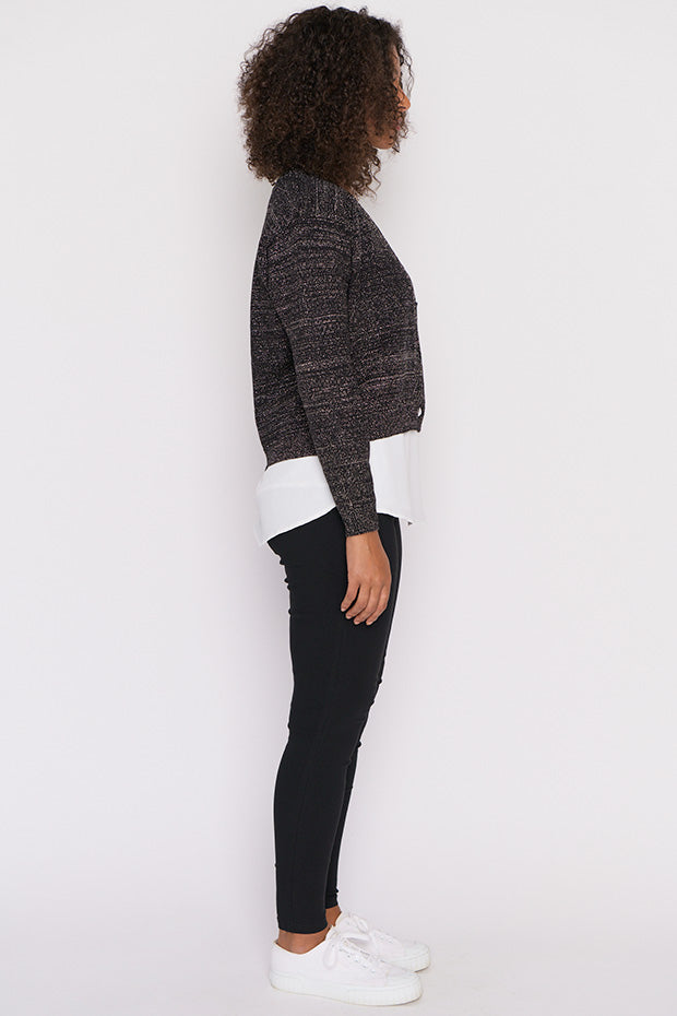 The shape is a relaxed fit, made in a super stretchy viscose blend that is oh-so-warm. Featuring an open V-neckline, button-up front & medium-crop length.