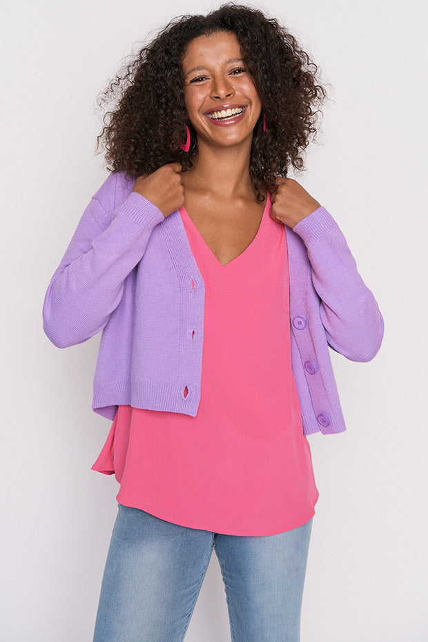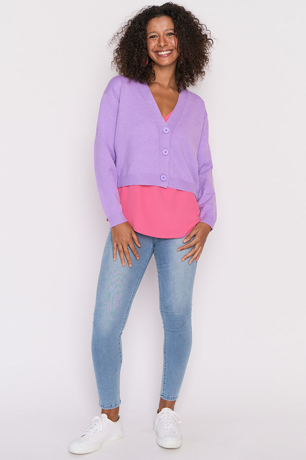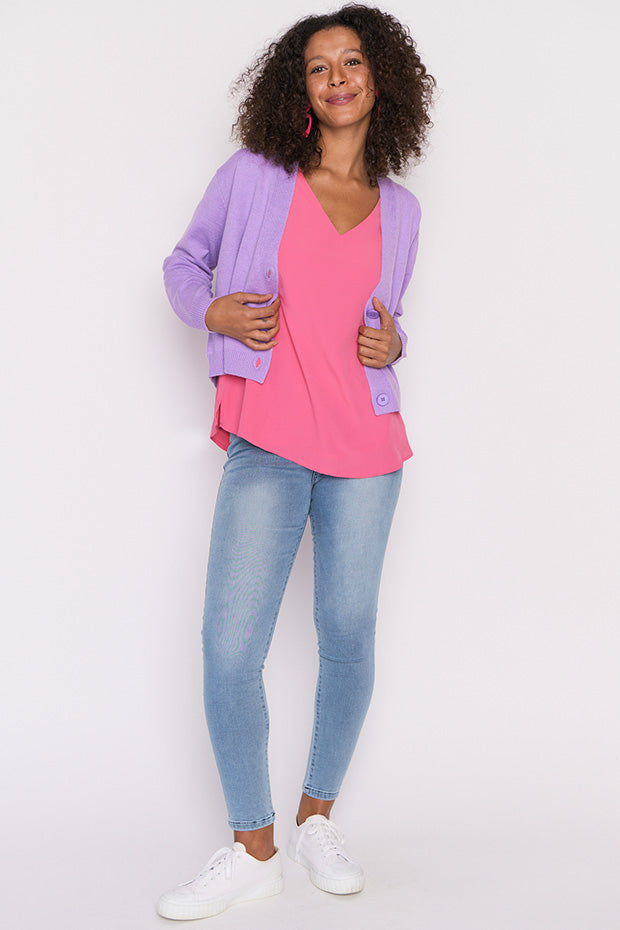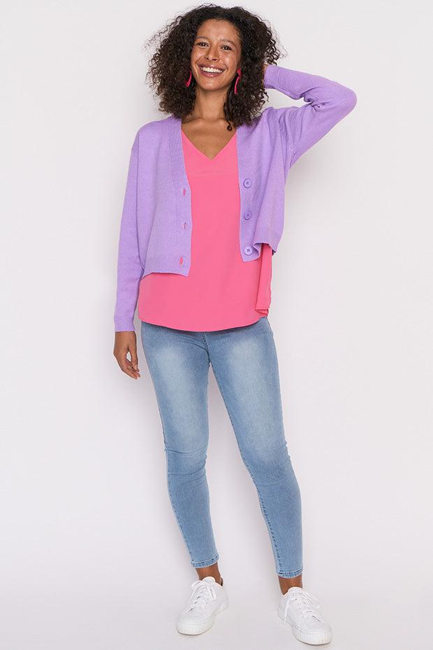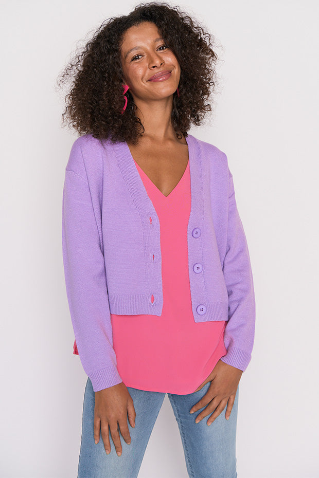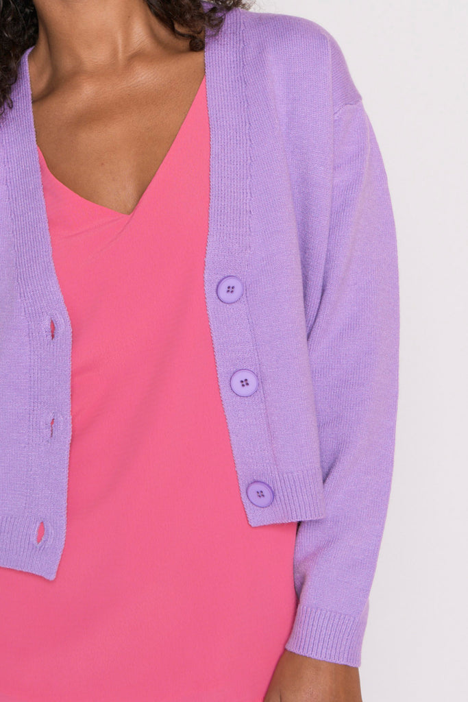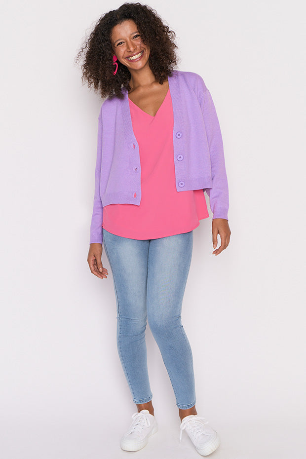 The shape is a relaxed fit, made in a super stretchy viscose blend that is oh-so-warm. Featuring an open V-neckline, button-up front & medium-crop length.