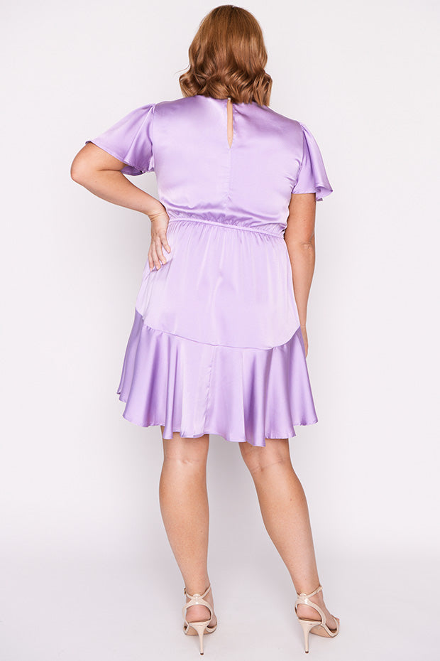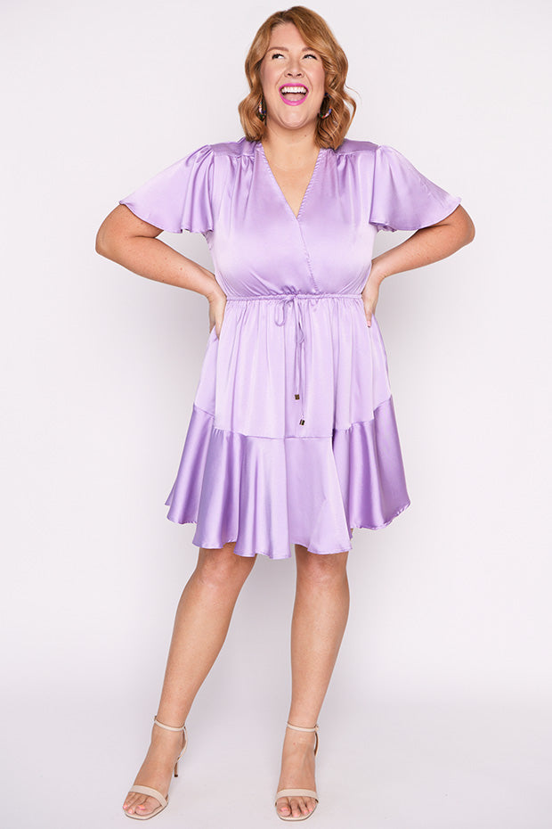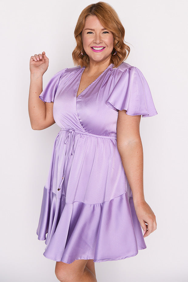 Designed in a lightweight satin feel fabrication, featuring a cross-over V neckline with button closure on the bust & back of neck, with short flared sleeves. The fit is relaxed on your body, with a cinched in stretchy elastic waist with a faux drawstring detailing, creating that feminine chic silhouette, then flowing down to a tiered flared skirt ✨