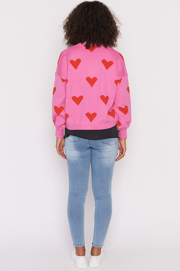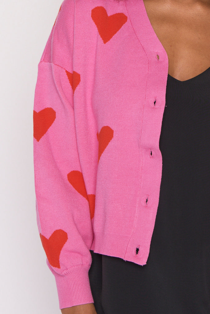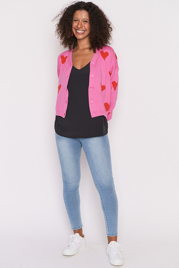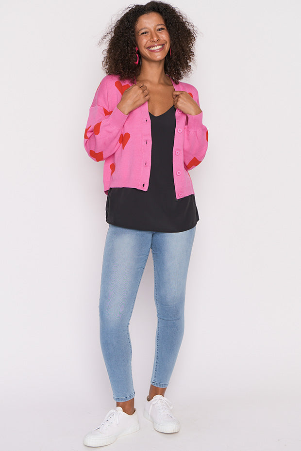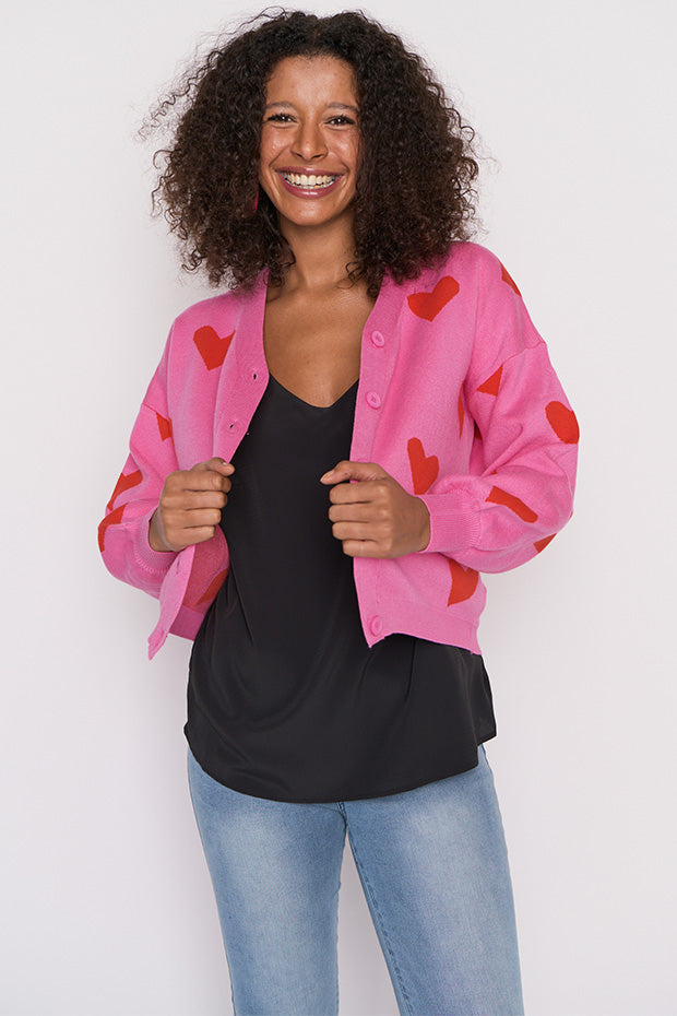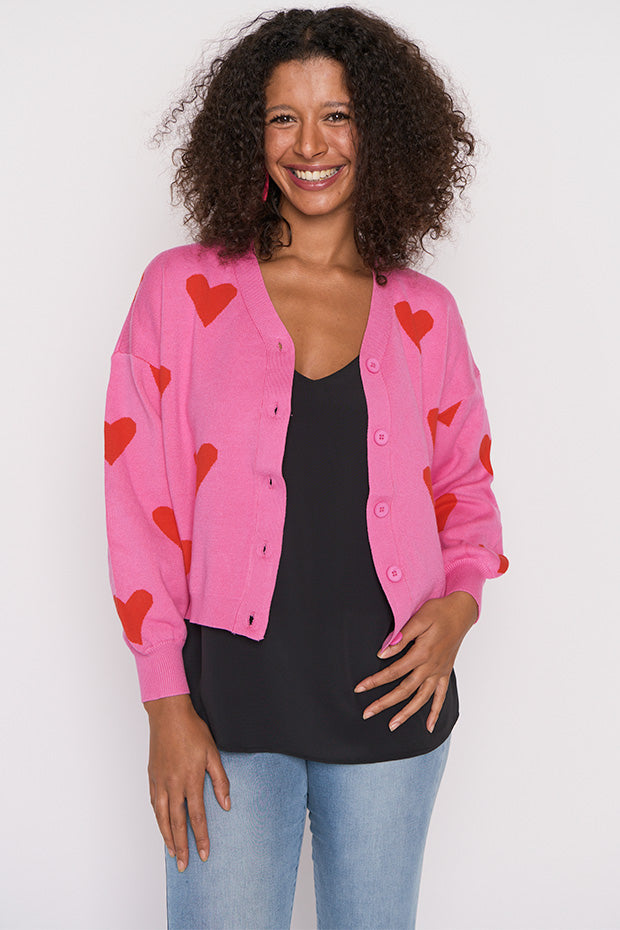 The shape is a relaxed boxer fit, made in a super stretchy viscose blend that is oh-so-warm. Featuring an open V-neckline, button-up front & medium-crop length with a drop shoulder. The knitted in hearts give it that extra bit of love.