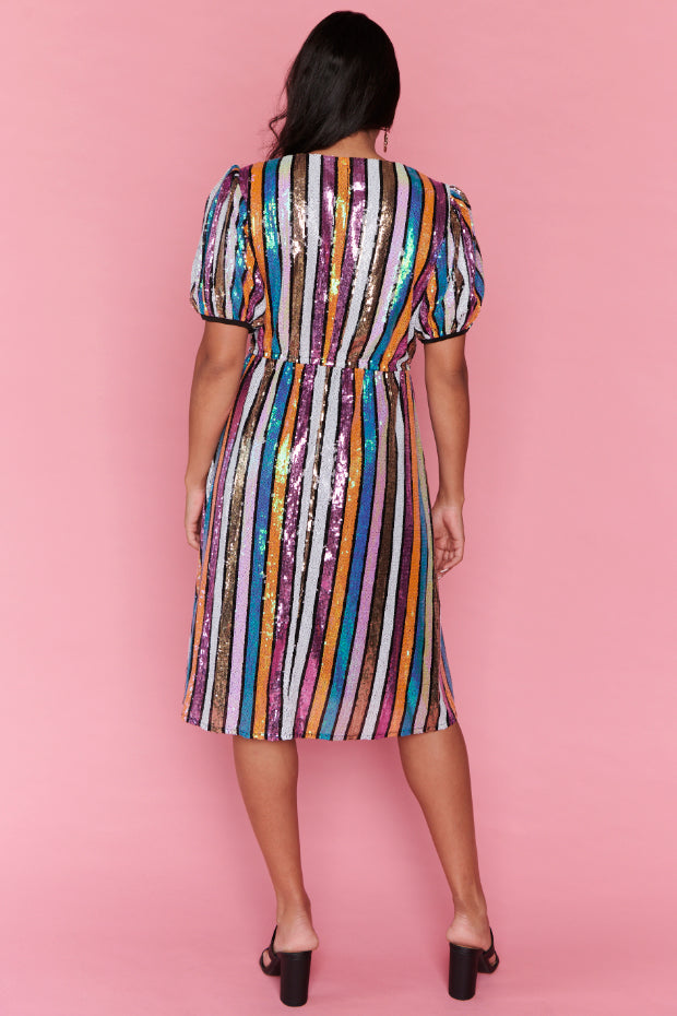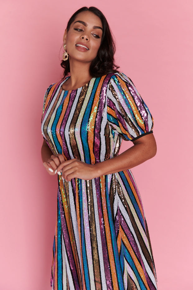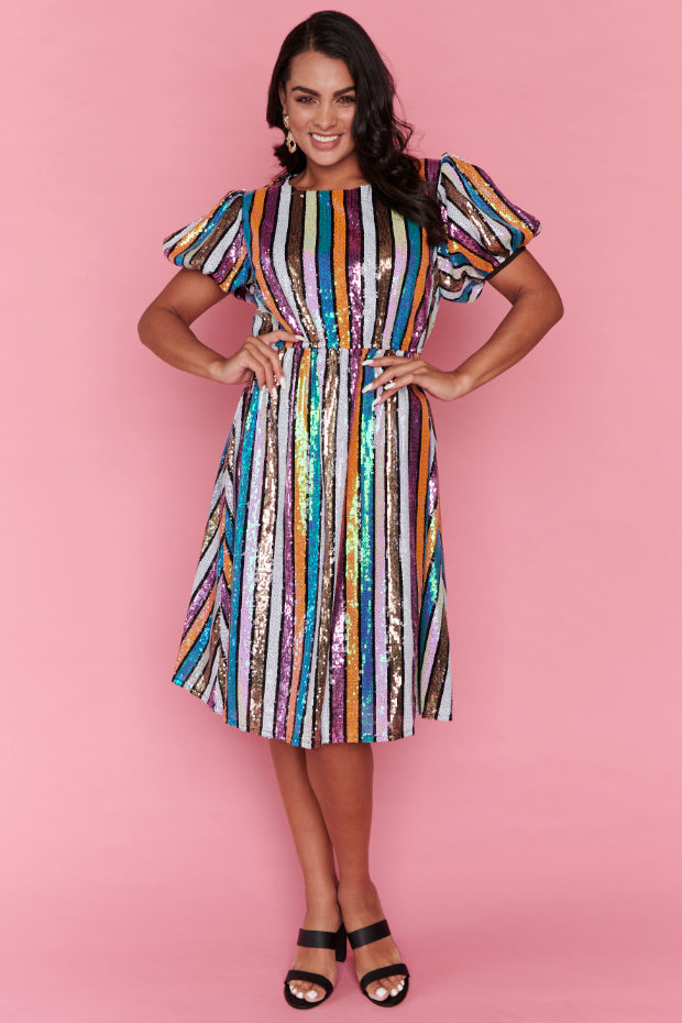 We're burning up baby, we're burning up! The new Rainbow Stripe Party Dress is so electric it's going to give you a fever 🔥