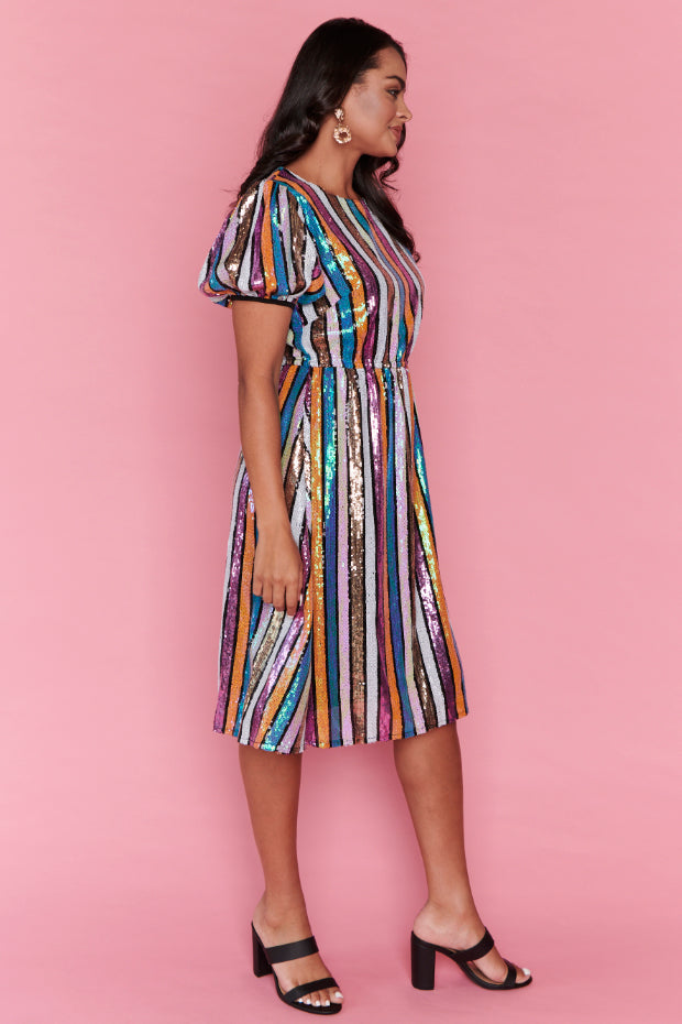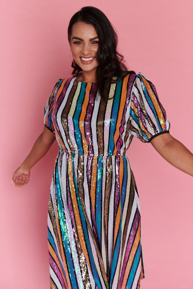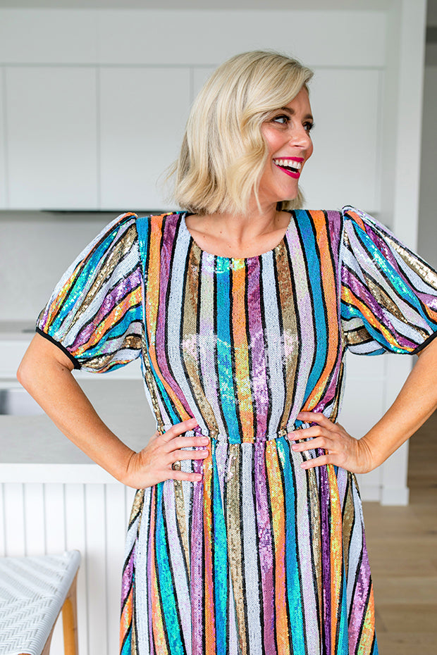 Featuring an all over sparkly sequined fabrication with short puffy statement sleeves & round neckline. We love the elasticated waist to guarantee you get a comfy fit, with a loose flowing skirt that is ready for a twirl 💖
