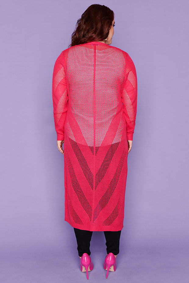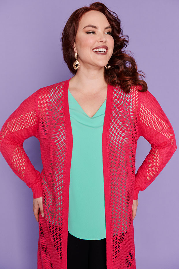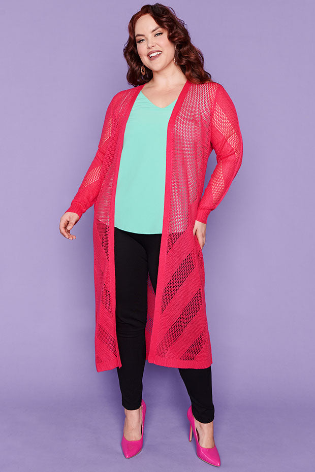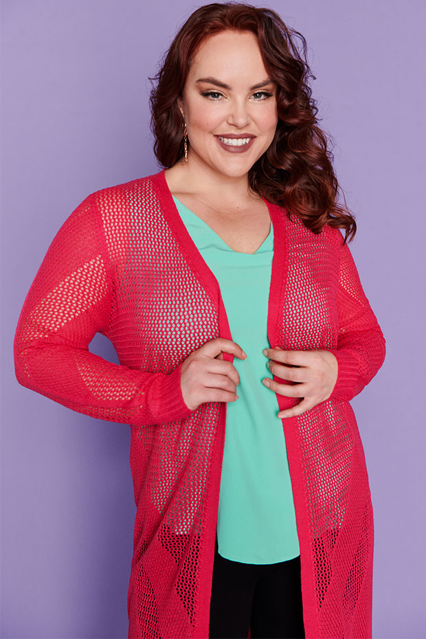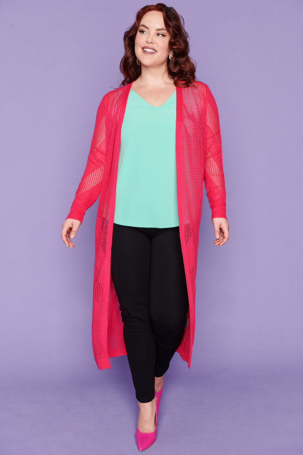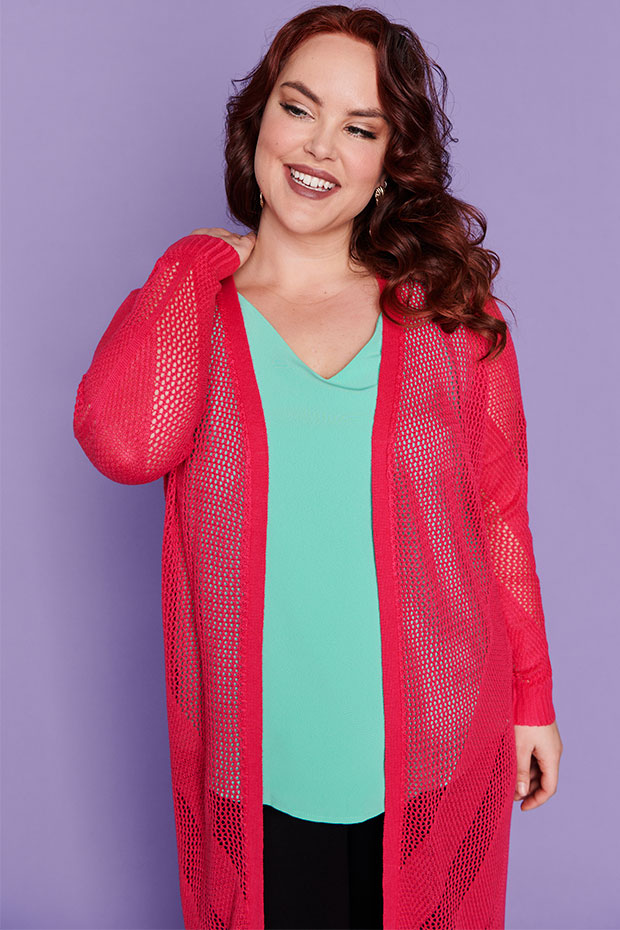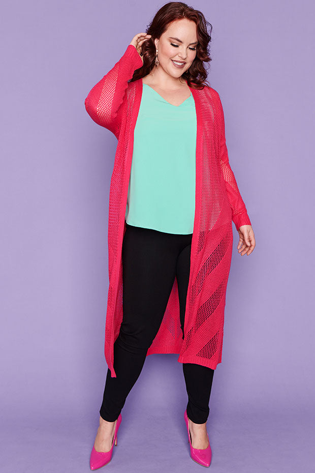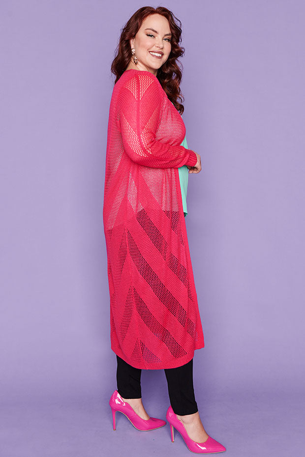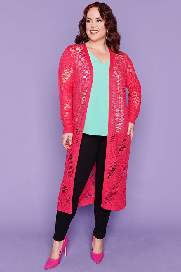 Designed in a flowy slim longline shape, soft & stretchy crochet knit fabrication throughout, with a relaxed open front.