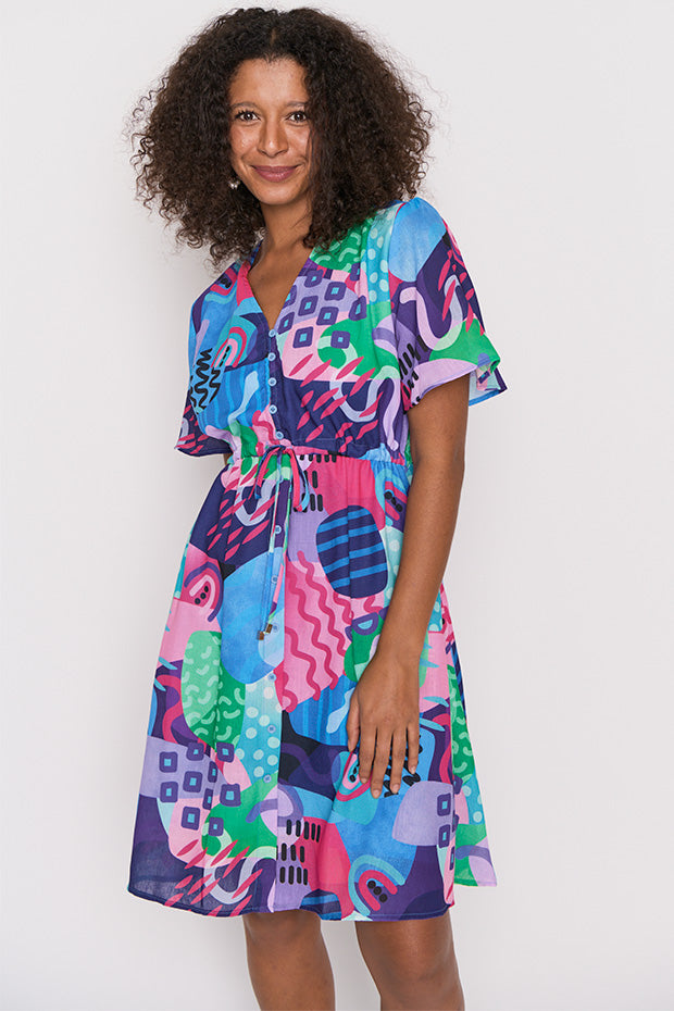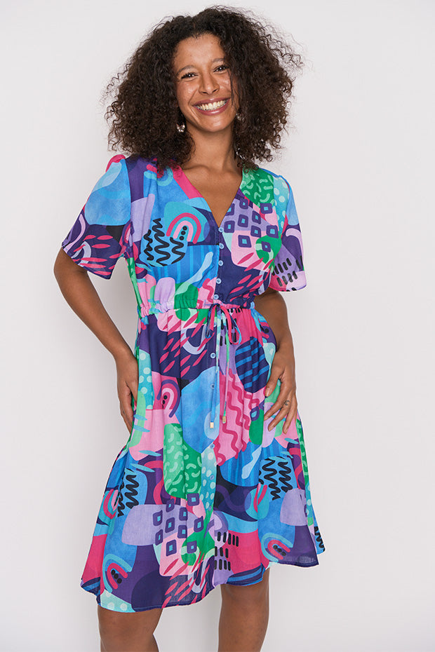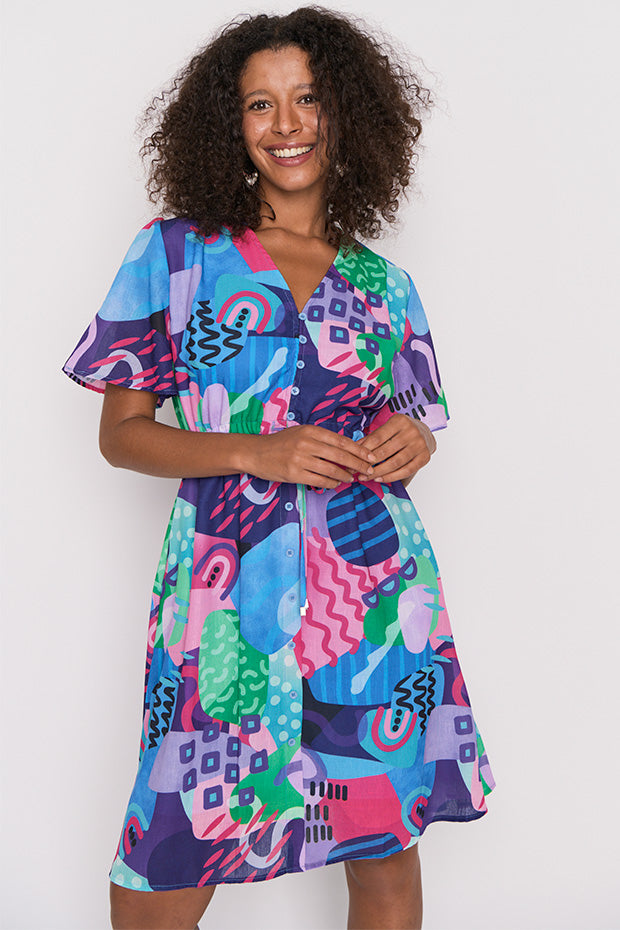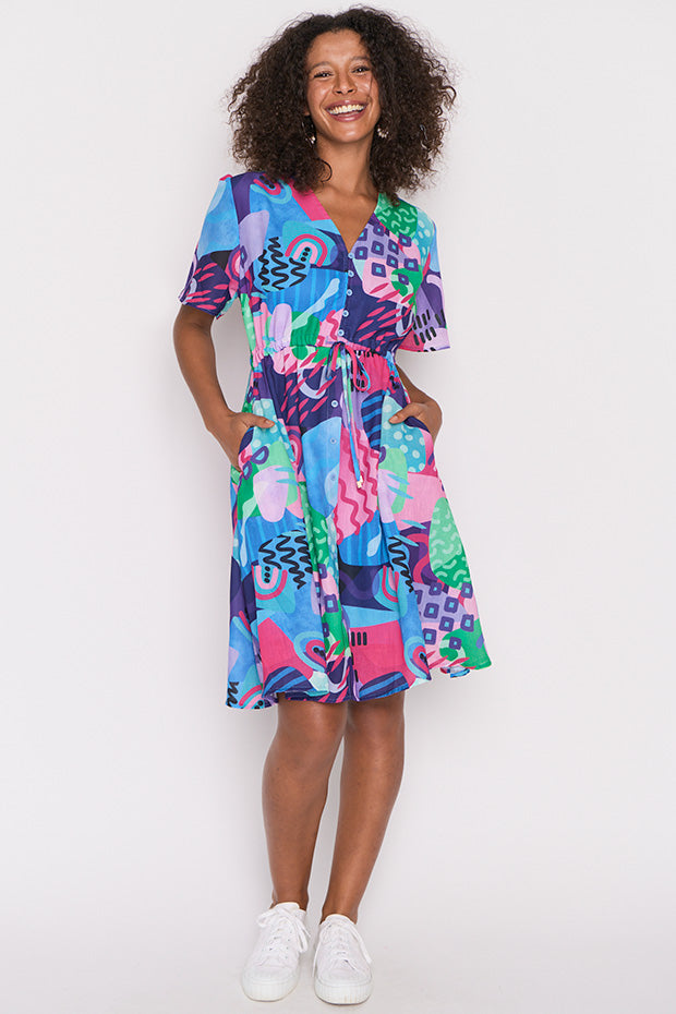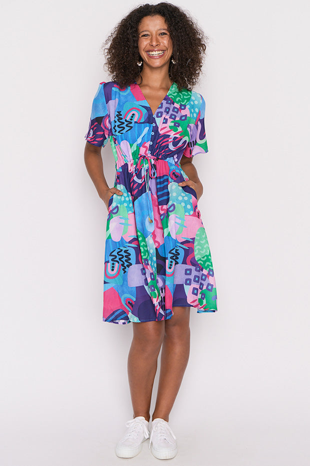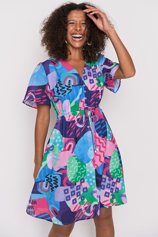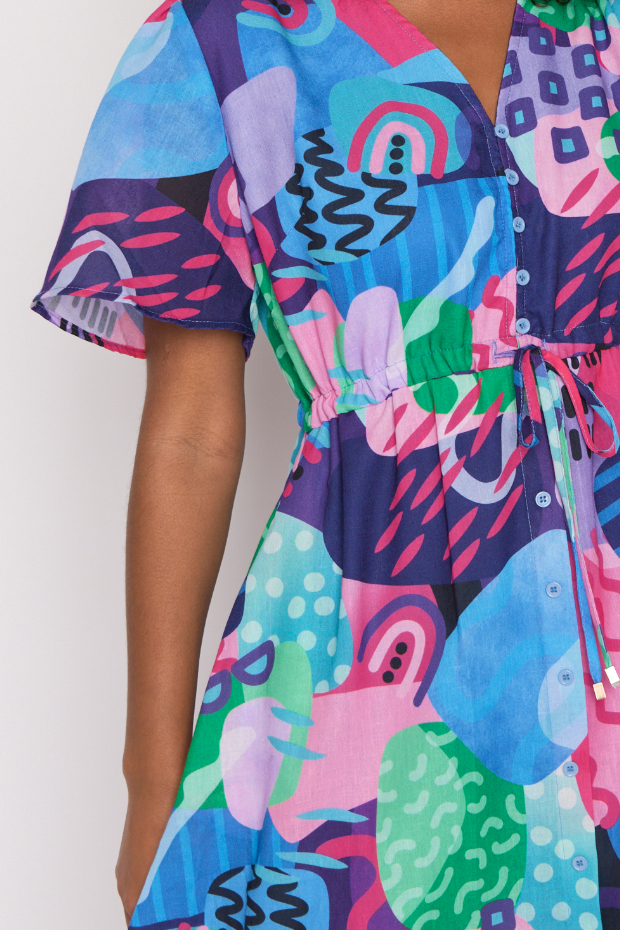 Featuring a looseĀ bodice withĀ short wide sleeves &Ā a button up V-neckline.Ā We love theĀ comfy drawstringĀ waistĀ with aĀ lined, loose flowing skirtĀ that is ready for a twirl!
