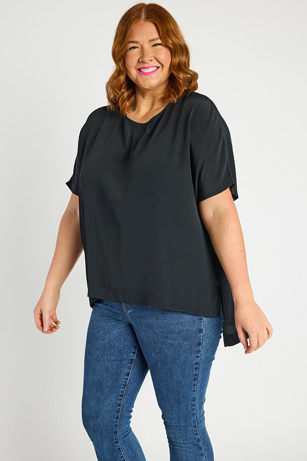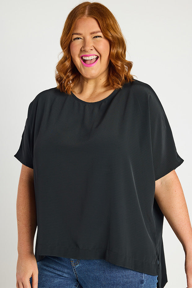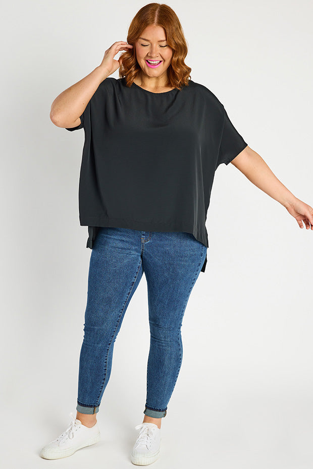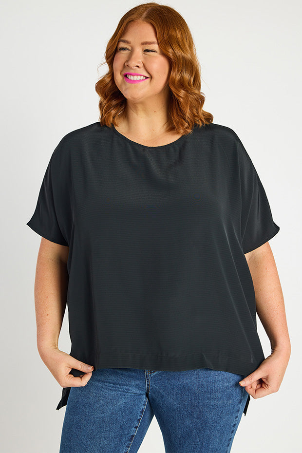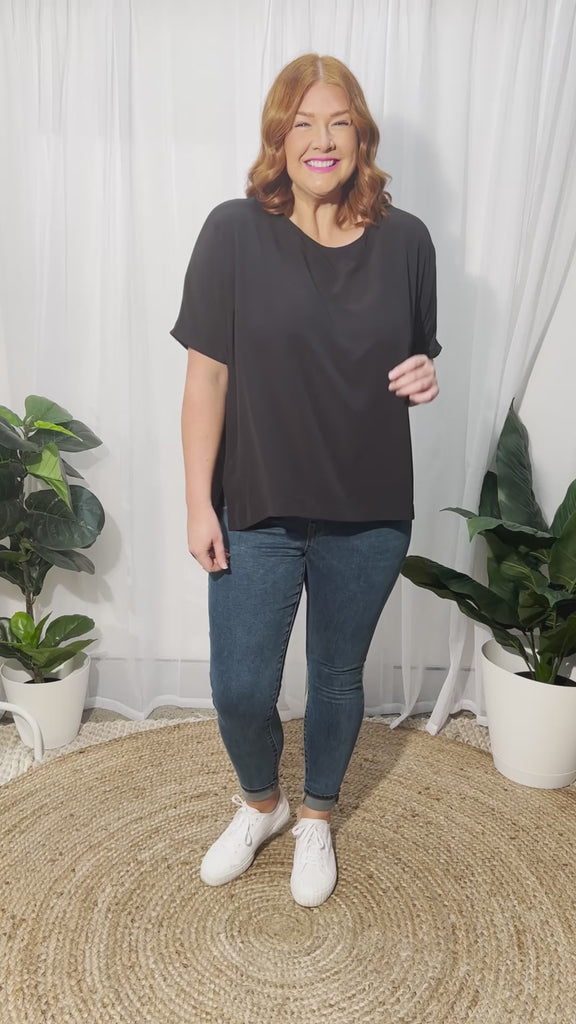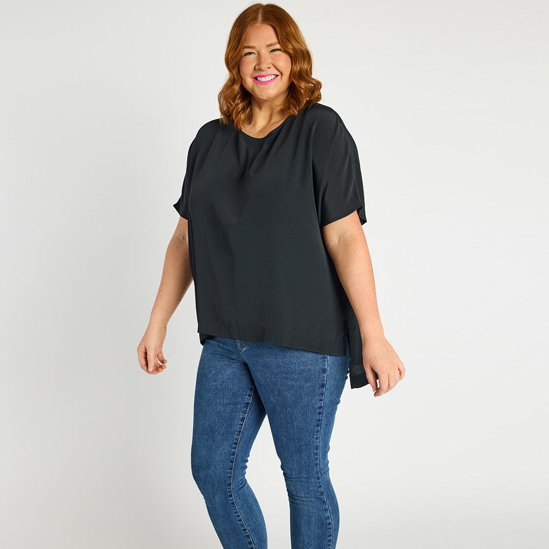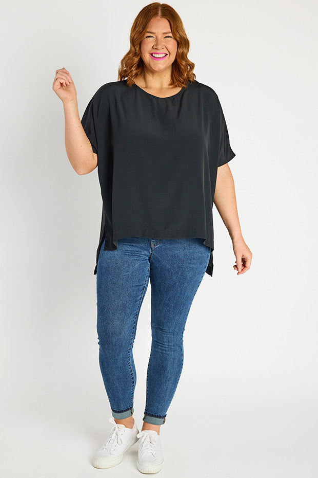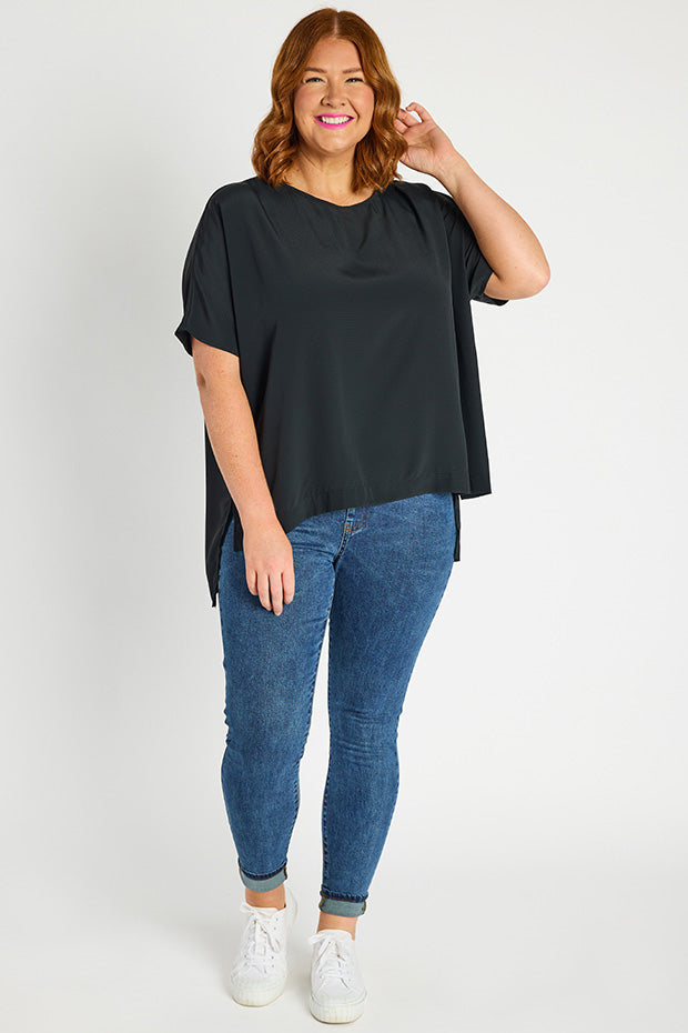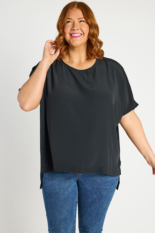 It features a high scoop neckline, with a very loose, boxy fit in the body & short relaxed sleeves. You can wear it loose as a free flowing tee & show off the modern high-low hemline, or tuck it into high-waisted bottoms for a glam ensemble!