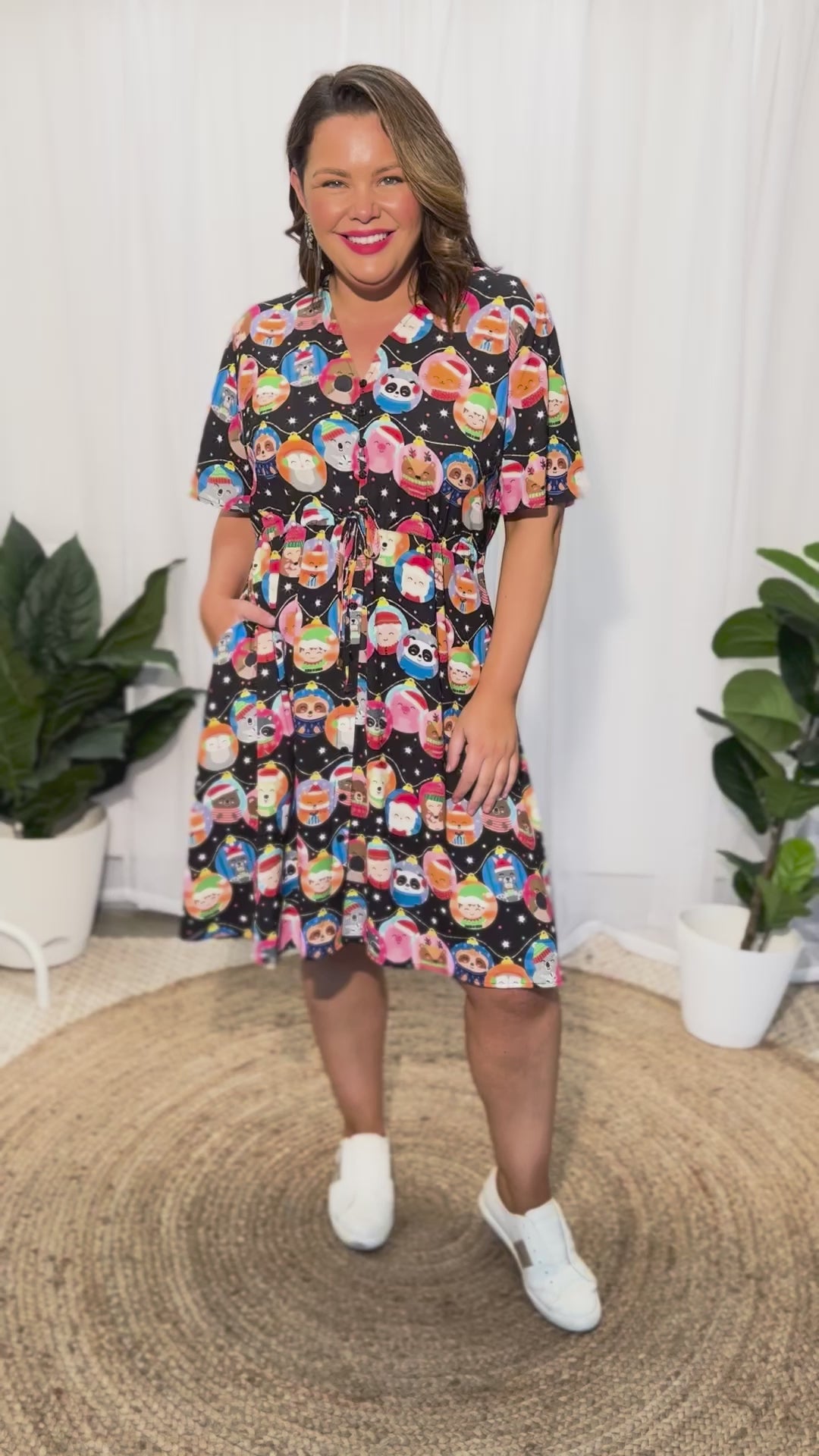This light weight poly dress features a loose bodice, with short wide sleeves & a button up V-neckline. We love the comfy drawstring waist, with a loose flowing, fully lined skirt that is ready for a twirl! And of course, finished off with hidden pockets 😎