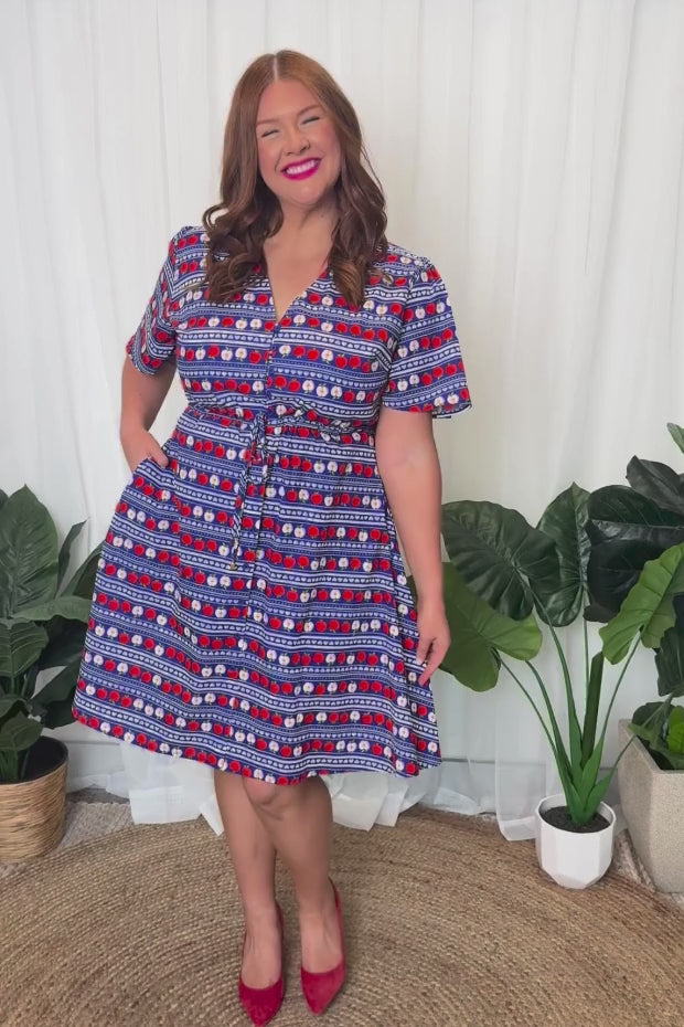 This lightweight 100% cotton fabrication dress features a loose bodice, with short wide sleeves & a button up V-neckline. We love the comfy drawstring waist, with a loose flowing skirt that is ready for a twirl! And of course, finished off with hidden pockets!