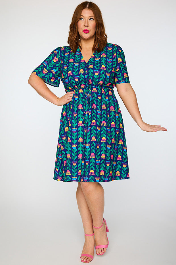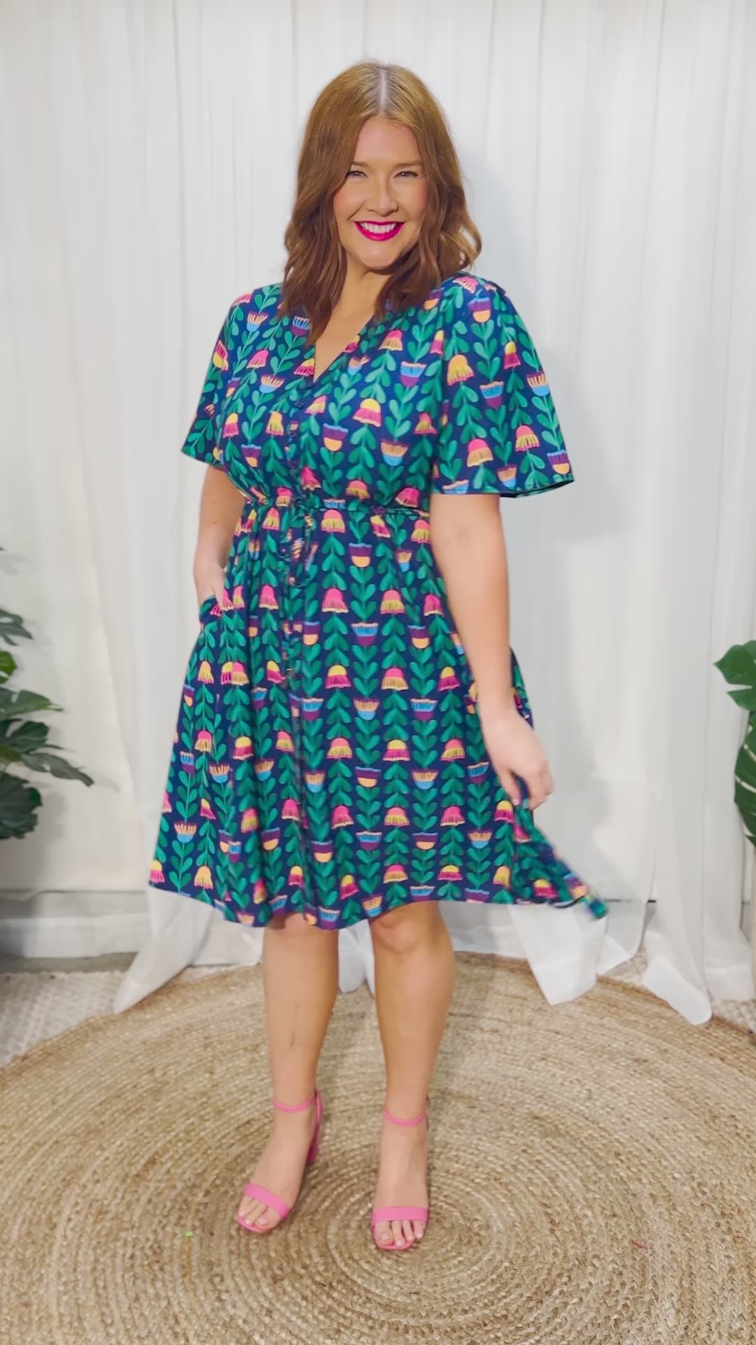 This dress is a stunning print and is a very flattering cut that suits most body types. The dress runs true to size. Definitely recommend this item.