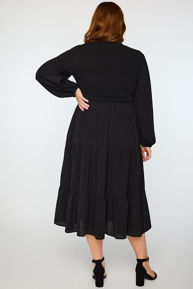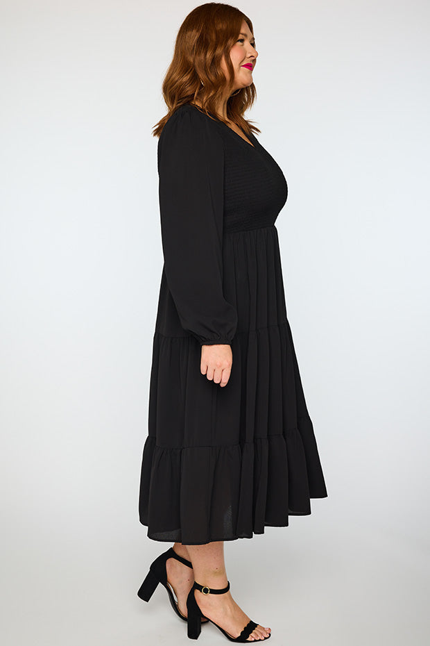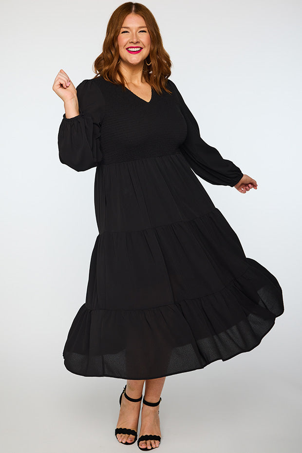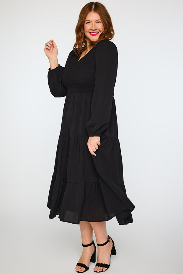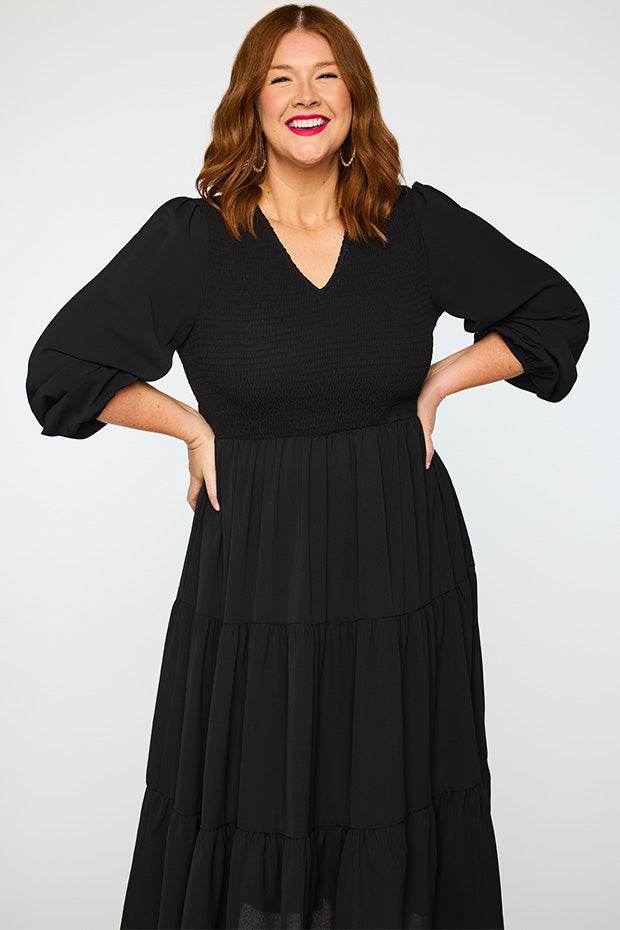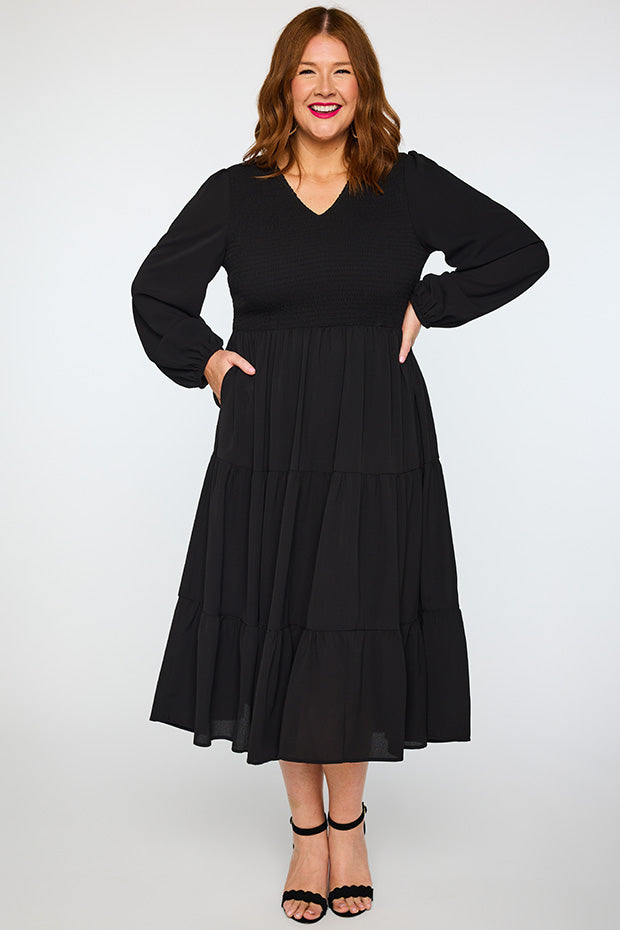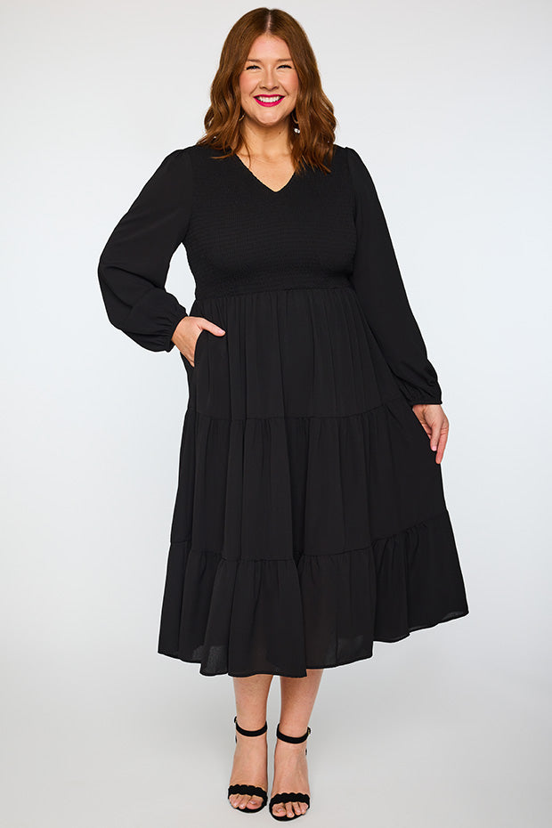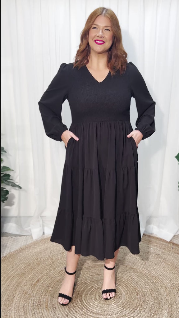 Featuring a fully shirred stretchy bodice, subtle v-neck & long relaxed sleeves with an elastic cuffBelow the waist the skirt falls very loosely, with bohemian tiers, and hidden pockets to complete the perfect midi dress.