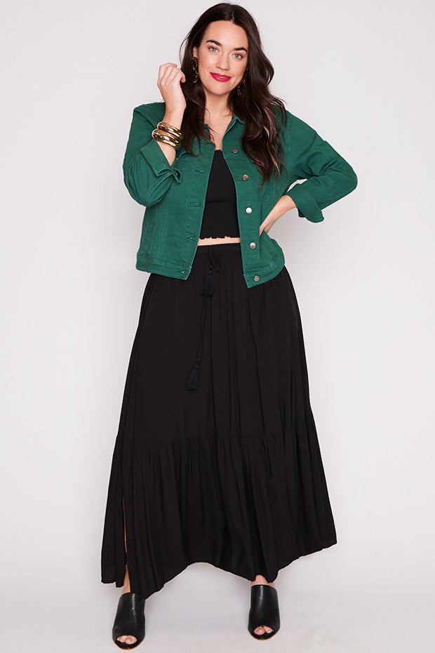 This standard fit denim-jacket has gun metal buttons, featuring Little Party Dress Stamping (yay!) on the front & cuffs. The stretchy cotton denim elastic fabric adds a luxurious vibe and makes it easy to roll the sleeves up and down. We love the pockets for hiding your phone, and striking a pose!