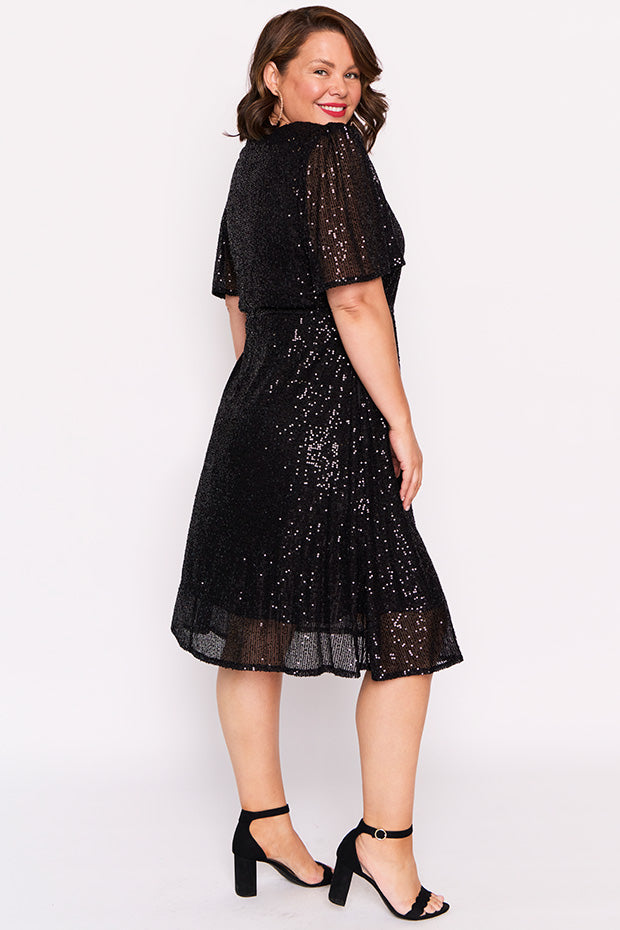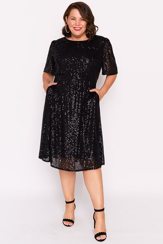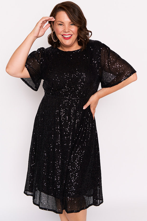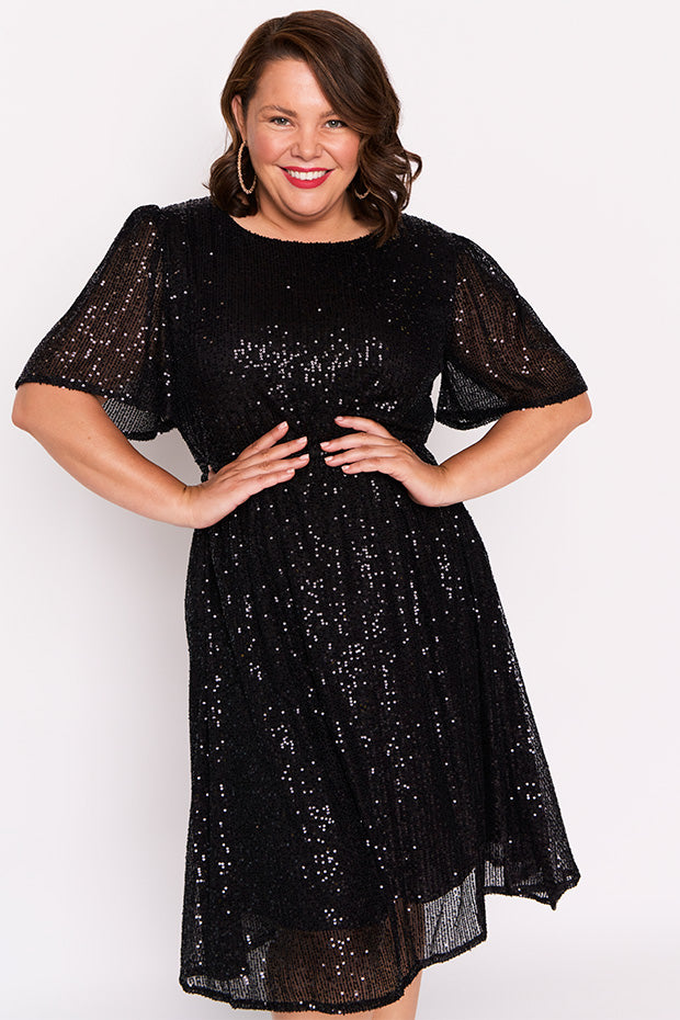 This all over sequined dress features short loose open sleeves and round neckline. We love the elasticated waist to guarantee you get a comfy fit, with a loose flowing skirt that is ready for a twirl.