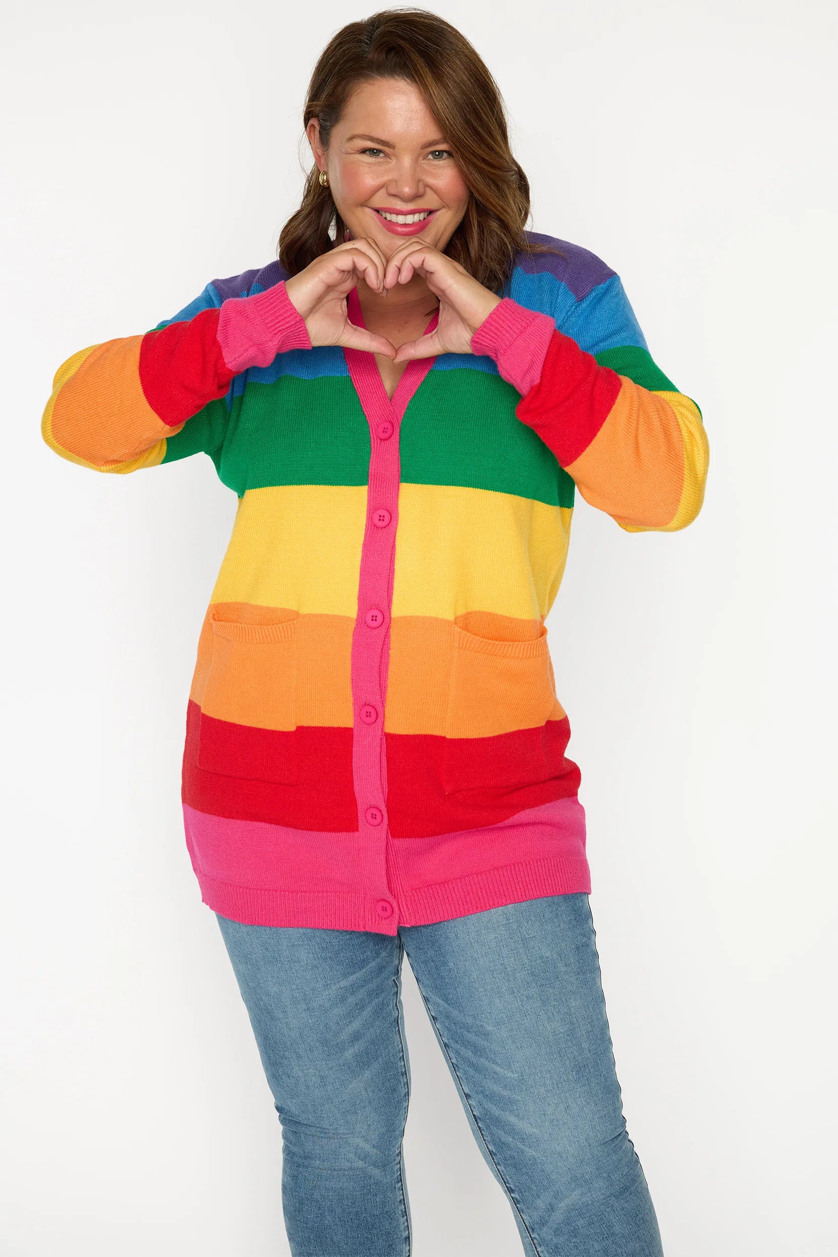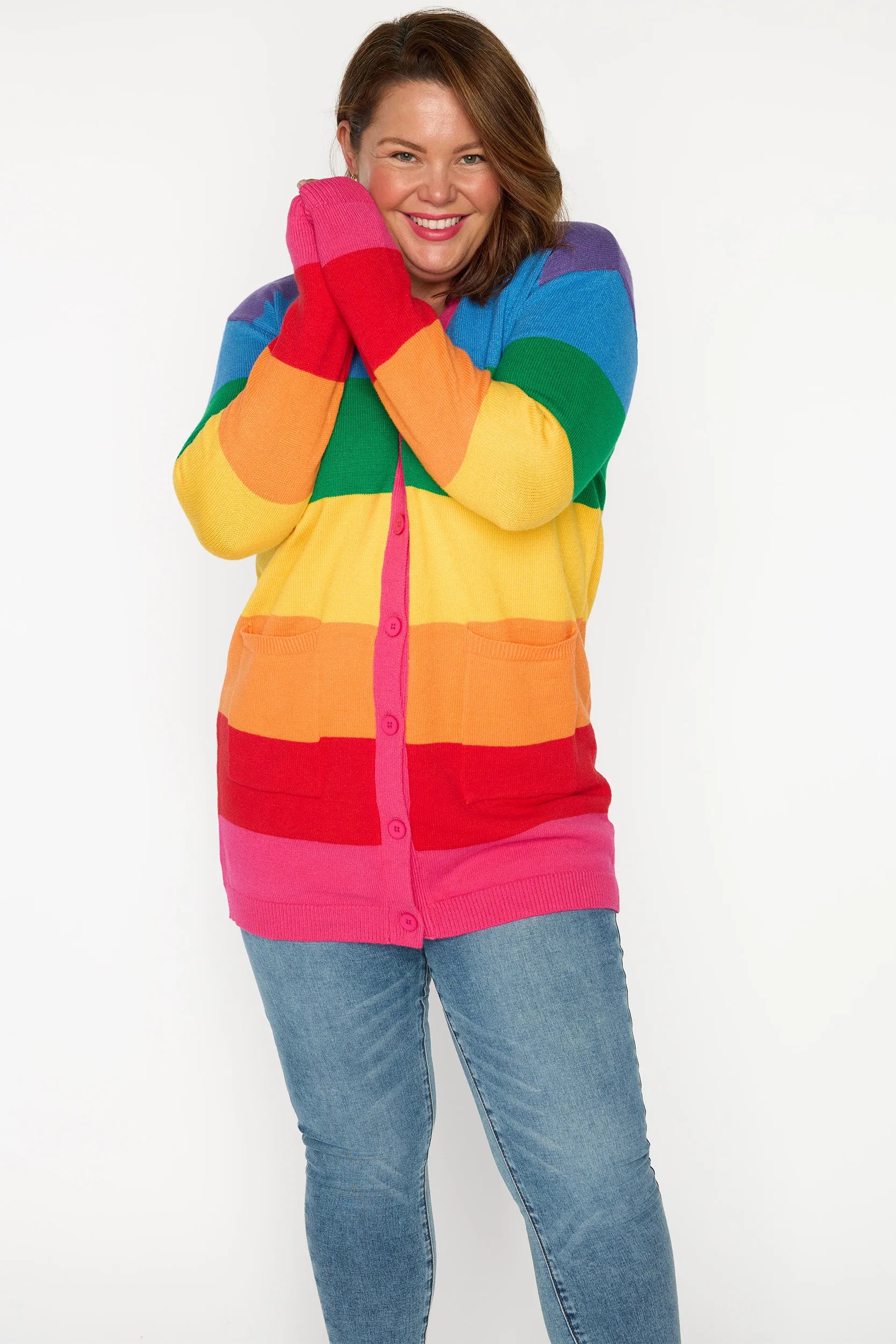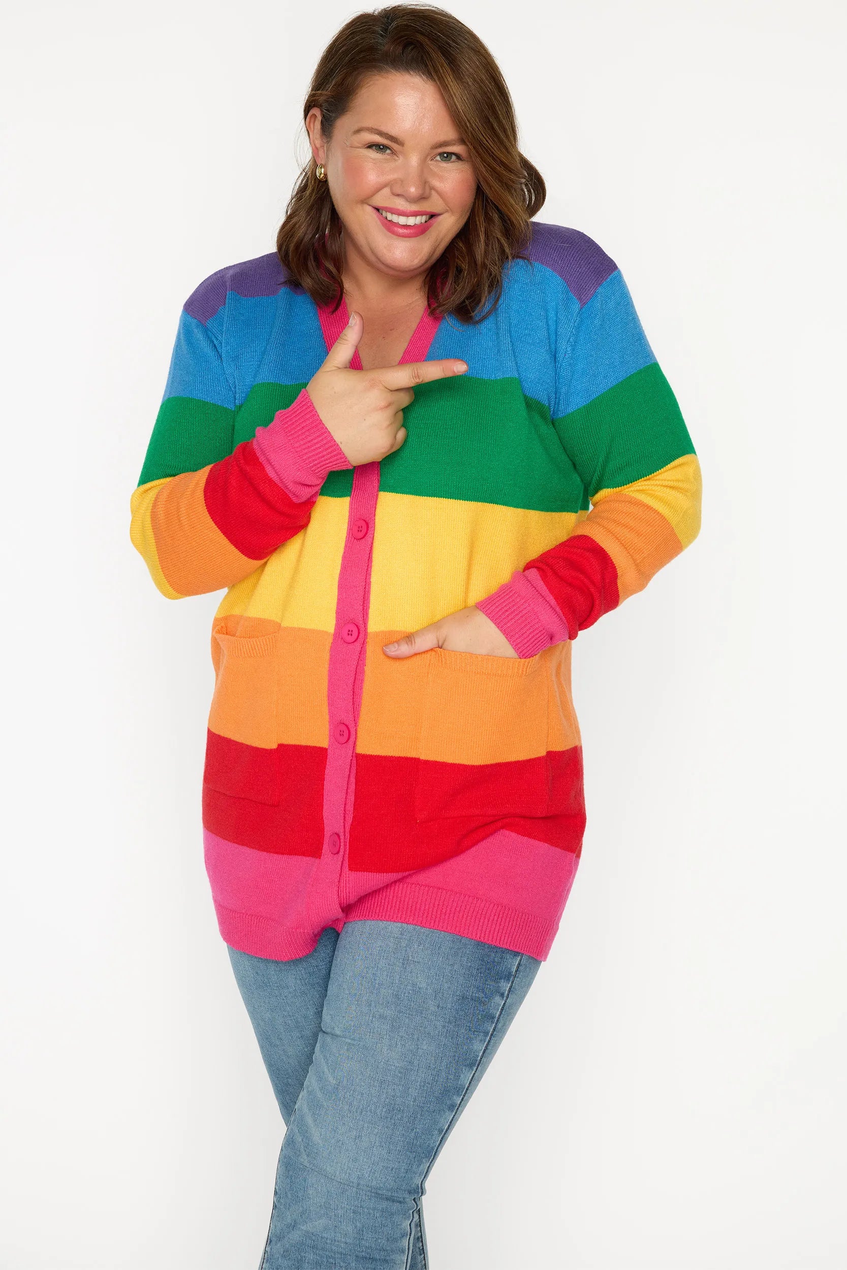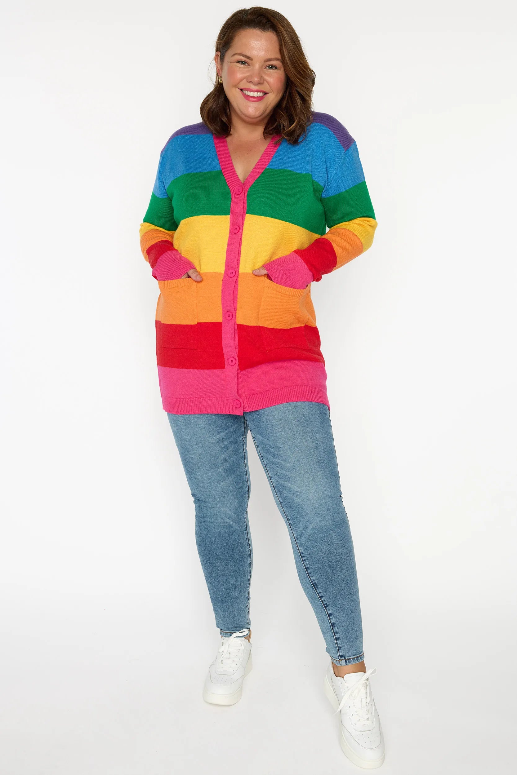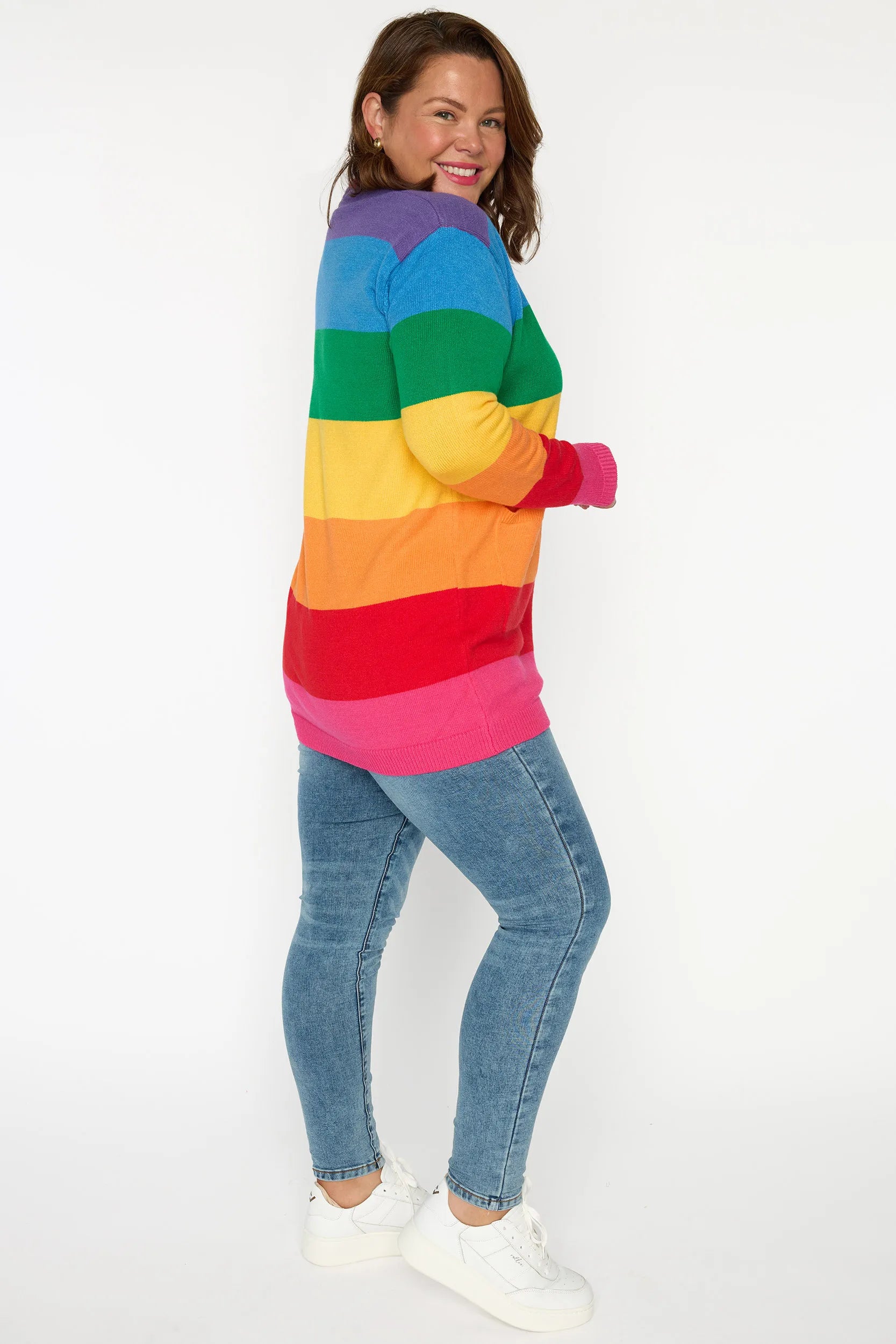 Brighten up your wardrobe in our vibrant Vivid Rainbow Stripe Cardigan. It's Fun Print adds a cheerful pop of colour to any outfit. Perfect as a standout Teacher Outfit, this relaxed-fit jumper pairs effortlessly with jeans, skirts, or leggings for a comfortable yet stylish everyday look.