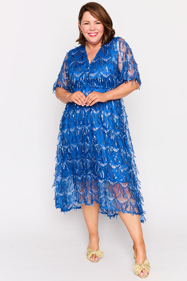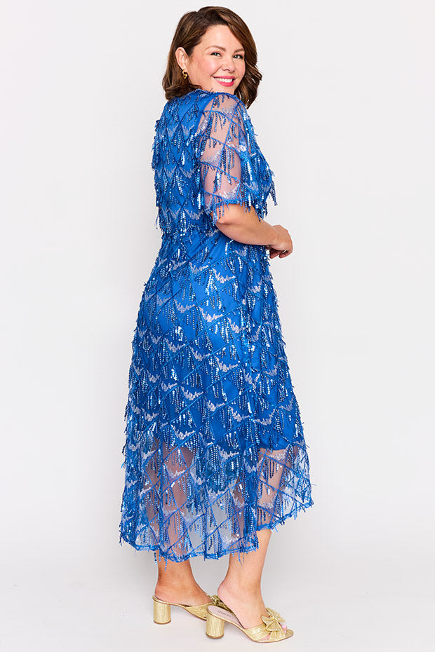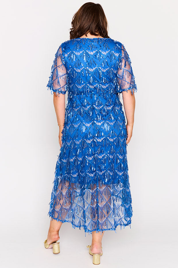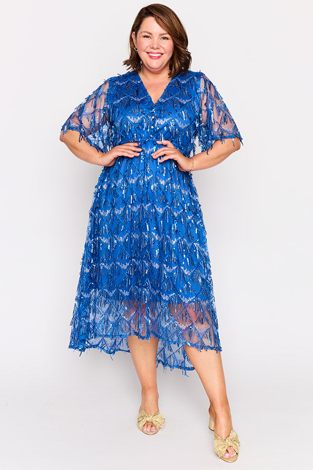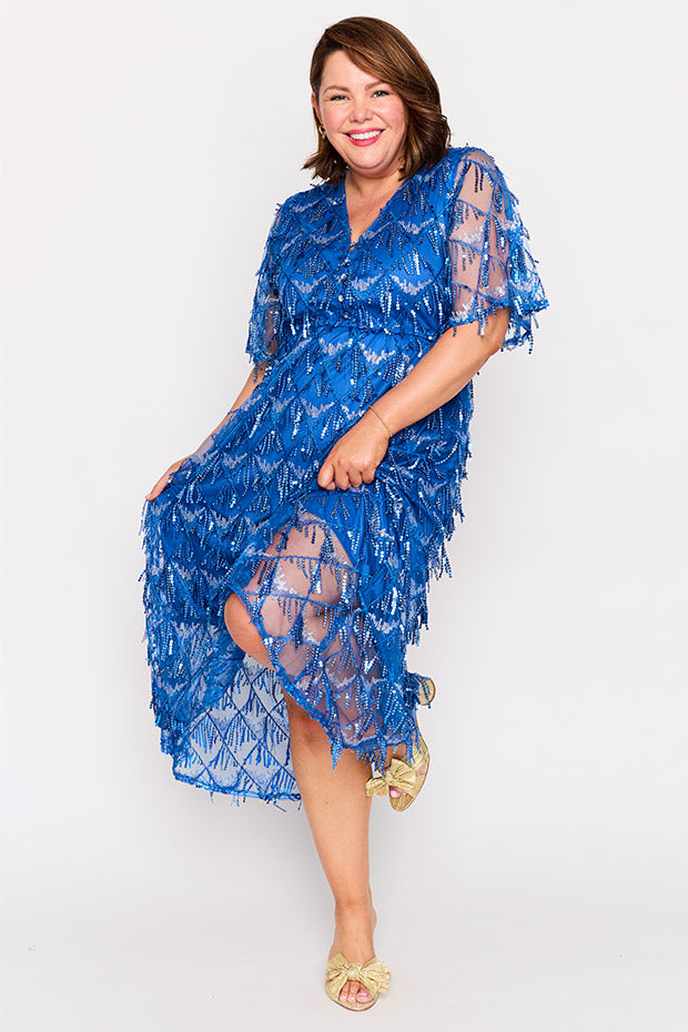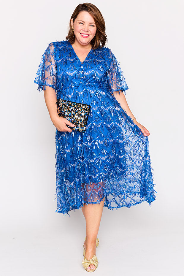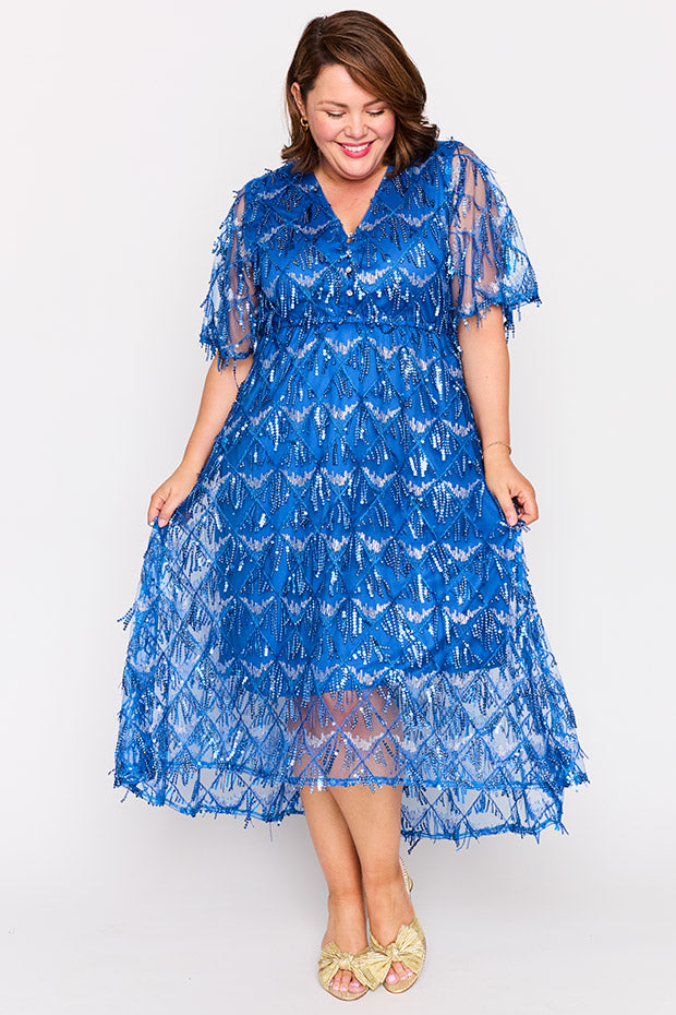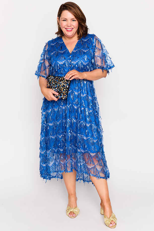 Shine bright in this Wonderful Party Dress adorned with shimmering cobalt sequins. Designed to catch the light from every angle, it’s perfect for parties, special events, or any occasion where you’re ready to sparkle and stand out.